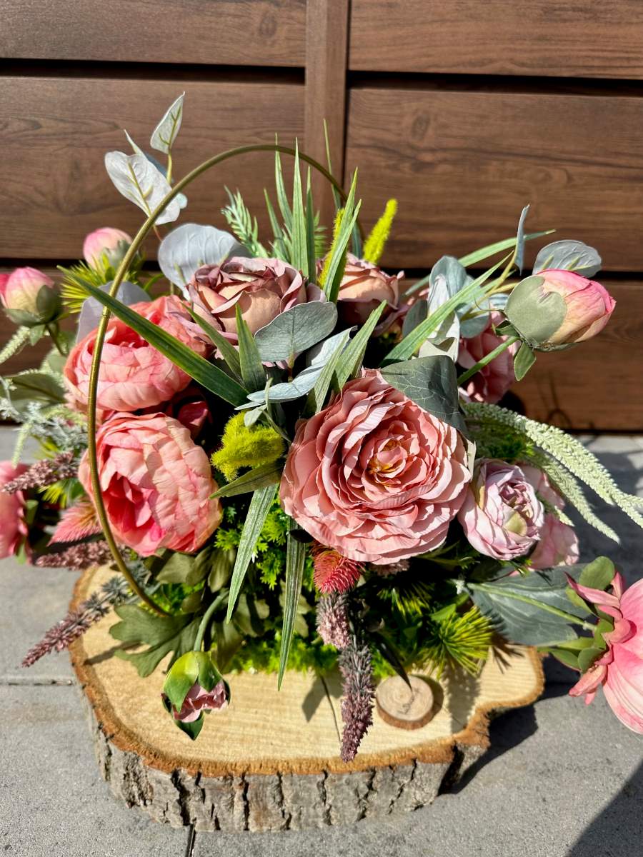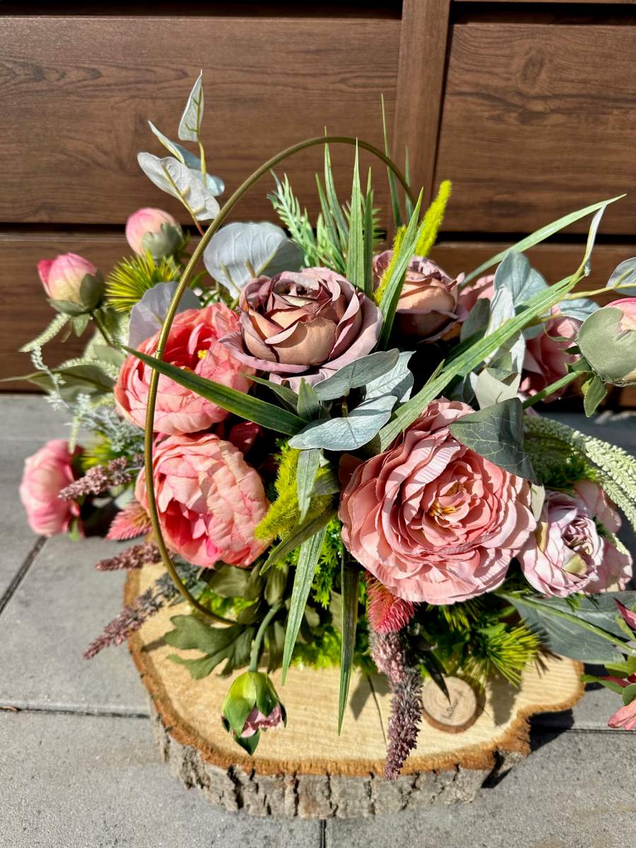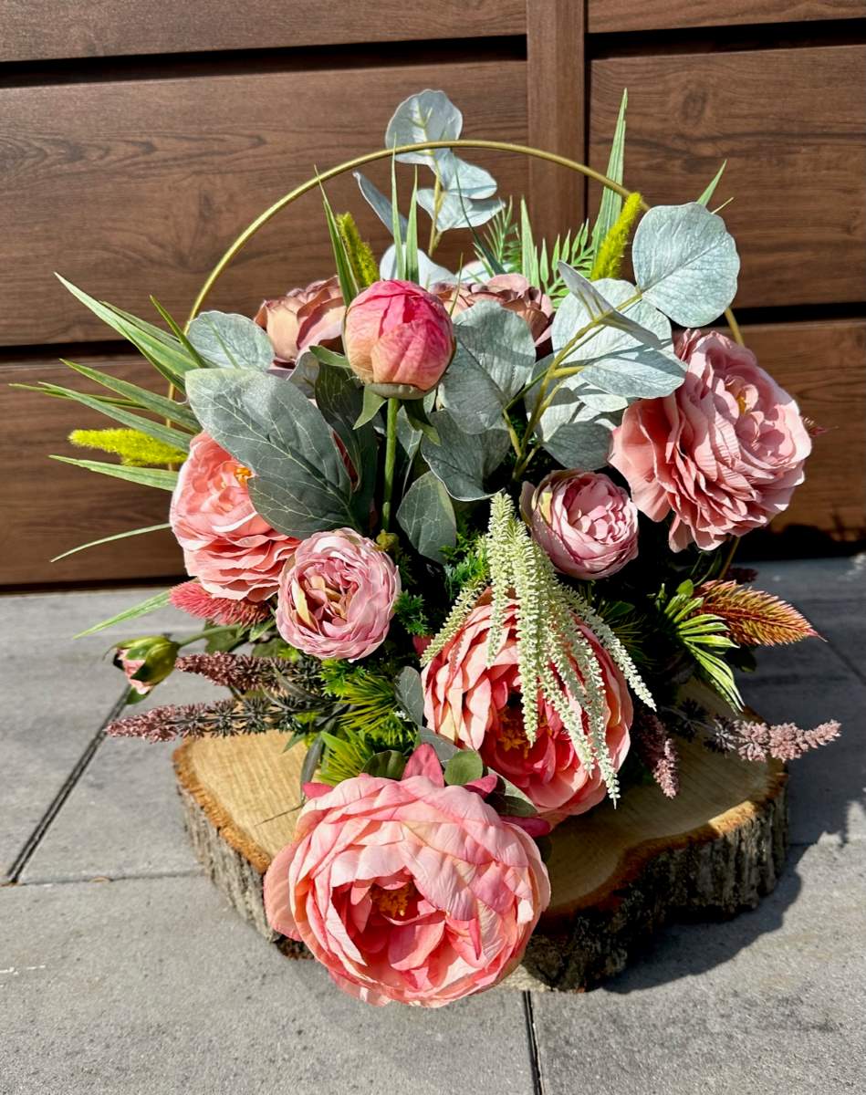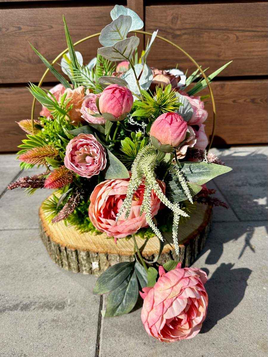 Efektowna dekoracja wykonana na grubym plastrze drewna w złotym metalowym okręgu . Kompozycja ozdobiona kwiatami i zielonymi gałązkami.