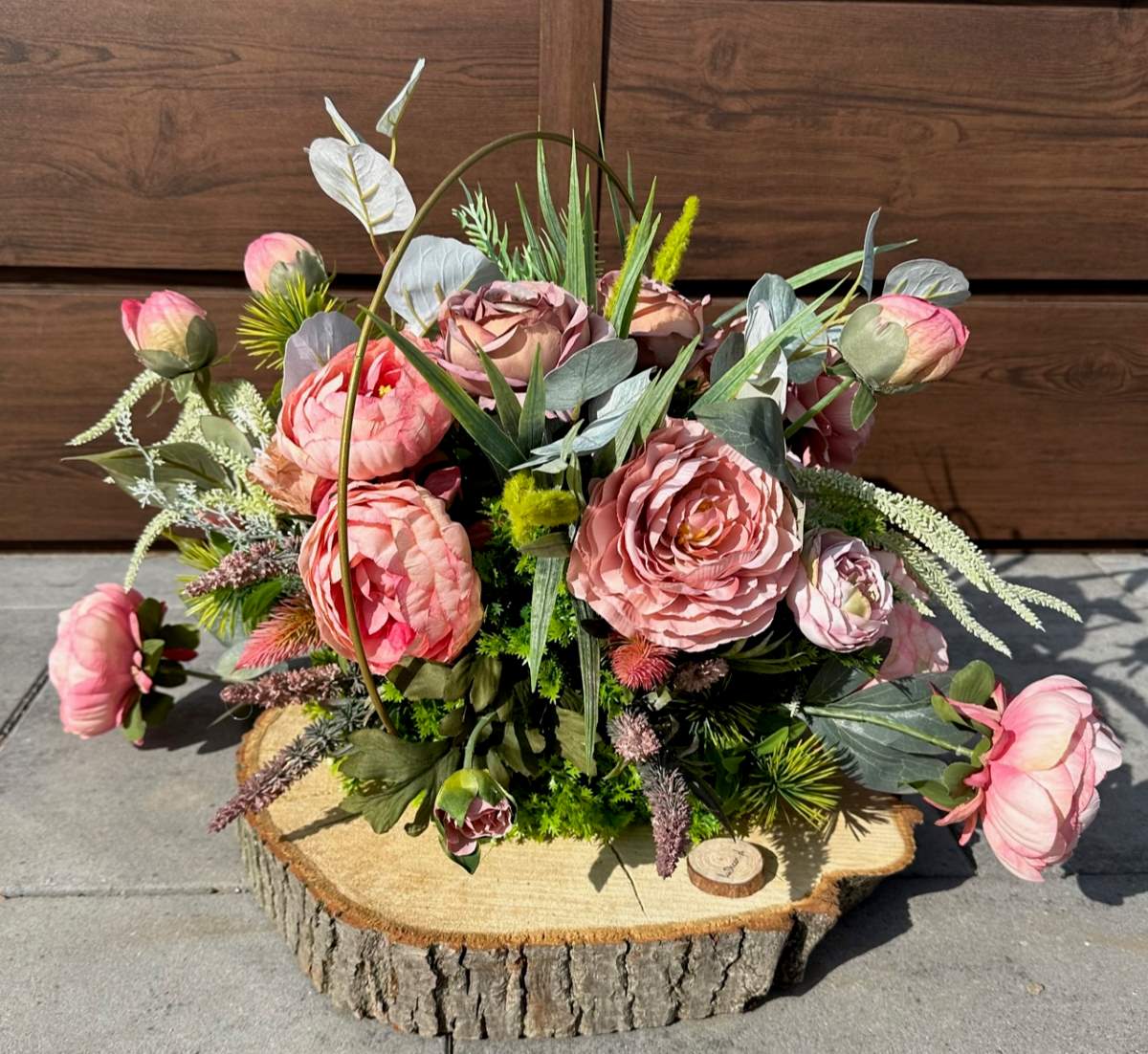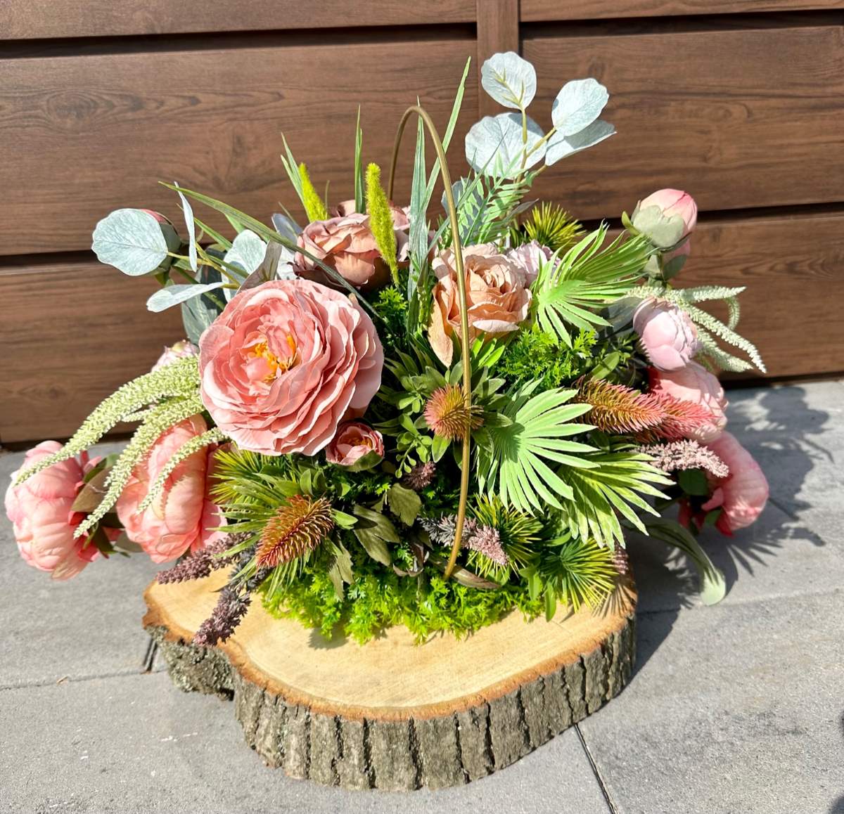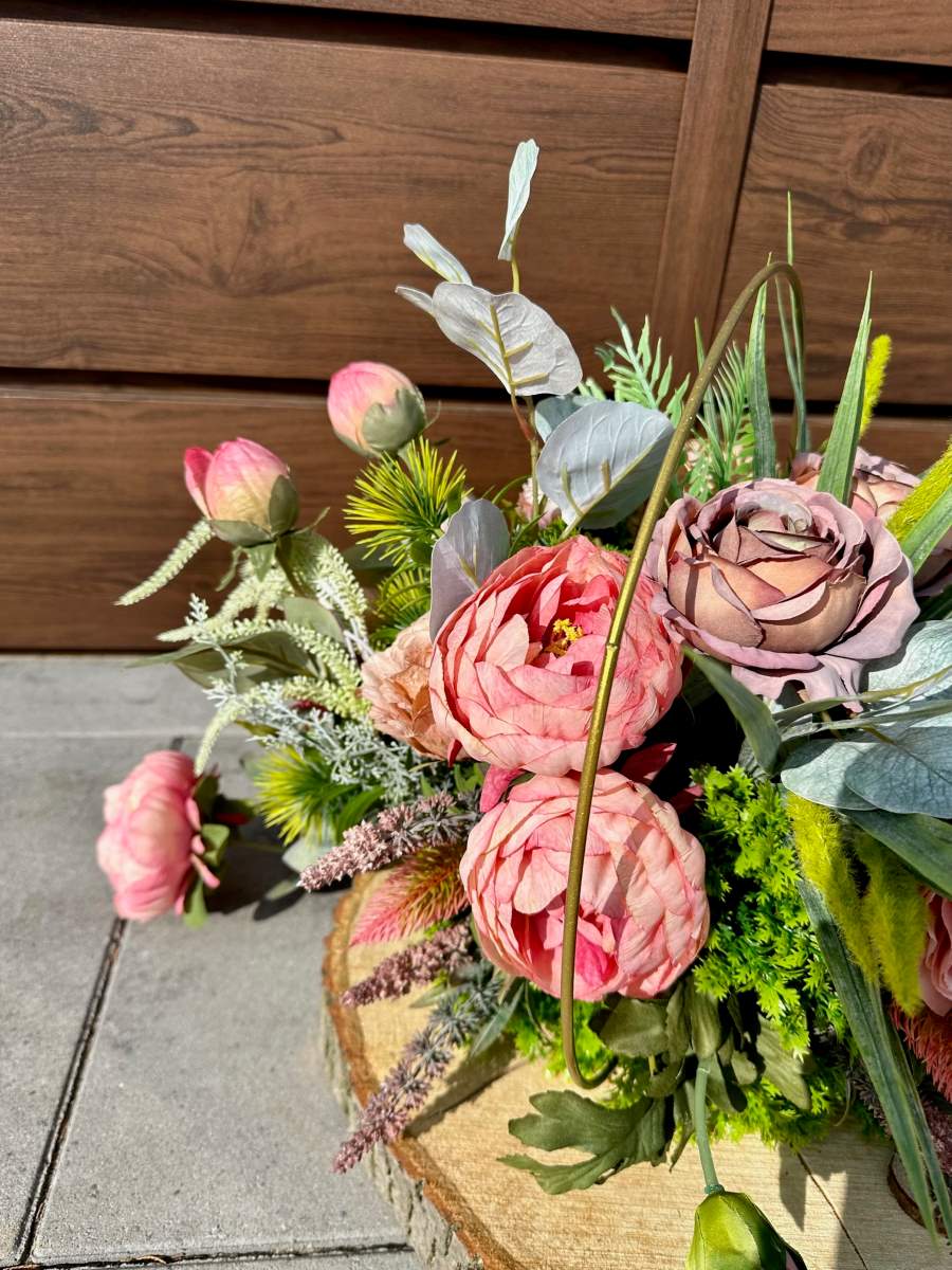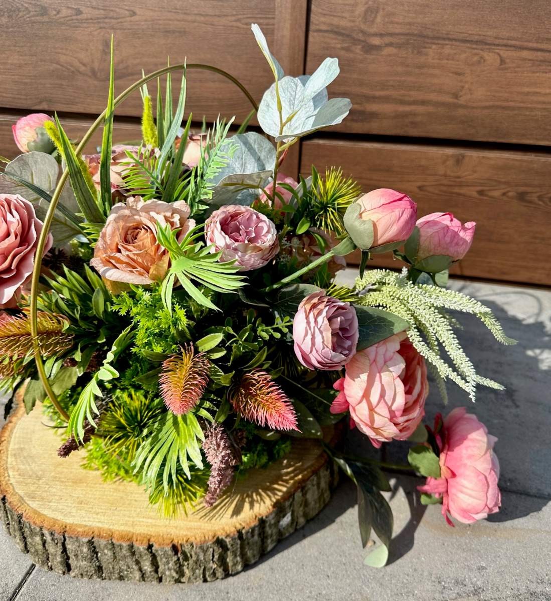 Efektowna dekoracja wykonana na grubym plastrze drewna w złotym metalowym okręgu . Kompozycja ozdobiona kwiatami i zielonymi gałązkami.