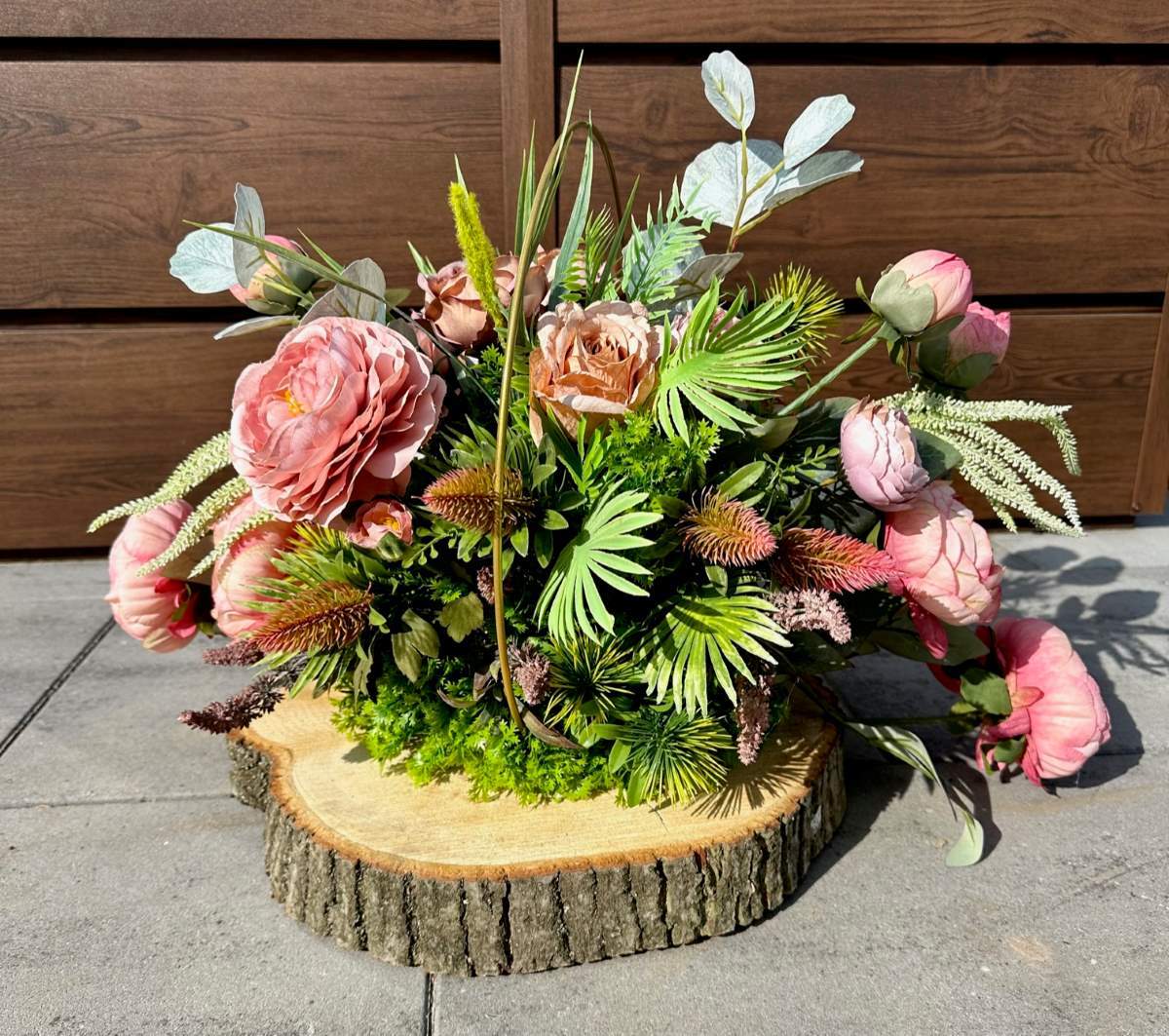 Artificial flowers used in the composition perfectly harmonize with the other elements of decoration.