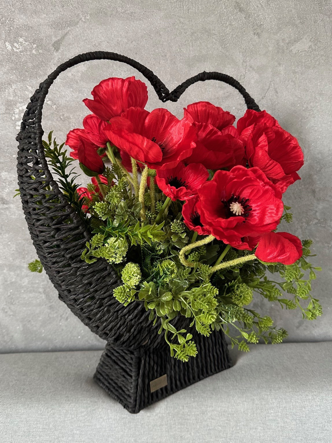 Kompozycja kwiatowa w eleganckim koszu w kształcie serca to wyjątkowa dekoracja na pomnik. Delikatne ,soczyście czerwone maki i anemony symbolizują pamięć, miłość oraz szacunek dla bliskich, którzy odeszli. Ta stylowa dekoracja nagrobna doskonale sprawdzi się jako ozdoba na cmentarz – zarówno na co dzień, jak i podczas szczególnych okazji, takich jak Wszystkich Świętych czy rocznice.