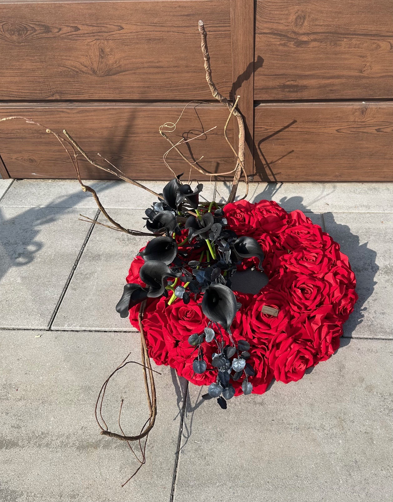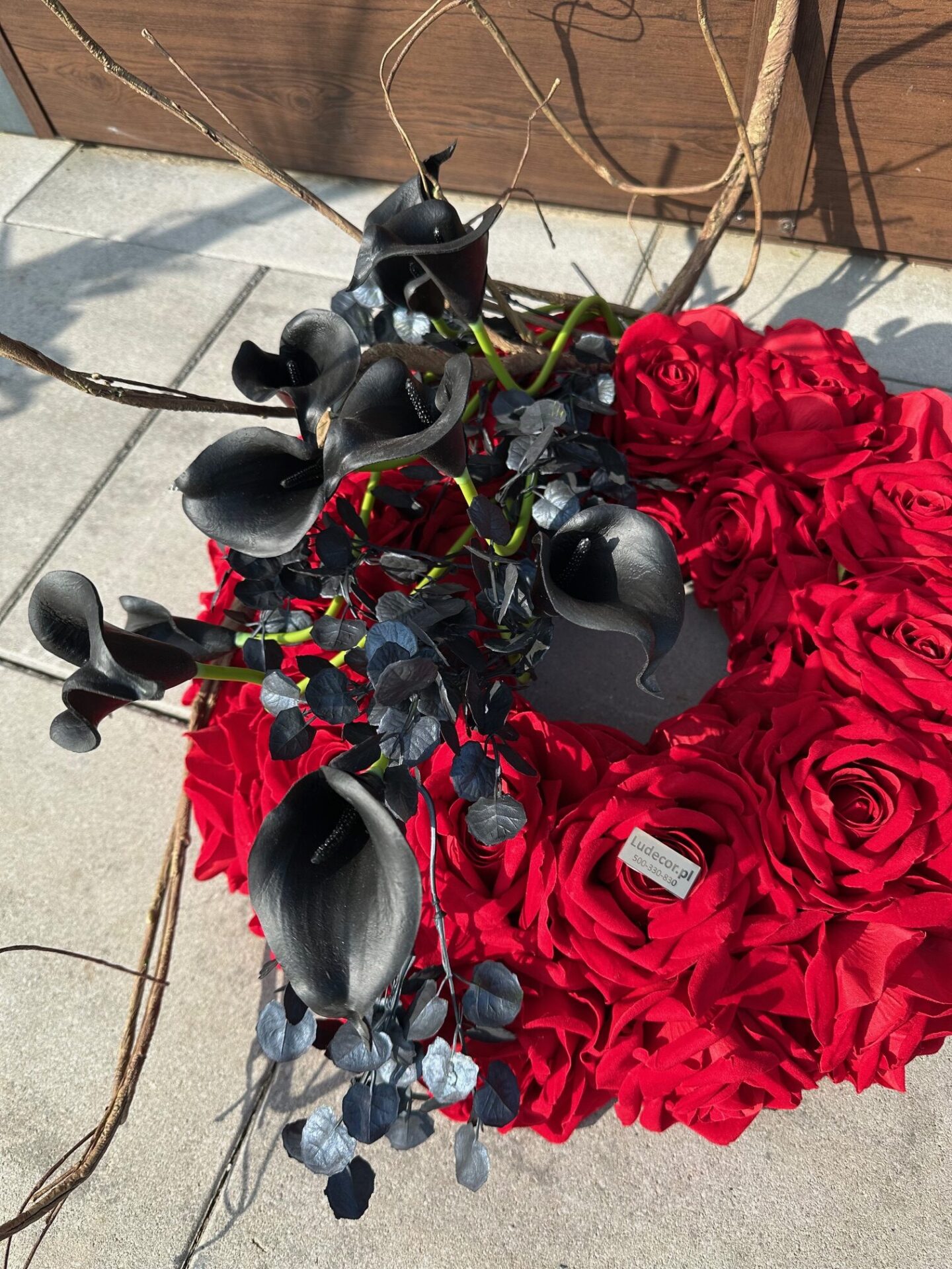 Wieniec nagrobny o asymetrycznej, eleganckiej formie, gęsto i starannie wypełniony czerwonymi różami oraz czarną kallą symbolizuje miłość, pamięć i szacunek. Kwiaty ułożone są ciasno, tworząc pełną, harmonijną kompozycję o intensywnej barwie i wyrazistym charakterze. Wieniec emanuje powagą i spokojem, stanowiąc piękny i godny wyraz hołdu oraz nieprzemijającej pamięci o bliskiej osobie.