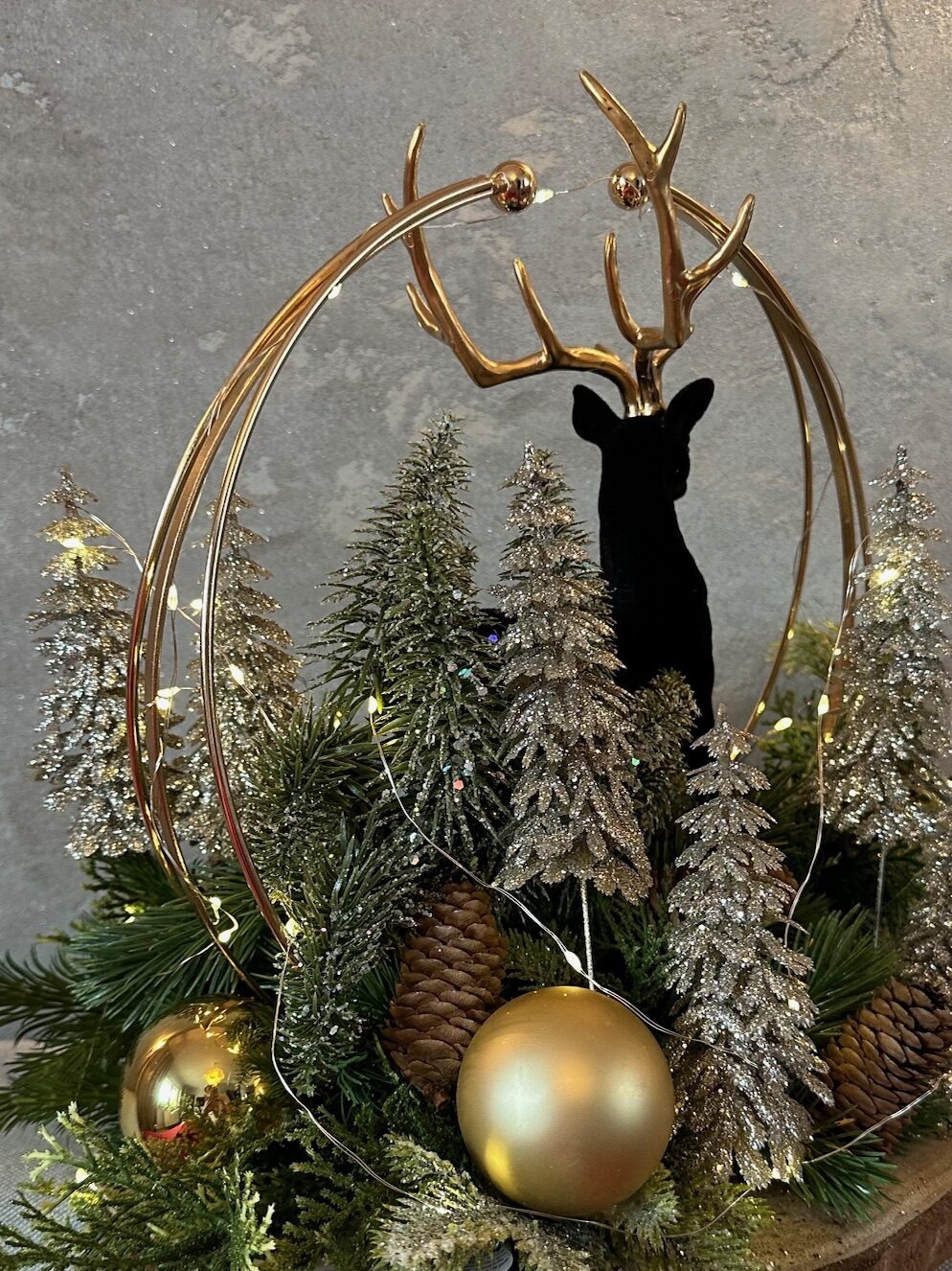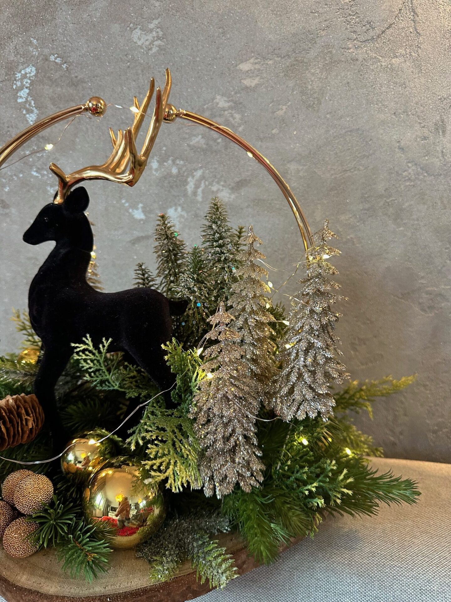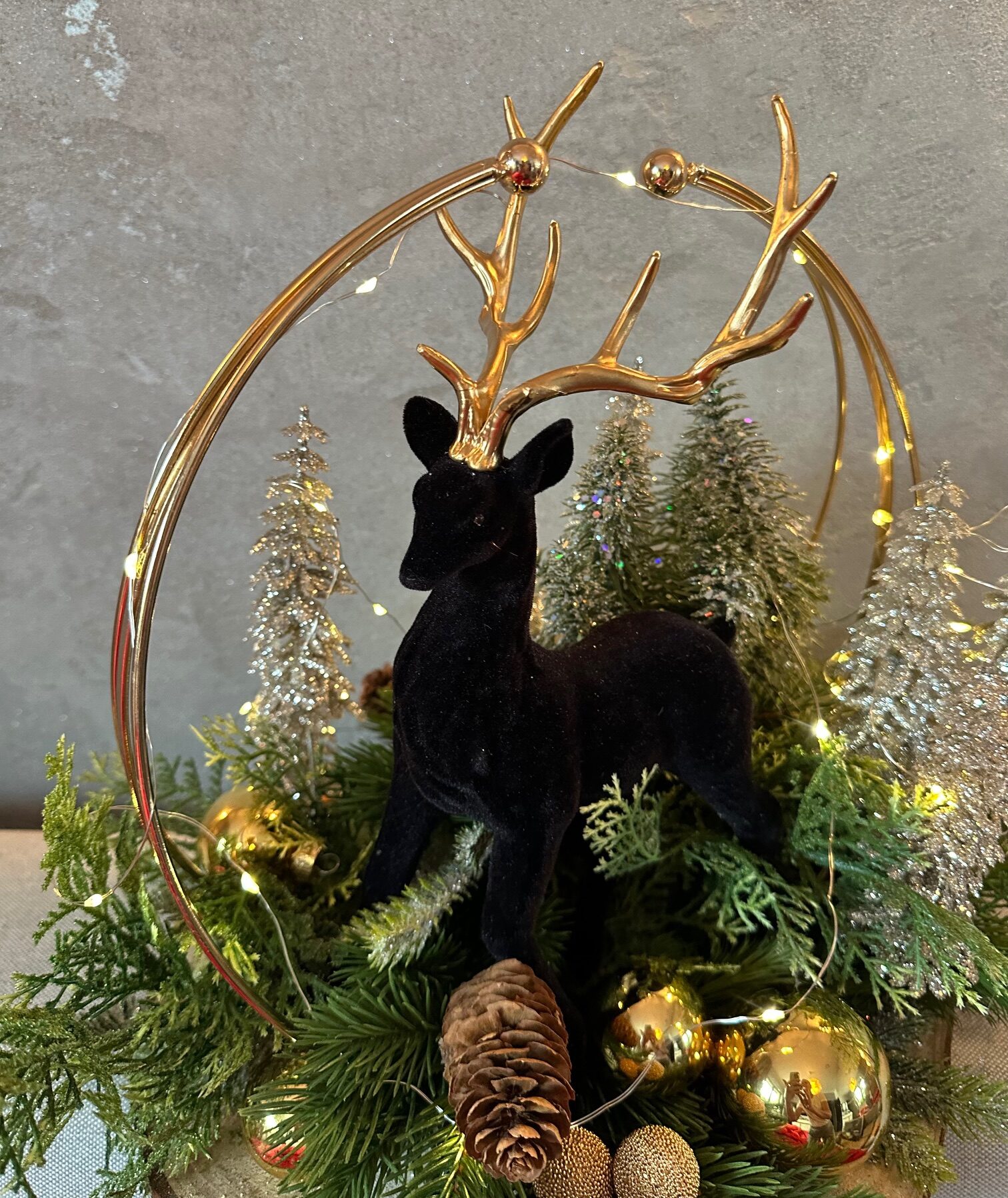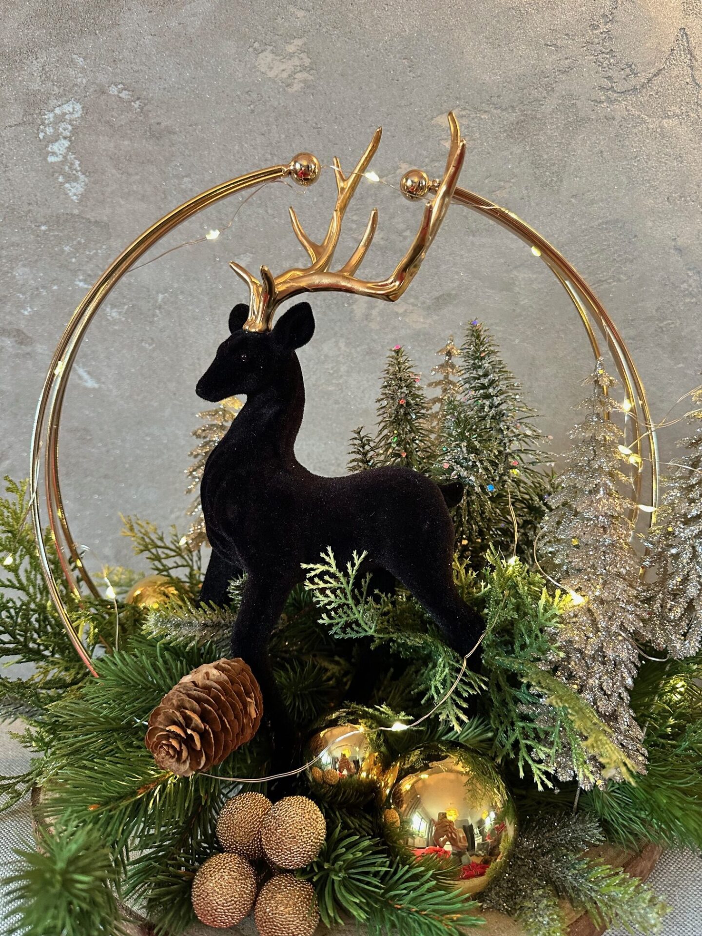 Elegancki stroik bożonarodzeniowy, którego centralnym punktem jest czarny welurowy renifer , który przyciąga wzrok swoją szlachetną formą i nowoczesnym charakterem. Figurkę otacza delikatna, złota obręcz, dodająca całości lekkości oraz subtelnego blasku.