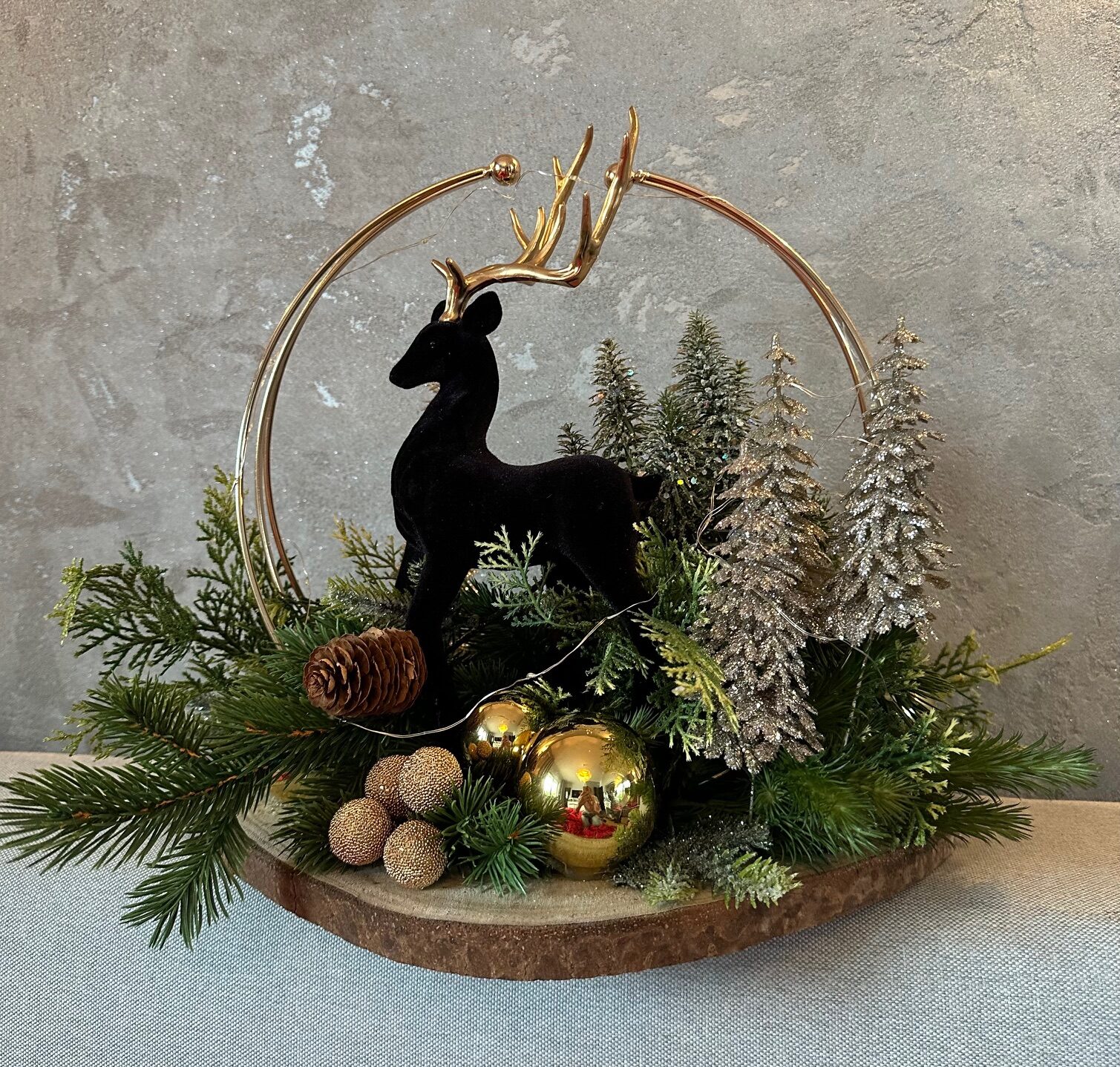 Kompozycję osadzono na naturalnym plastrze drewna, który kontrastuje z głęboką czernią renifera i metalicznym złotem obręczy. Stroik zachwyca świąteczną elegancją, stanowiąc idealną dekorację stołu, komody czy świątecznego kącika.