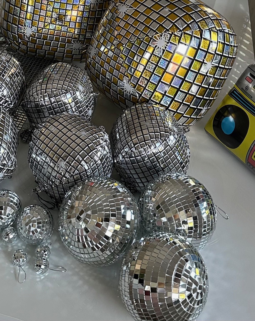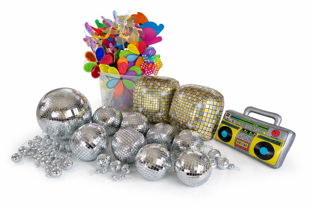 W skład zestawu wchodzi duża kula disco o średnicy 30 cm, a także mniejsze kule disco w różnych rozmiarach, które pięknie odbijają światło i tworzą niepowtarzalny klimat. Całość uzupełniają balony imitujące kule disco oraz balony w kształcie gitar, dodające dekoracji muzycznego charakteru.