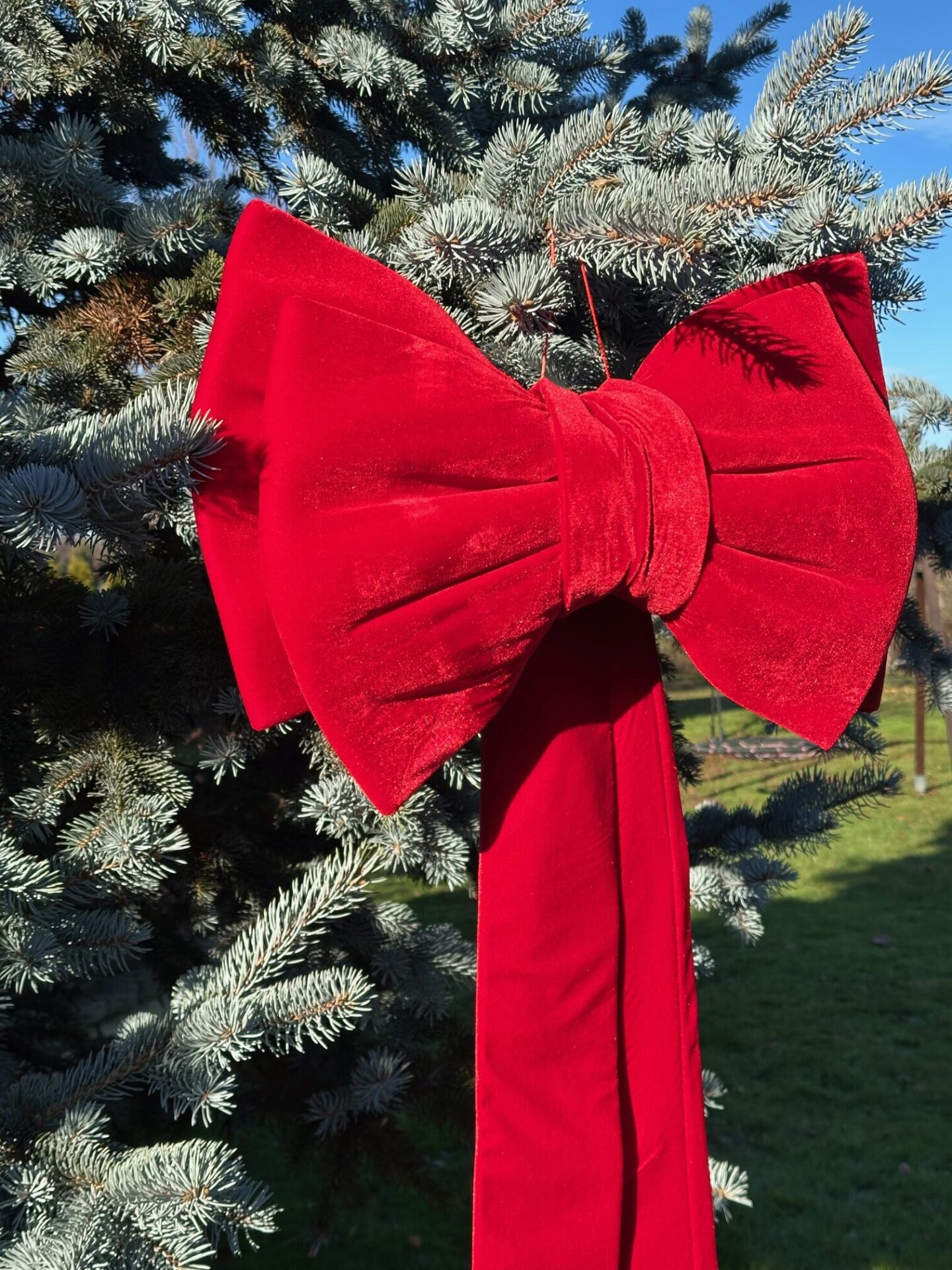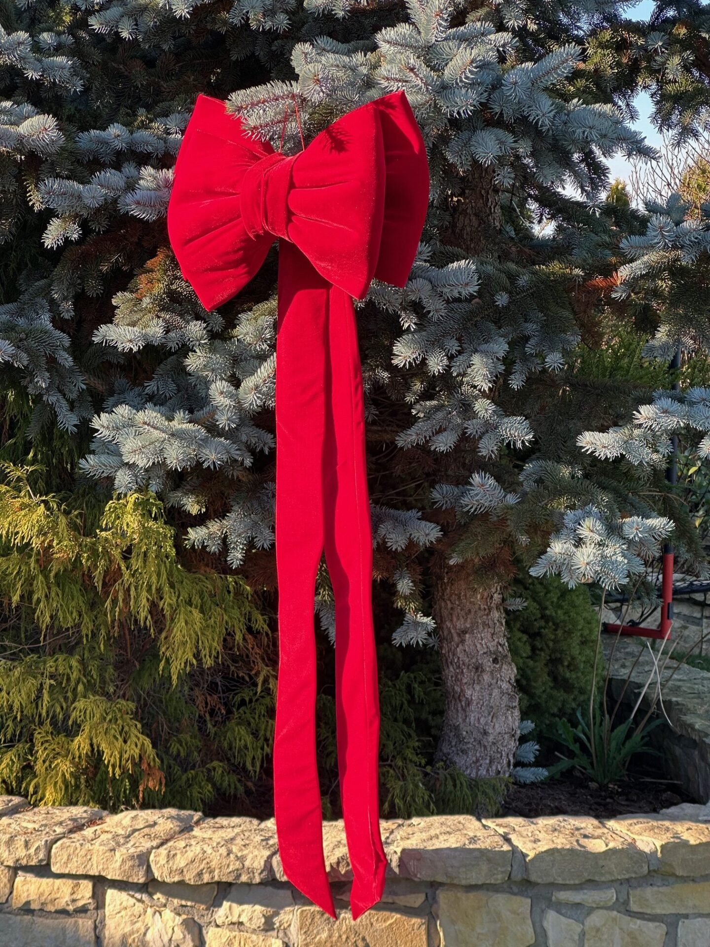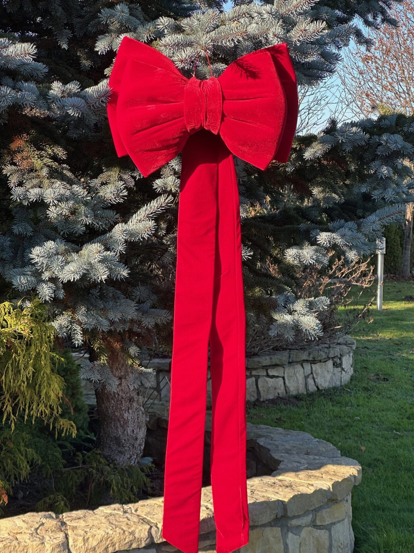 Duża czerwona welurowa kokarda to elegancka i ponadczasowa ozdoba, która wprowadza do wnętrza ciepły, świąteczny klimat. Wykonana z miękkiego, przyjemnego w dotyku weluru, przyciąga wzrok intensywną czerwienią oraz piękną, głęboką fakturą materiału.