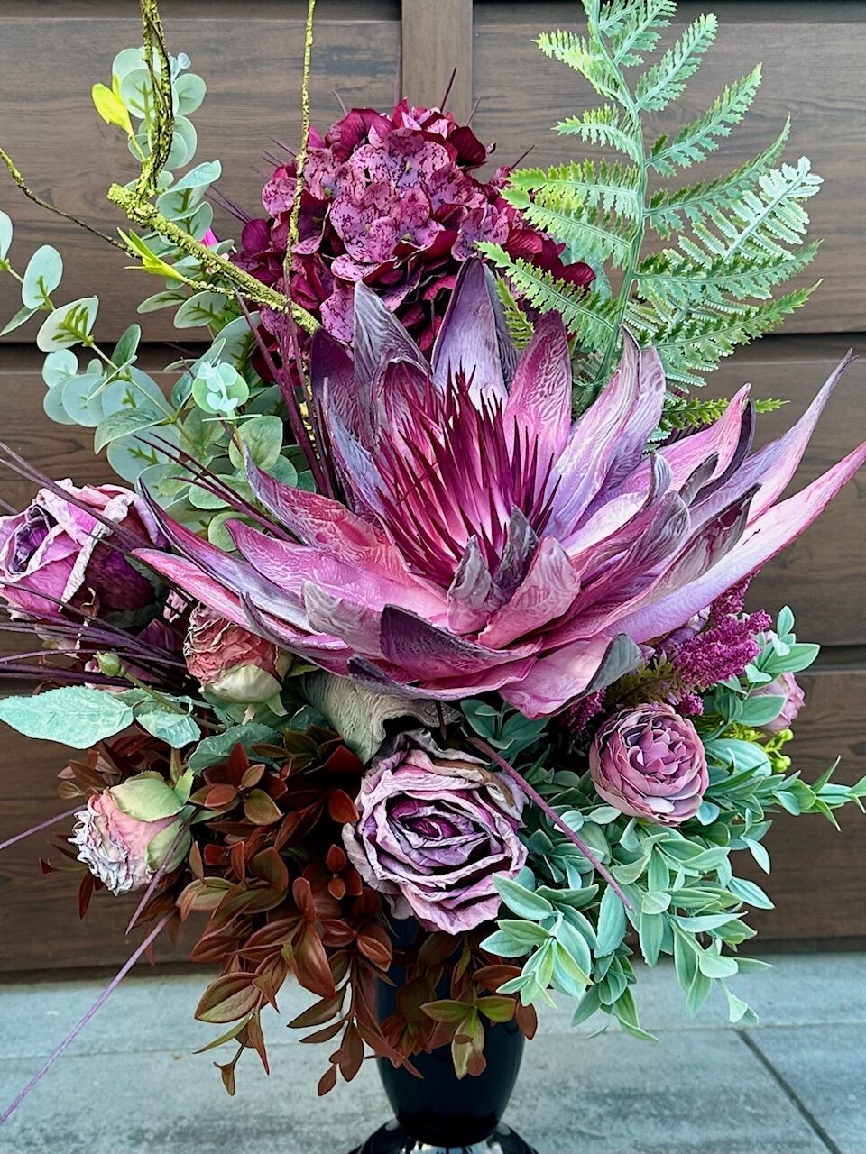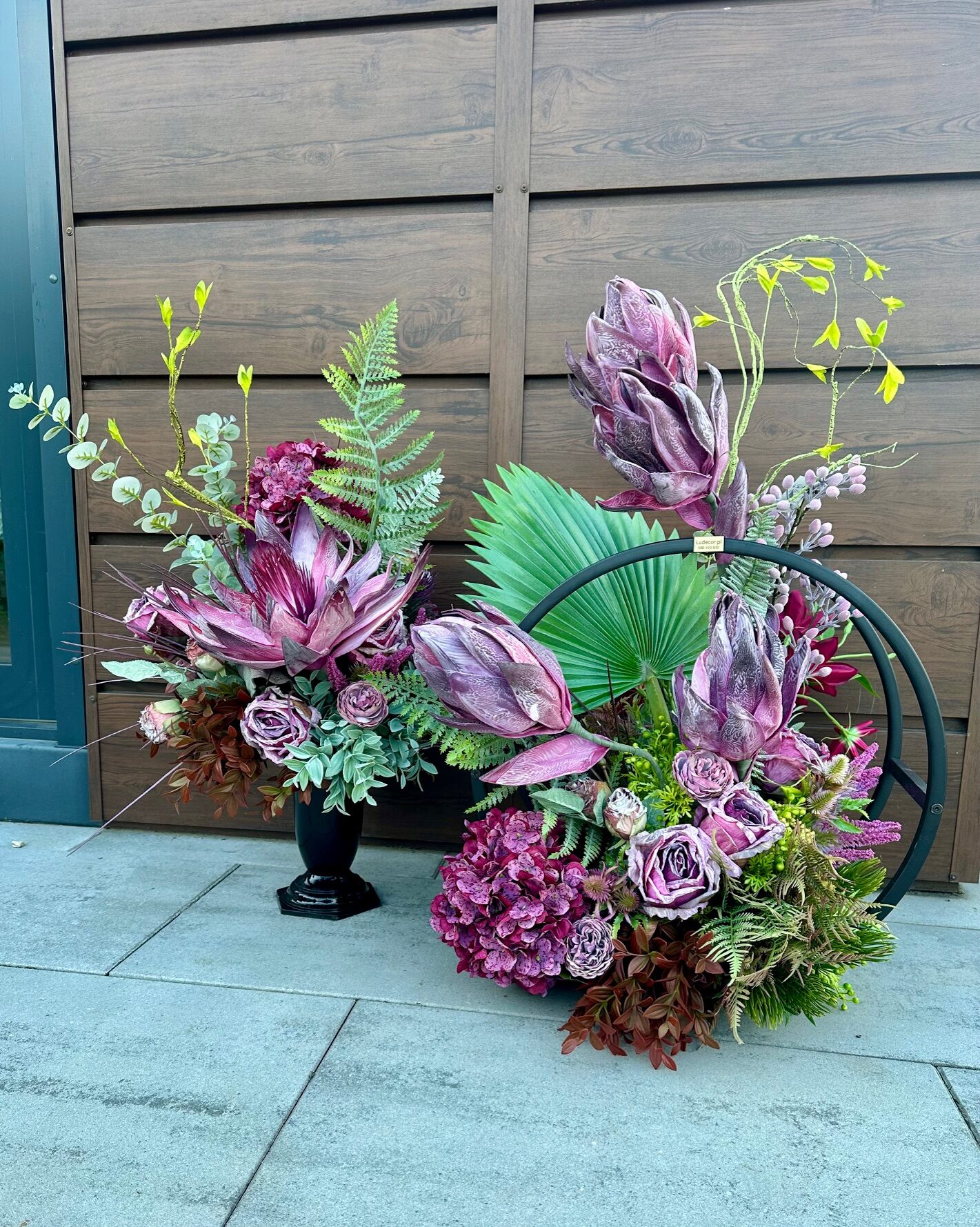 Komplet dekoracji nagrobnych łączący w sobie nowoczesność i subtelną estetykę, tworząc harmonijną całość, która podkreśla szacunek i zadumę. Asymetryczna dekoracja nagrobna wykonana w metalowych okręgach wypełnionych kwiatami i roślinami. Użyte w kompozycji kwiaty są sztuczne.