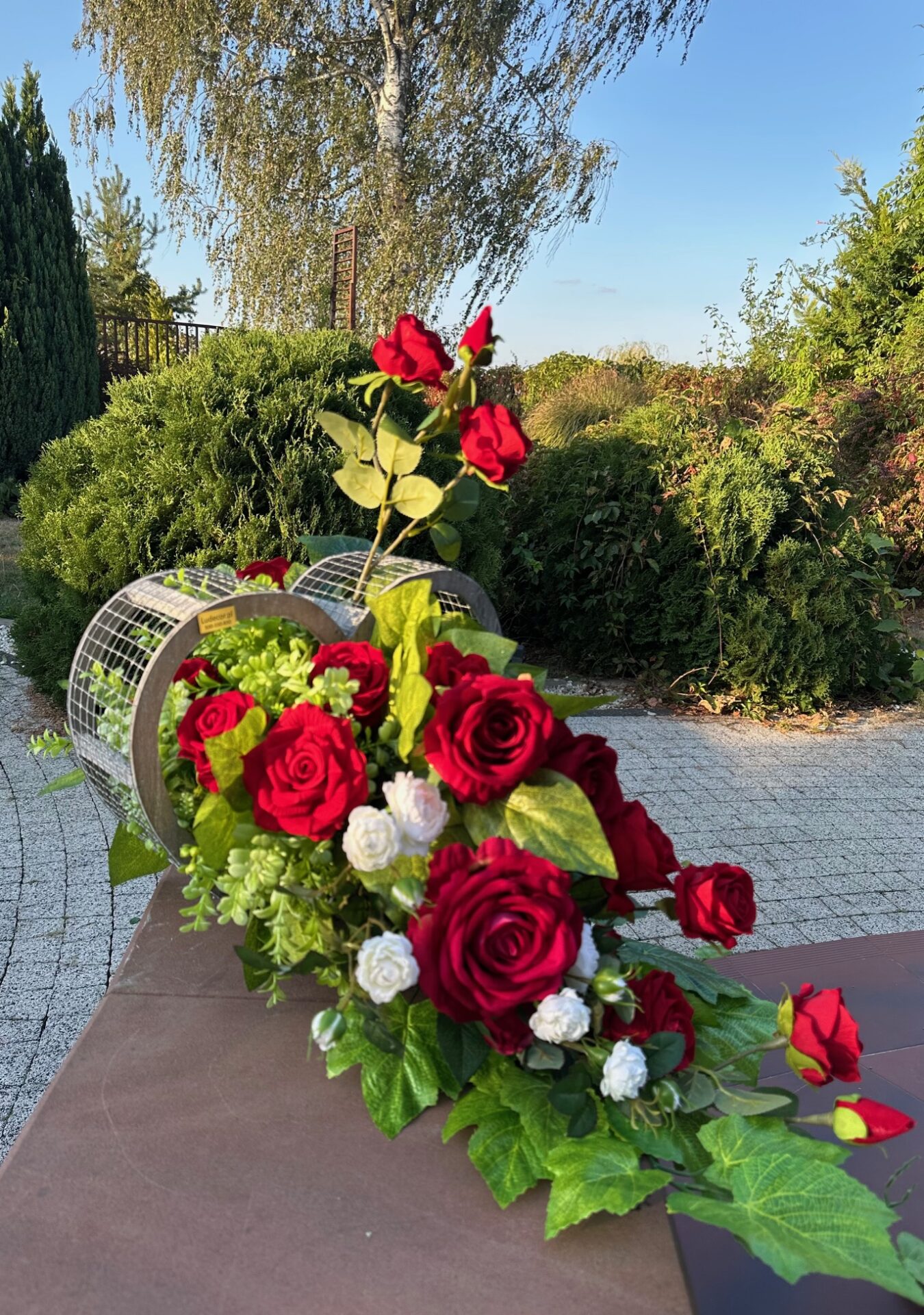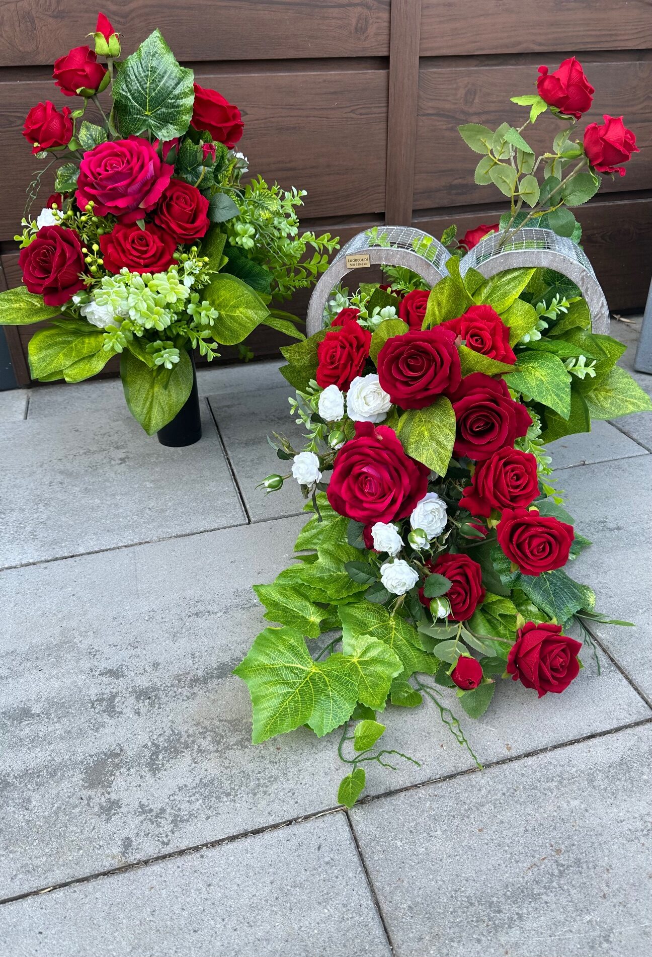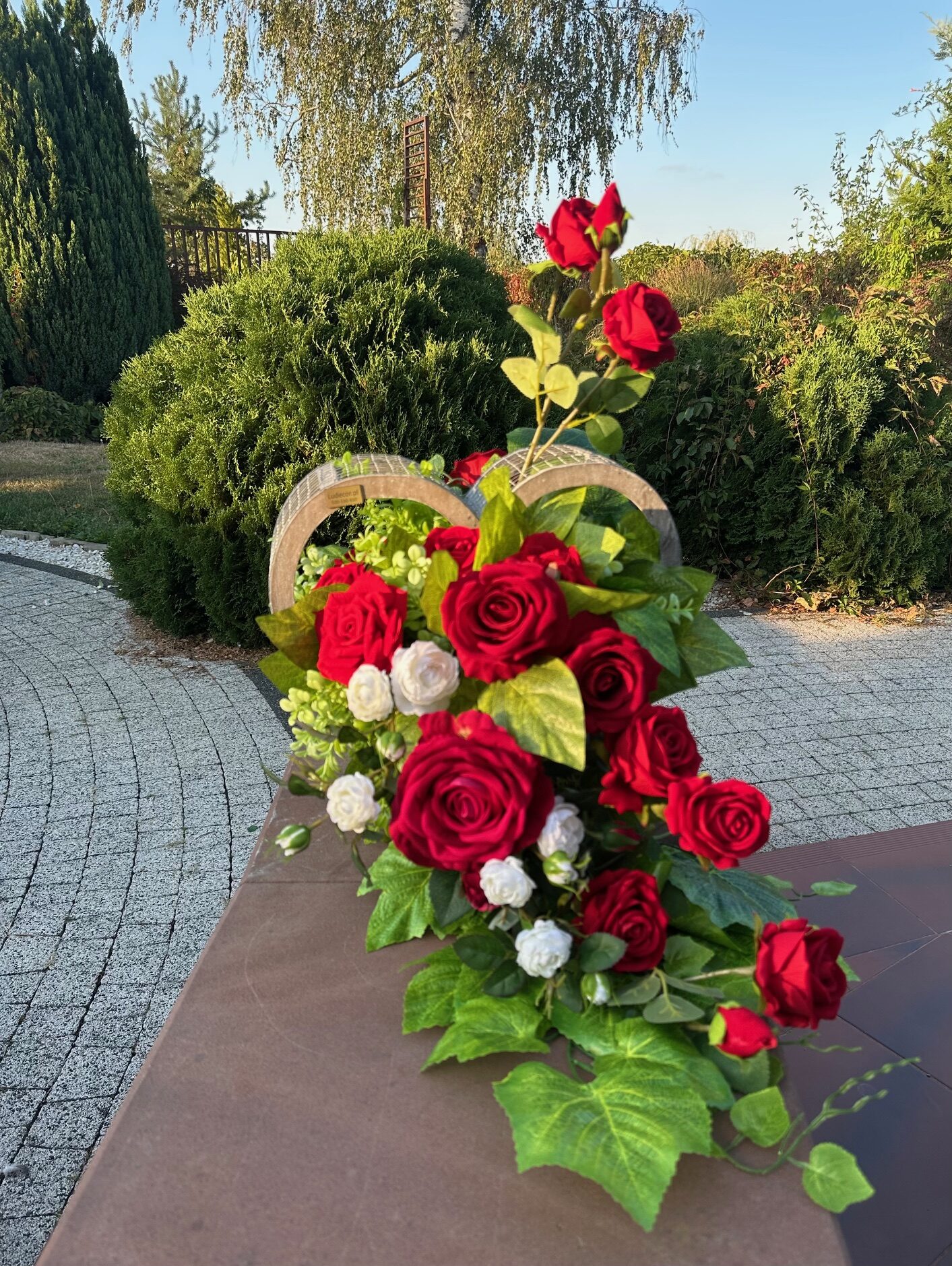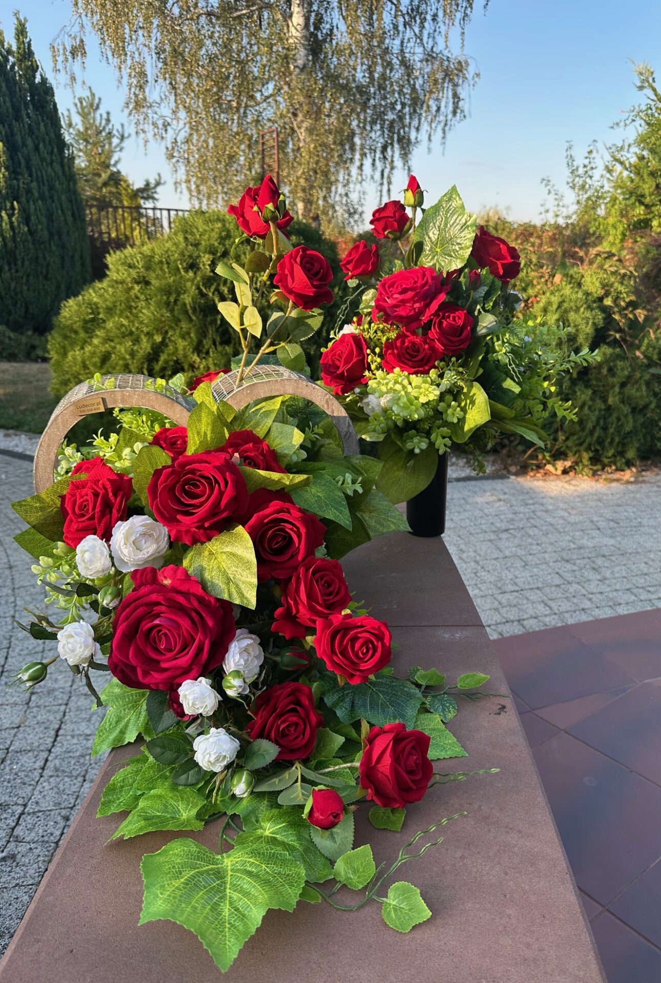 Dekoracja nagrobna w kształcie serca z czerwonymi i białymi różami to wyjątkowa i elegancka kompozycja kwiatowa, symbolizująca miłość , pamięć i głębokie uczucie wobec osoby zmarłej. Serce wypełnione kwiatami podkreśla szlachetność i ponadczasowy charakter tego gestu. Dodatki w postaci zieleni dekoracyjnej nadają całości harmonii i elegancji. Zarówno bukiet jak i wiązanka są obciążone, gotowe do postawienia na pomniku.