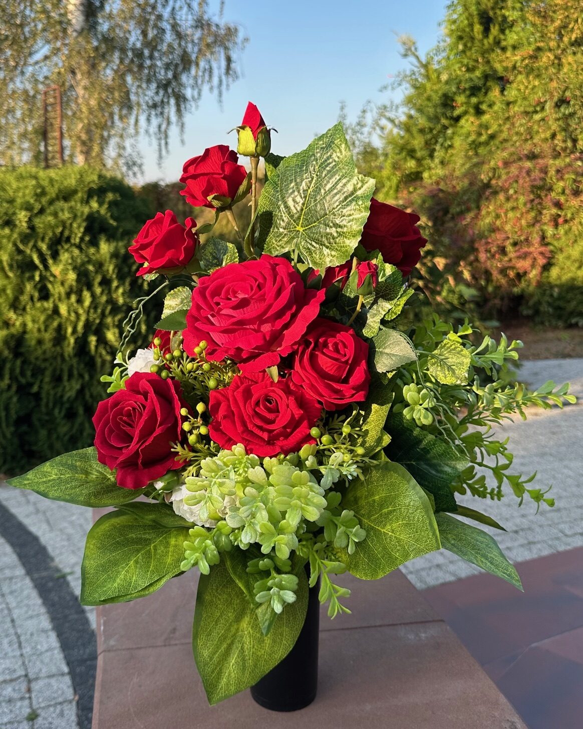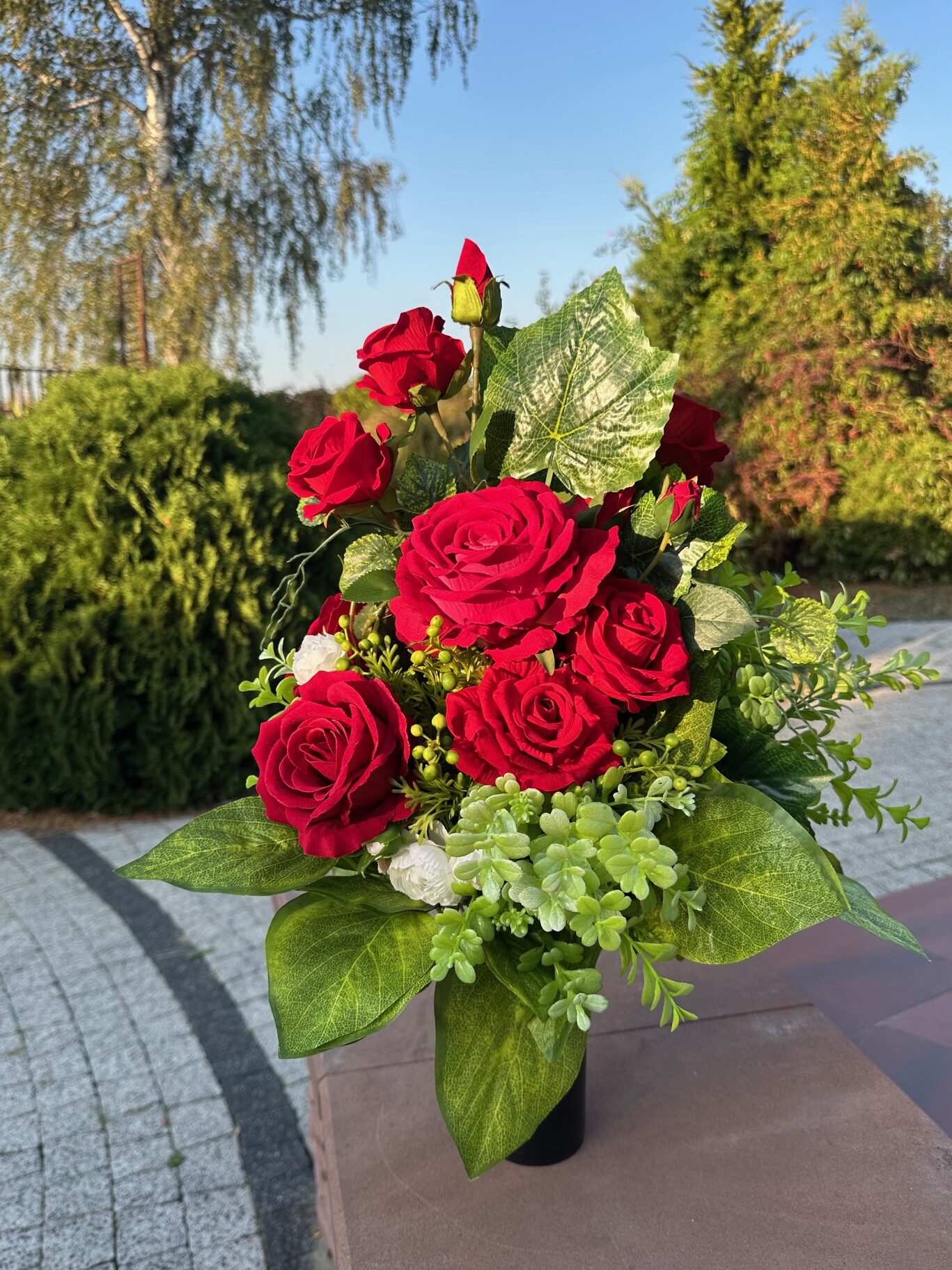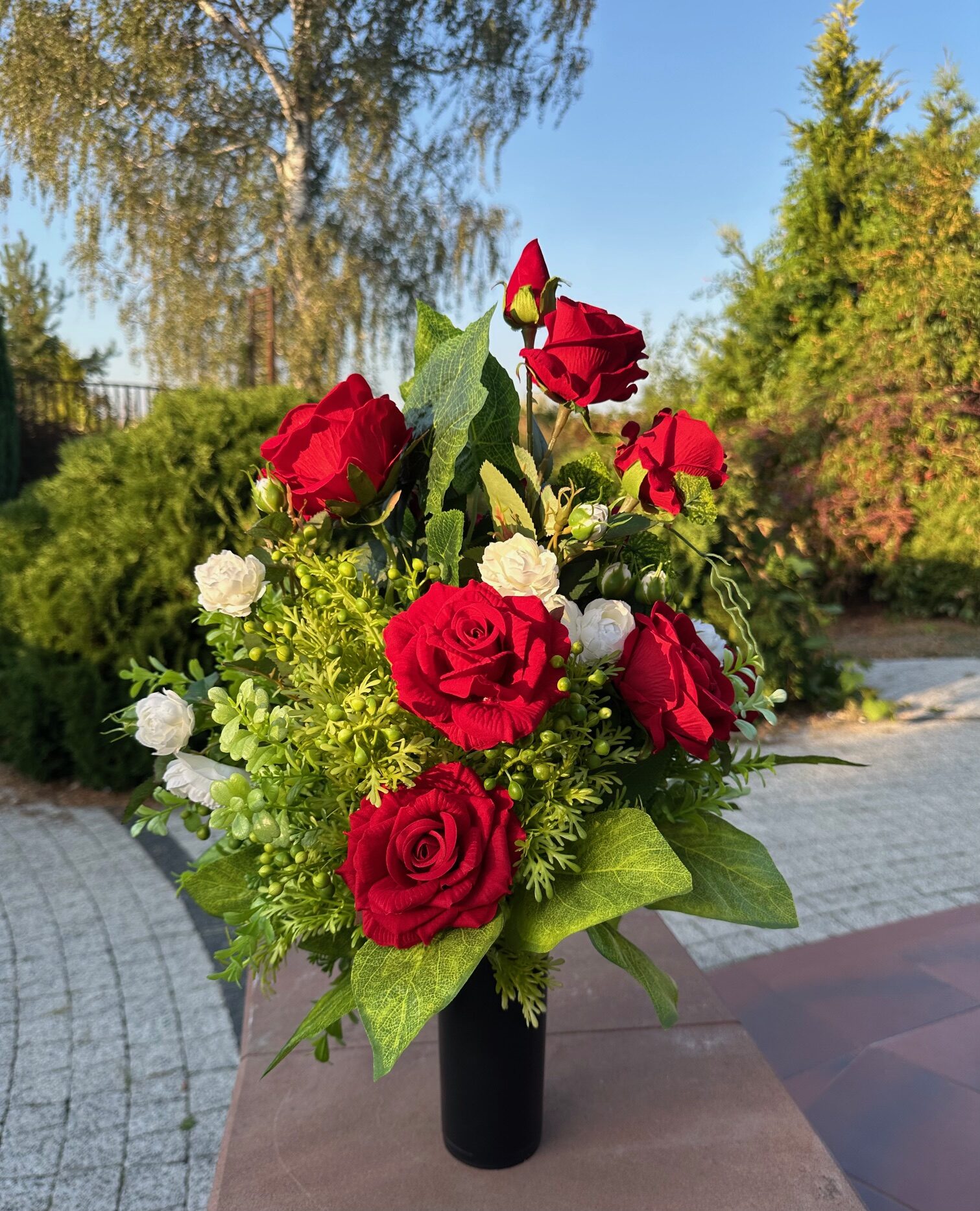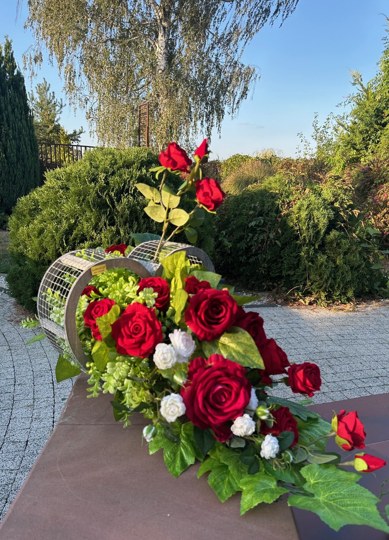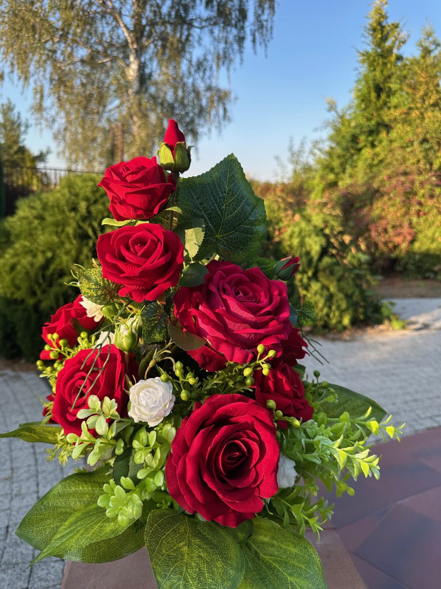 Dekoracja nagrobna w kształcie serca z czerwonymi i białymi różami to wyjątkowa i elegancka kompozycja kwiatowa, symbolizująca miłość , pamięć i głębokie uczucie wobec osoby zmarłej. Serce wypełnione kwiatami podkreśla szlachetność i ponadczasowy charakter tego gestu. Dodatki w postaci zieleni dekoracyjnej nadają całości harmonii i elegancji. Zarówno bukiet jak i wiązanka są obciążone, gotowe do postawienia na pomniku.
