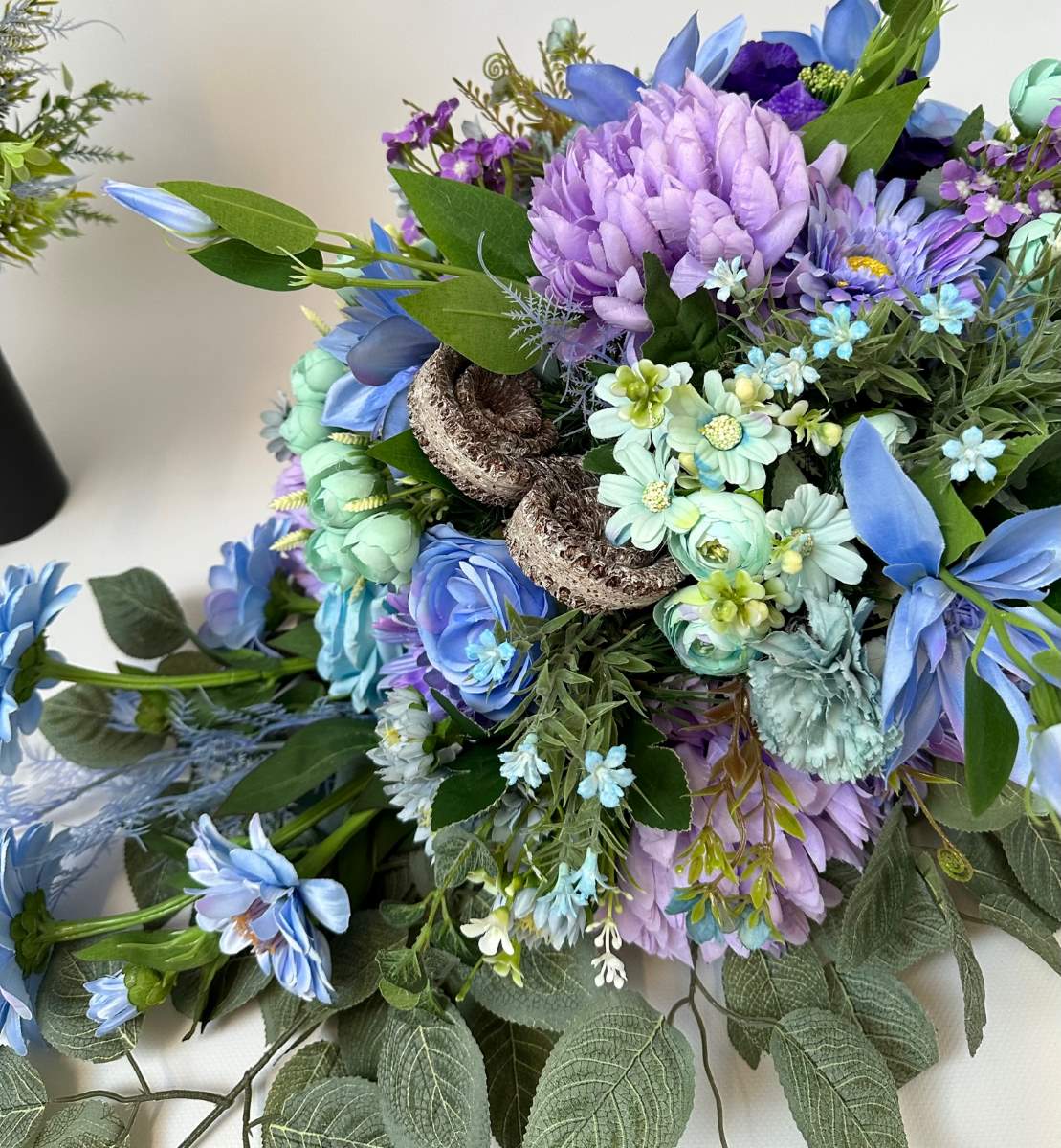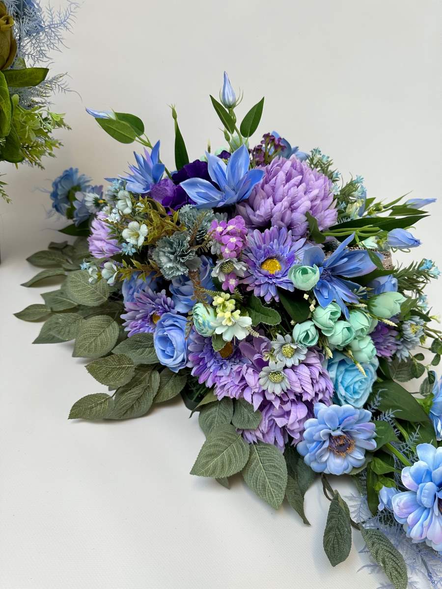Beautiful, stately tombstone decoration filled with a lot of flowers . The flowers used in the decoration are , rose, hydrangea, chrysanthemum, clematis. A bouquet made of artificial flowers on an artificial coniferous foundation.