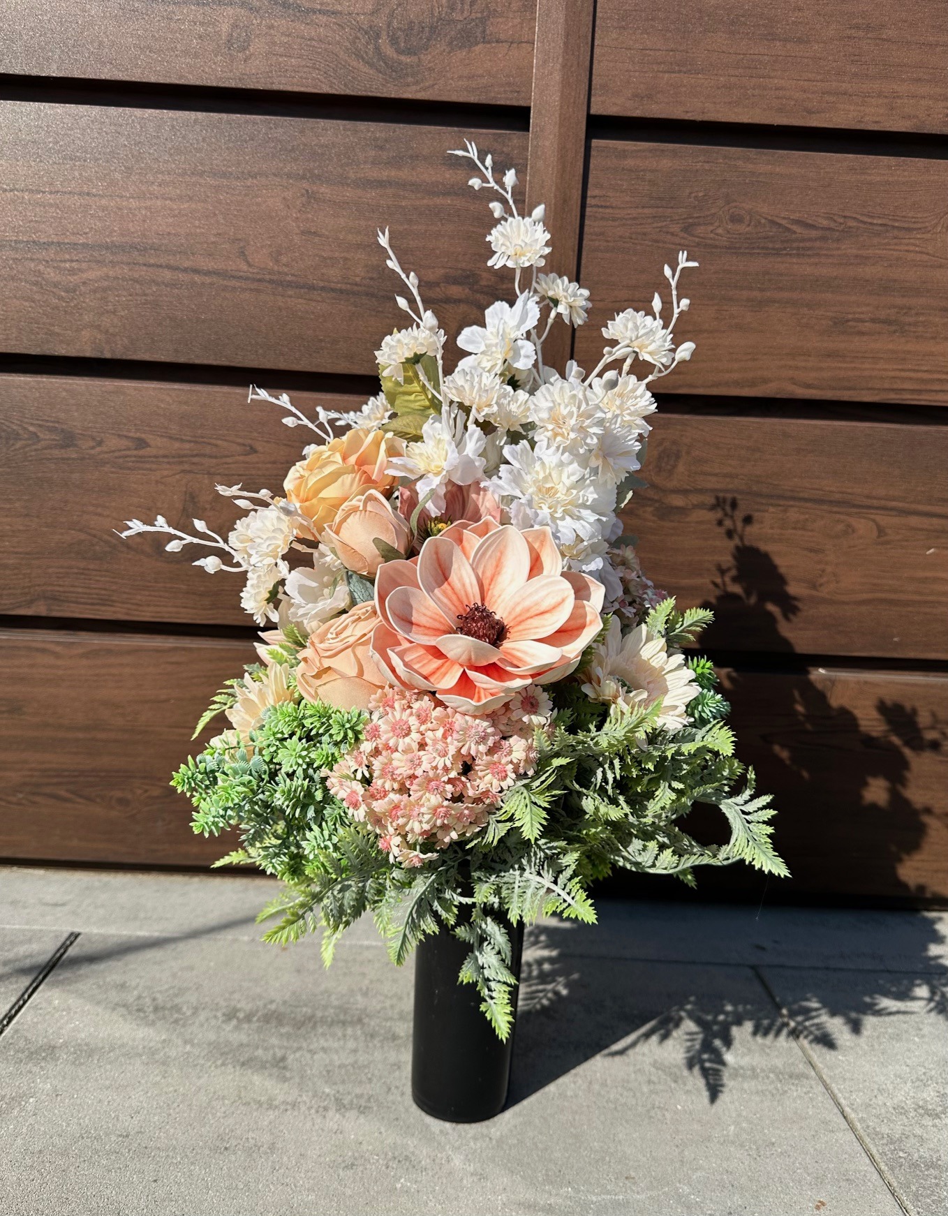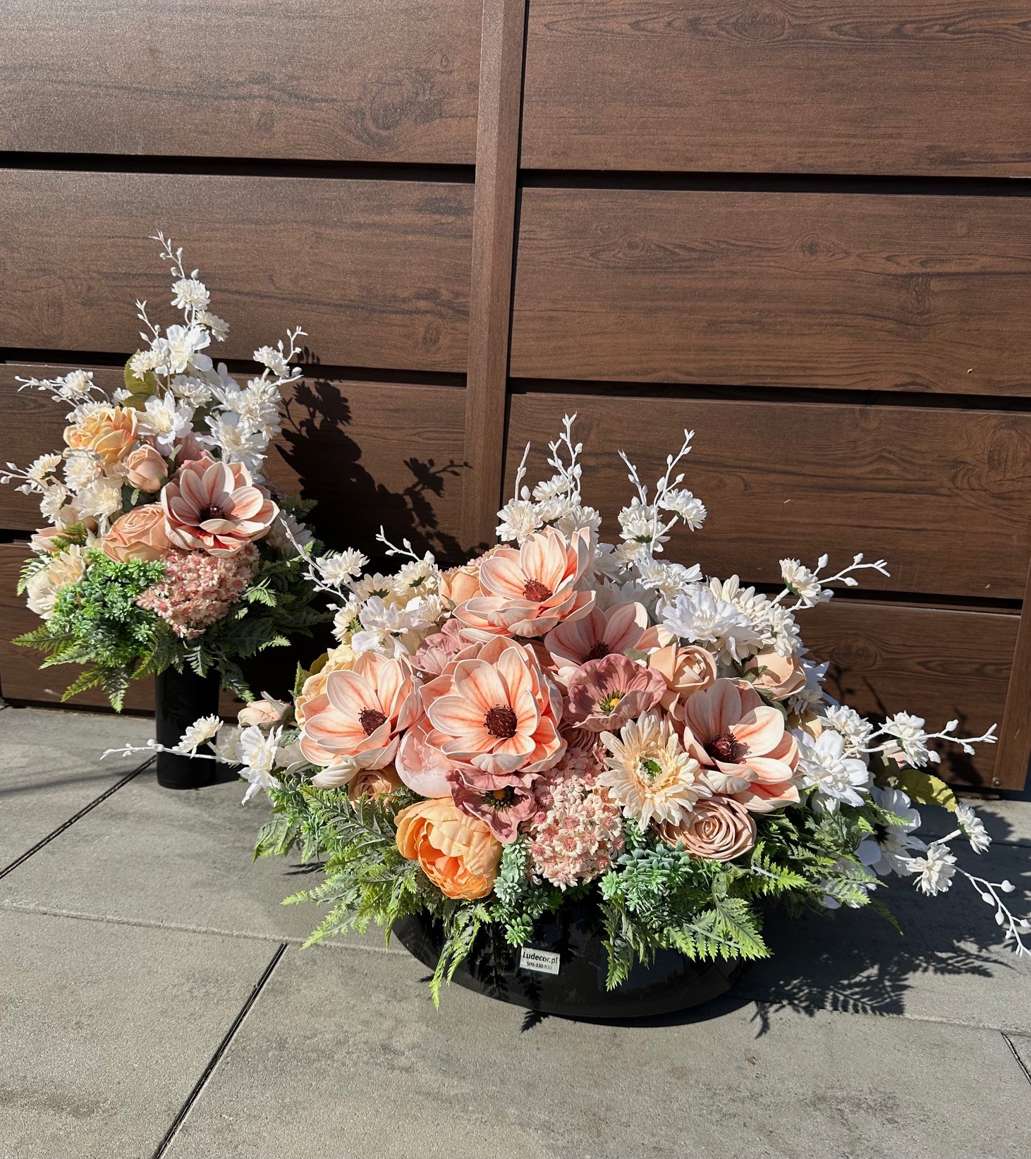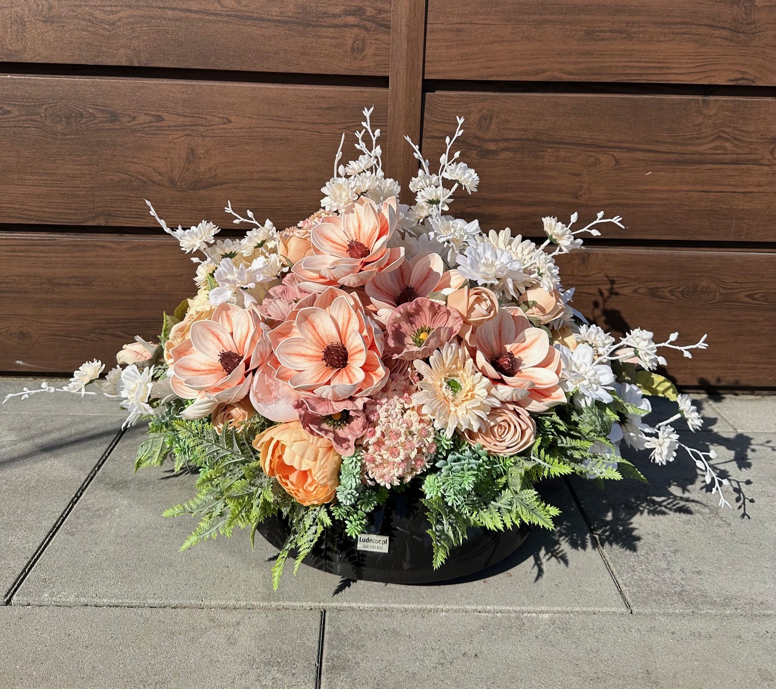 Dekoracja została odpowiednio obciążona, dzięki czemu jest stabilna i gotowa do postawienia bezpośrednio na pomniku. Całość stanowi estetyczną ozdobę miejsca pamięci, wyrażając szacunek oraz pamięć o bliskich.