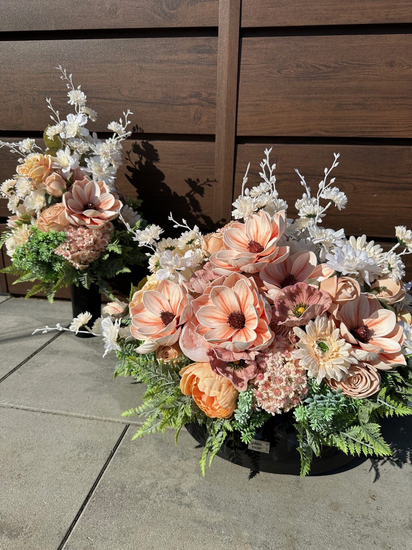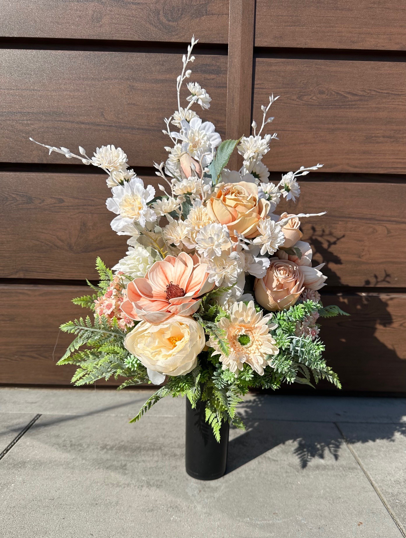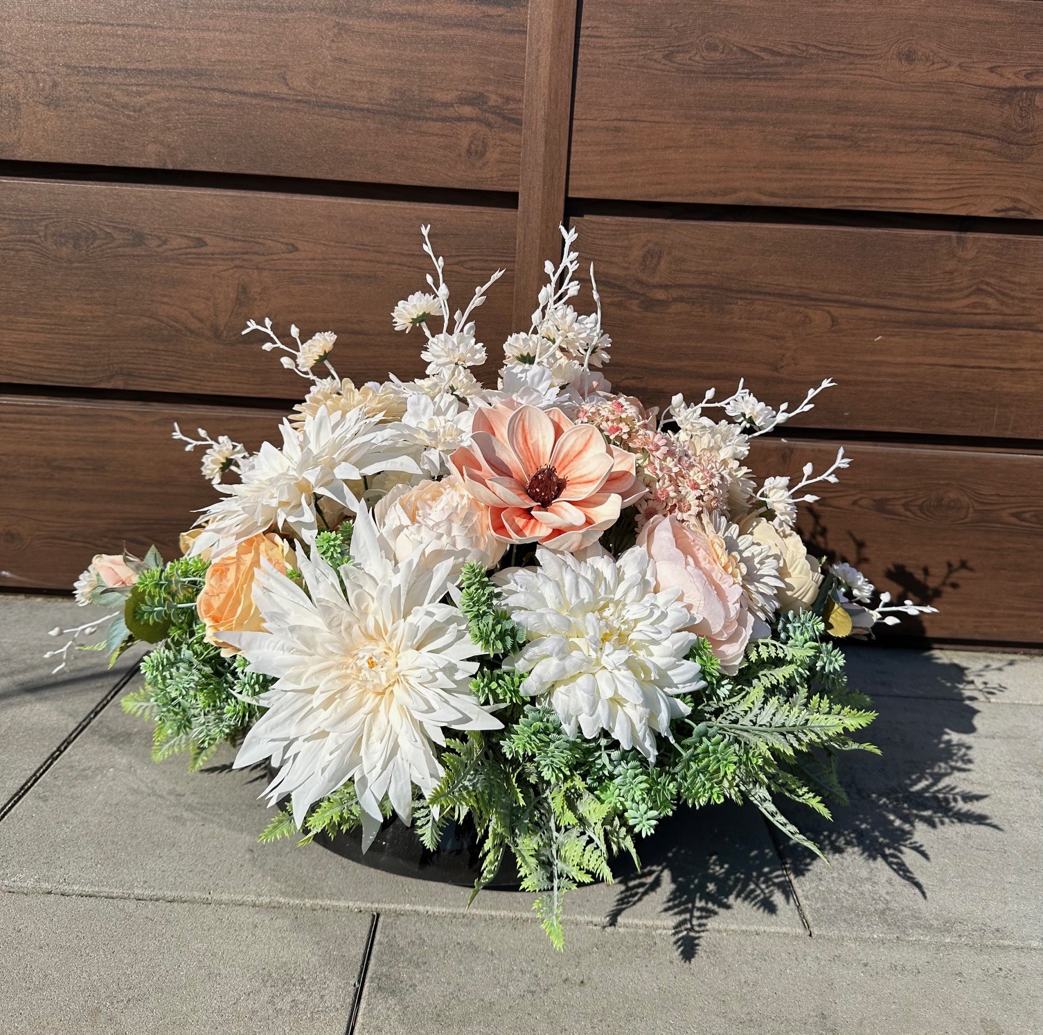 Dekoracja została odpowiednio obciążona, dzięki czemu jest stabilna i gotowa do postawienia bezpośrednio na pomniku. Całość stanowi estetyczną ozdobę miejsca pamięci, wyrażając szacunek oraz pamięć o bliskich.