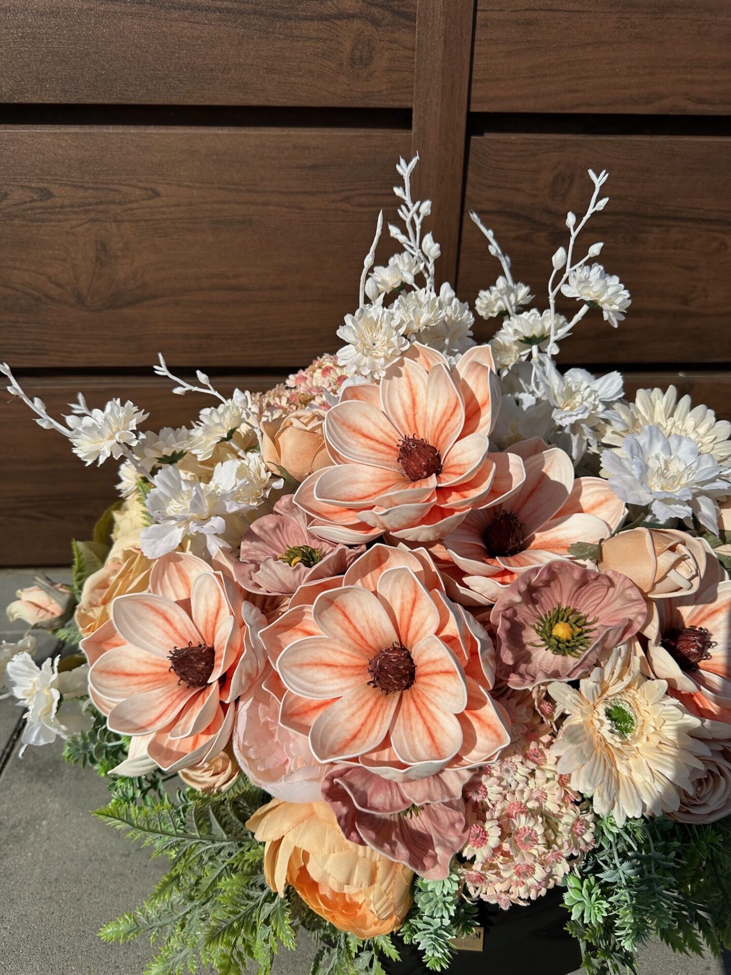 Artificial flowers used in the composition perfectly harmonize with the other elements of decoration.