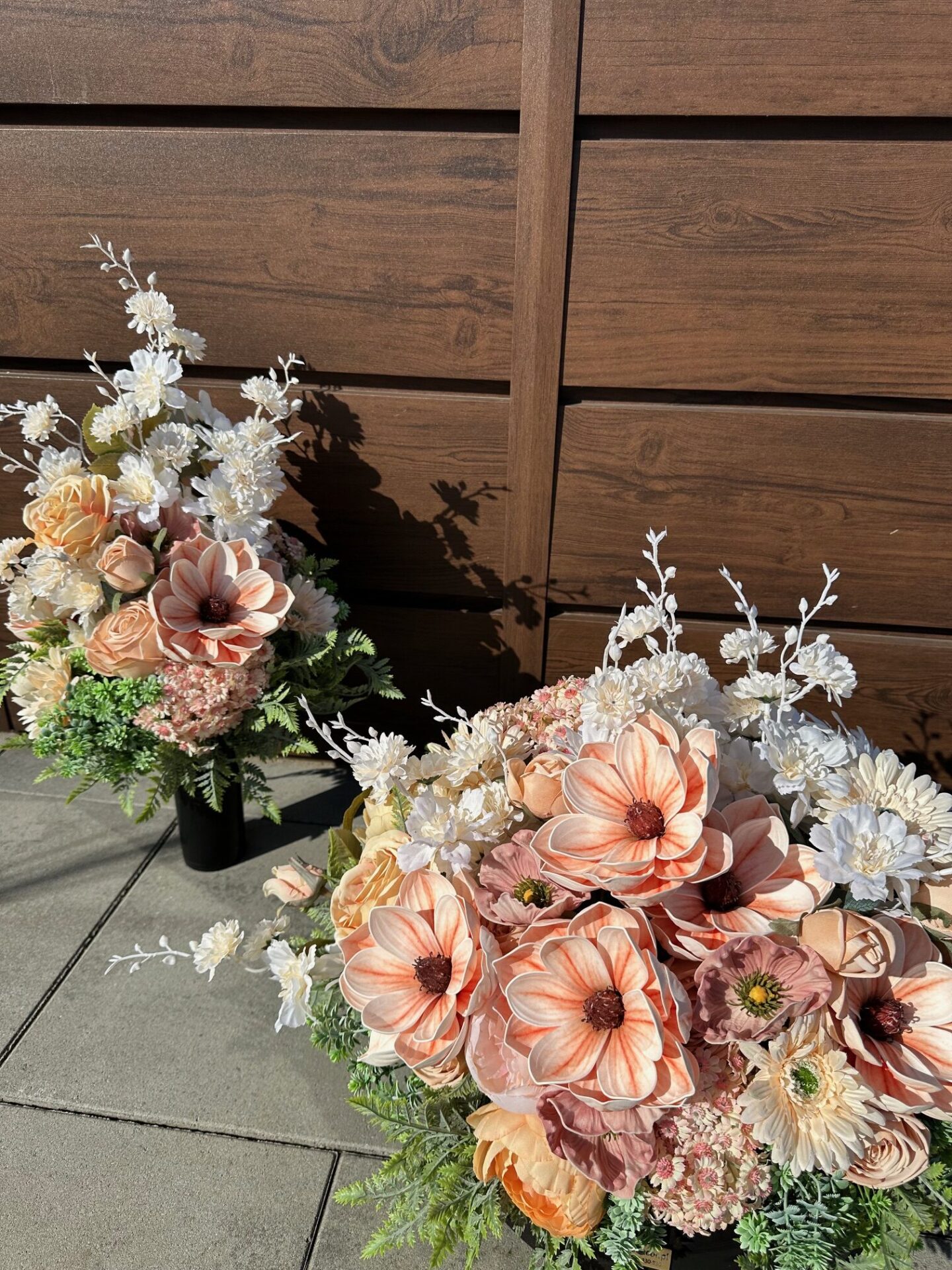 Komplet dekoracji nagrobnych składający się z eleganckiej wiązanki oraz dopasowanego bukietu. Kompozycję tworzą gęsto ułożone, różnorodne kwiaty w harmonijnym zestawieniu z zielonymi gałązkami, które nadają całości dostojny charakter. Starannie dobrane elementy tworzą pełną, bogatą formę, podkreślając wyjątkowy wygląd dekoracji.