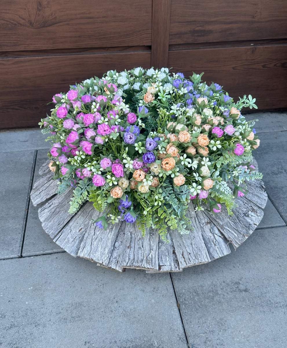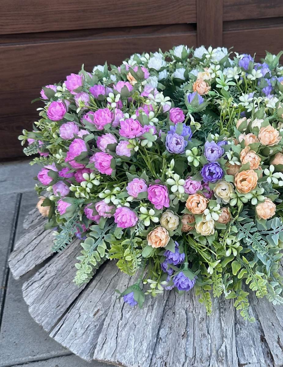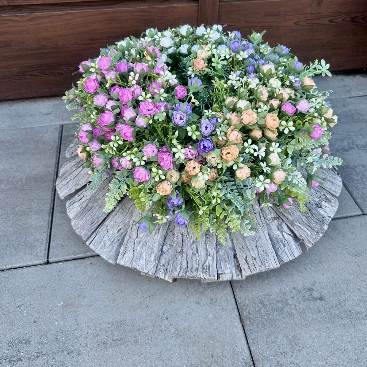 Artificial flowers used in the composition perfectly harmonize with the other elements of decoration.