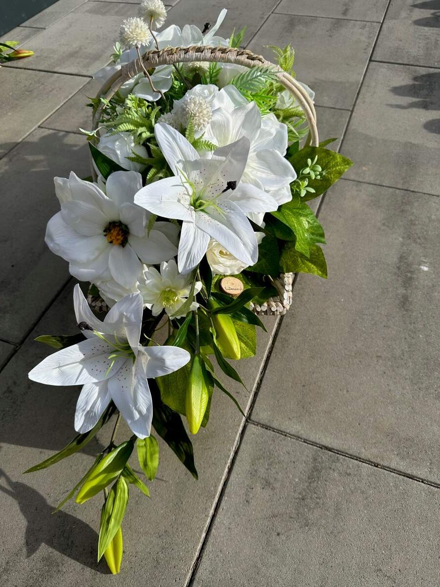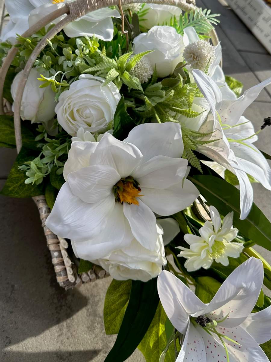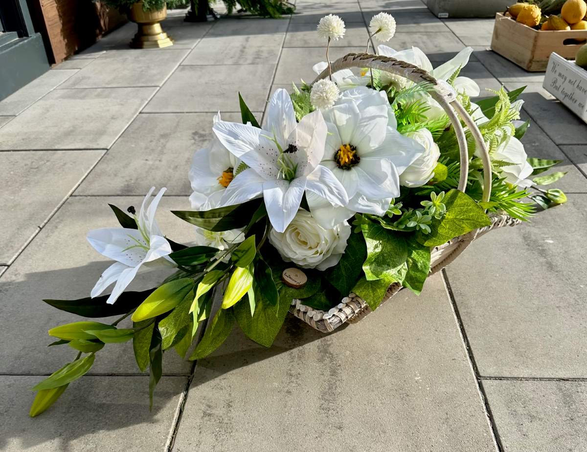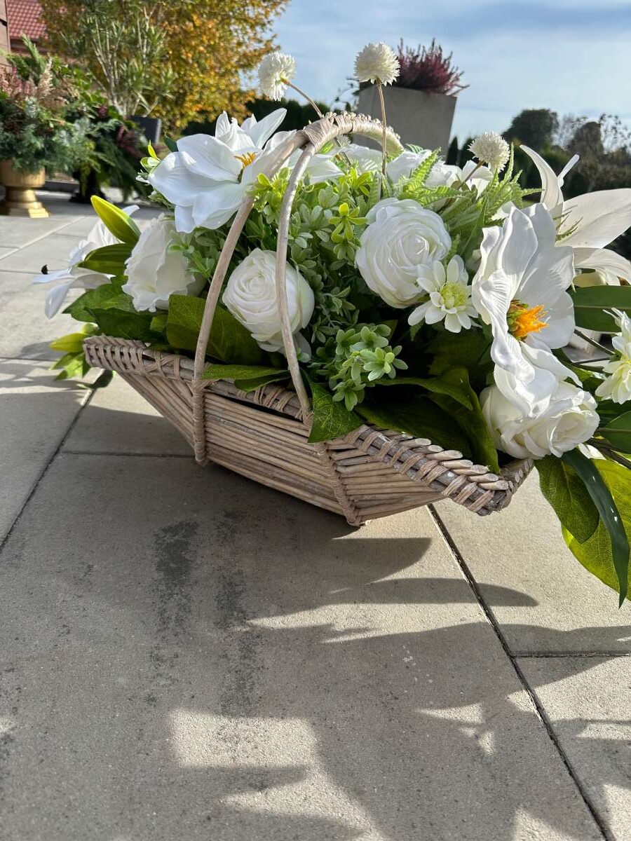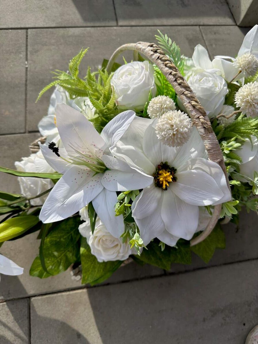 Artificial flowers used in the composition perfectly harmonize with the other elements of decoration.