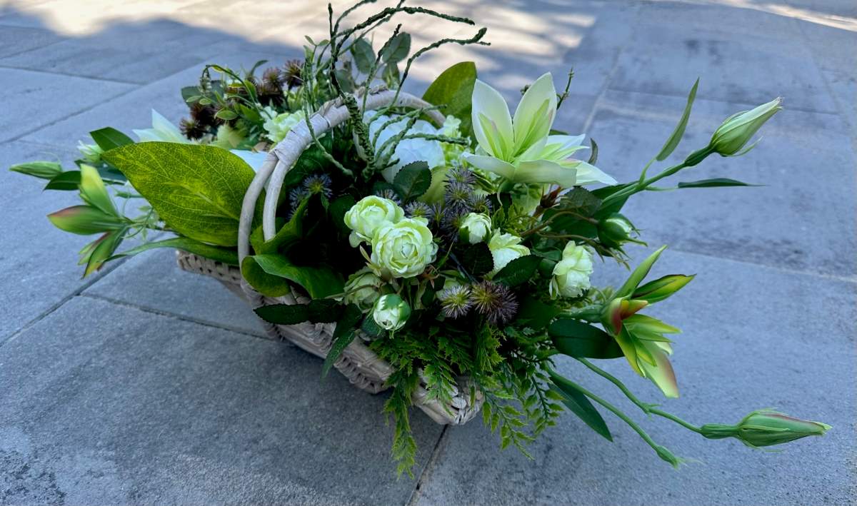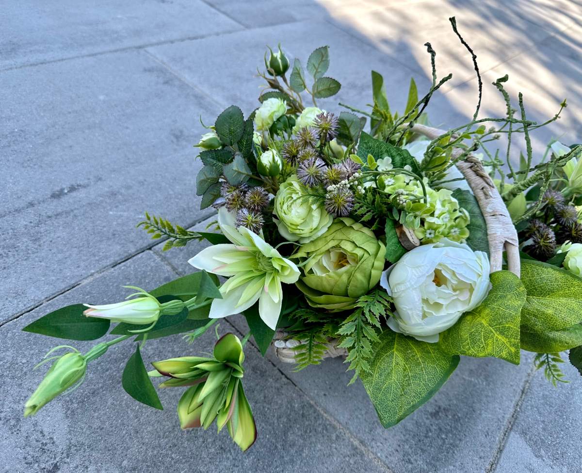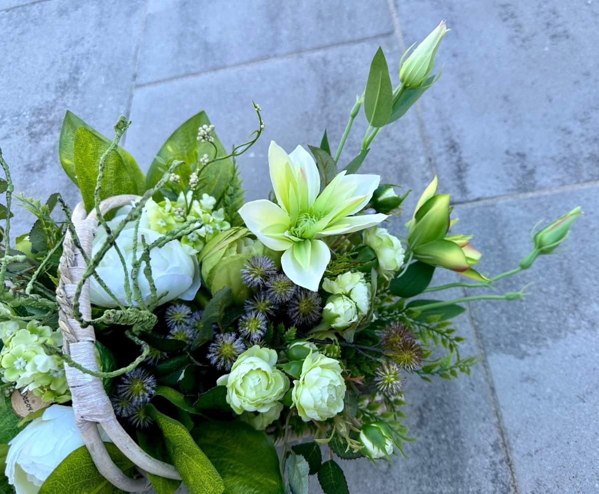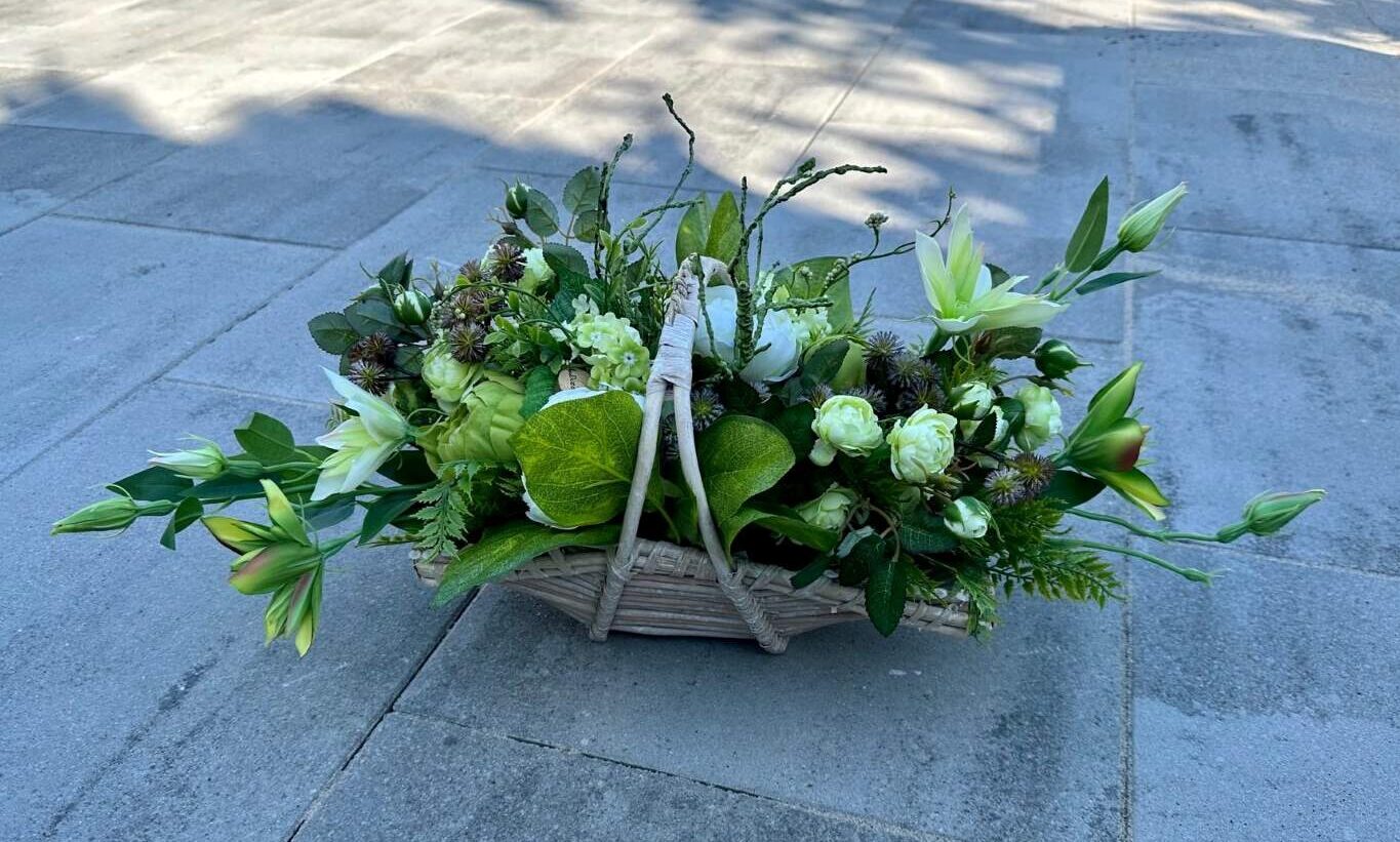 Artificial flowers used in the composition perfectly harmonize with the other elements of decoration.
