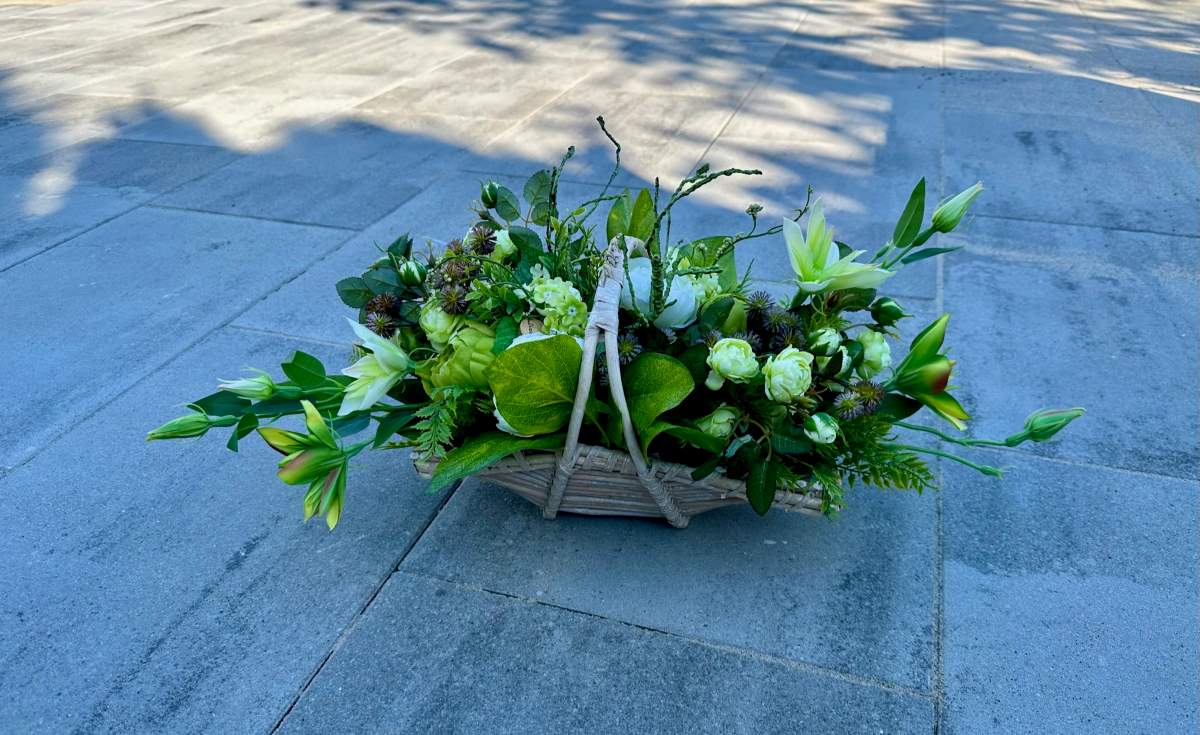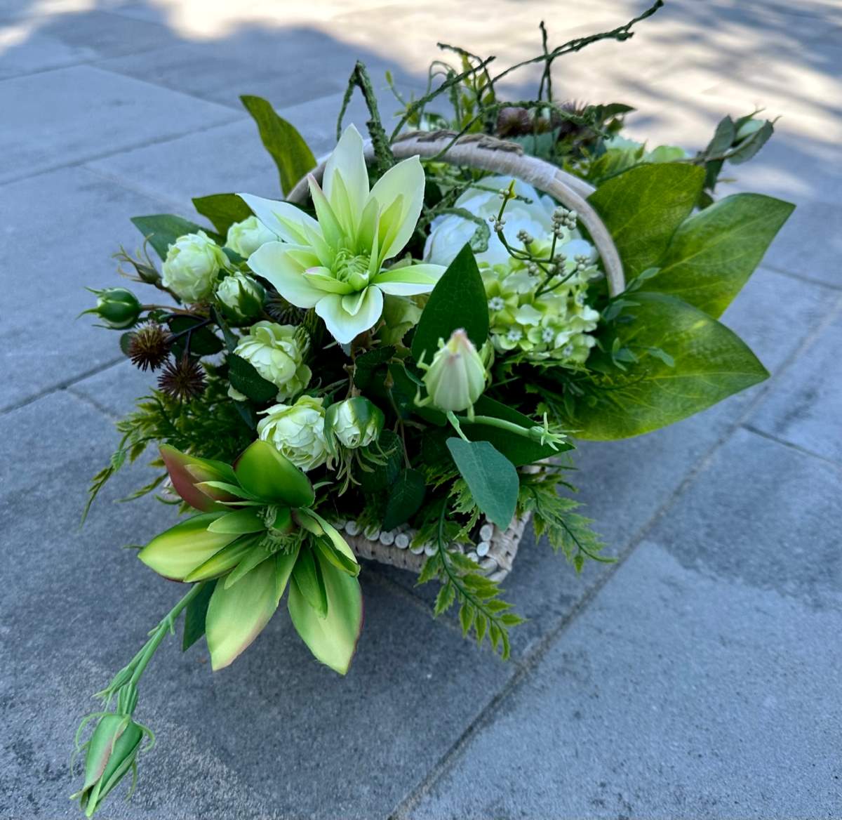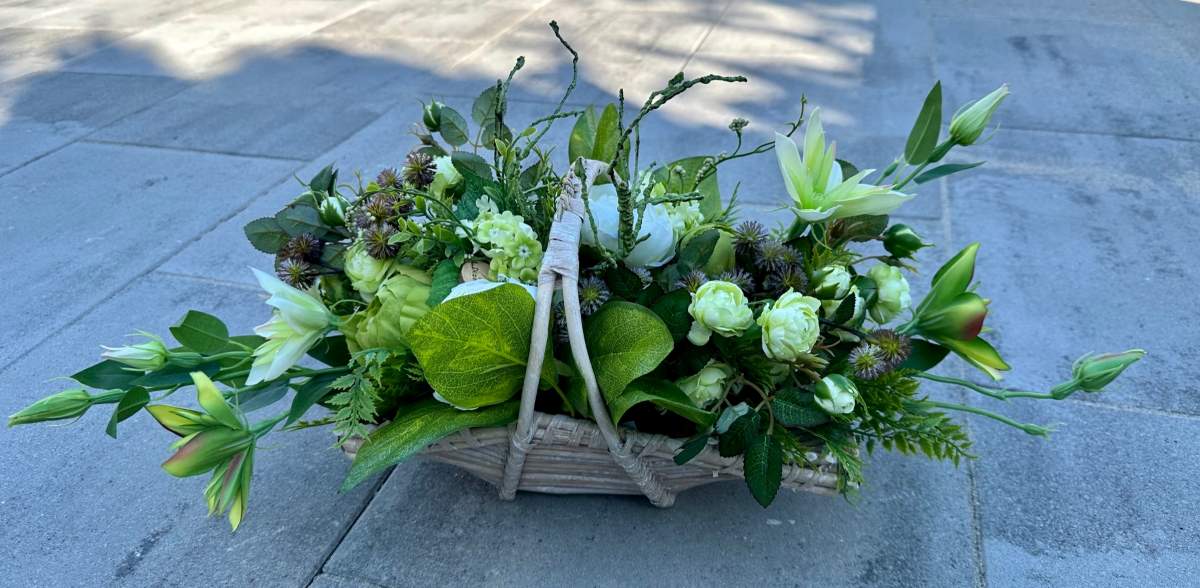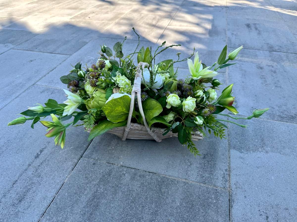 Artificial flowers used in the composition perfectly harmonize with the other elements of decoration.