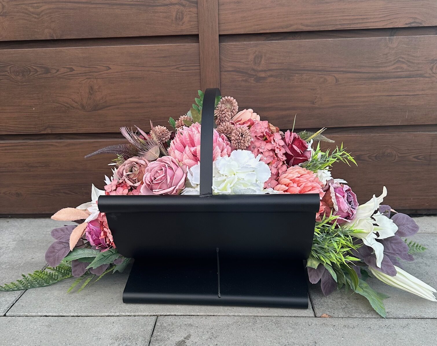 Proponujemy Państwu elegancką i estetyczną kompozycję nagrobną wykonaną w ciężkim metalowym koszu w kolorze czarnym. Metalowy kosz jest malowany proszkowo, co zapewnia mu wysoką trwałość. Kosz po brzegi wypełniony różnorodnymi kwiatami.