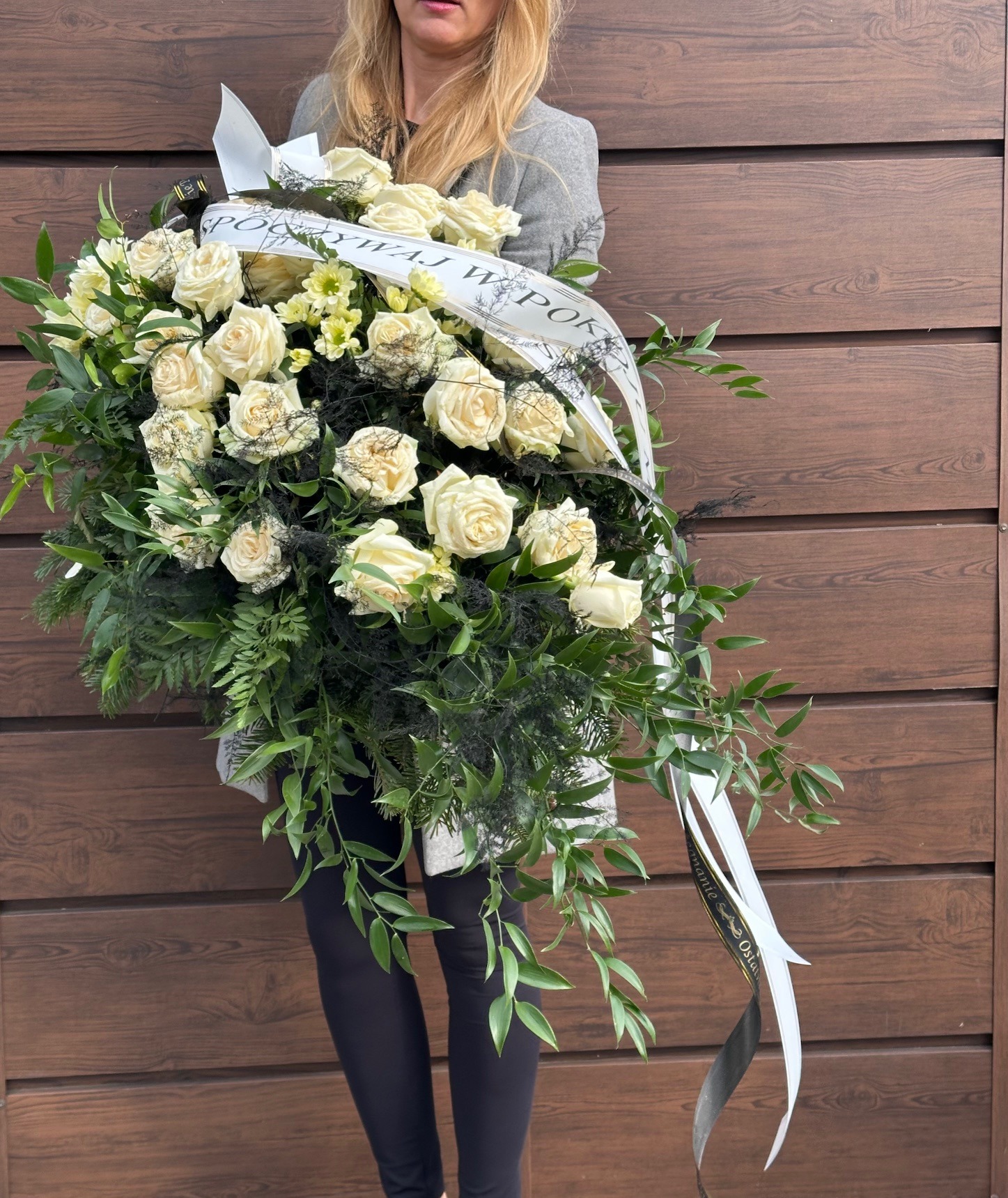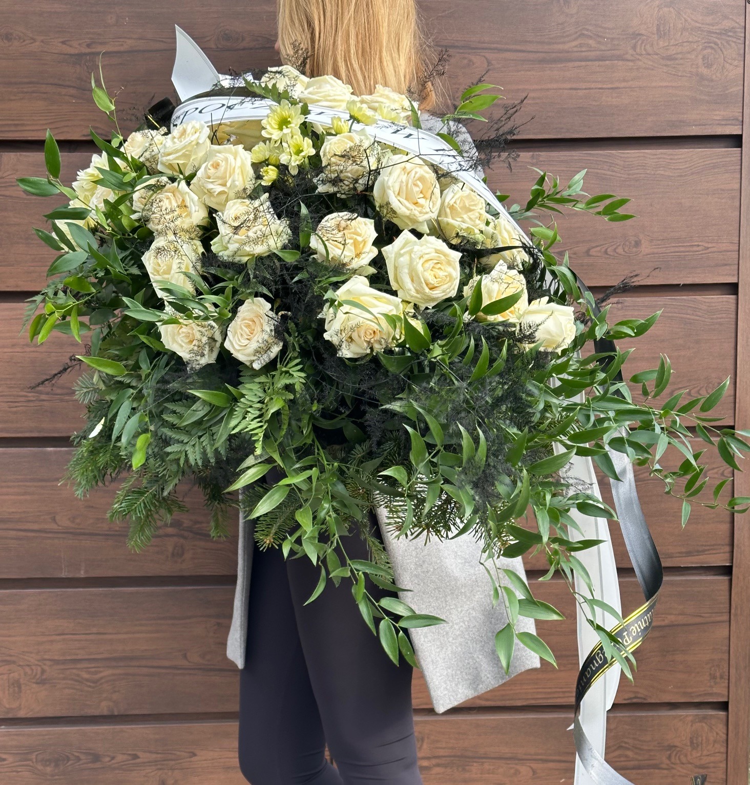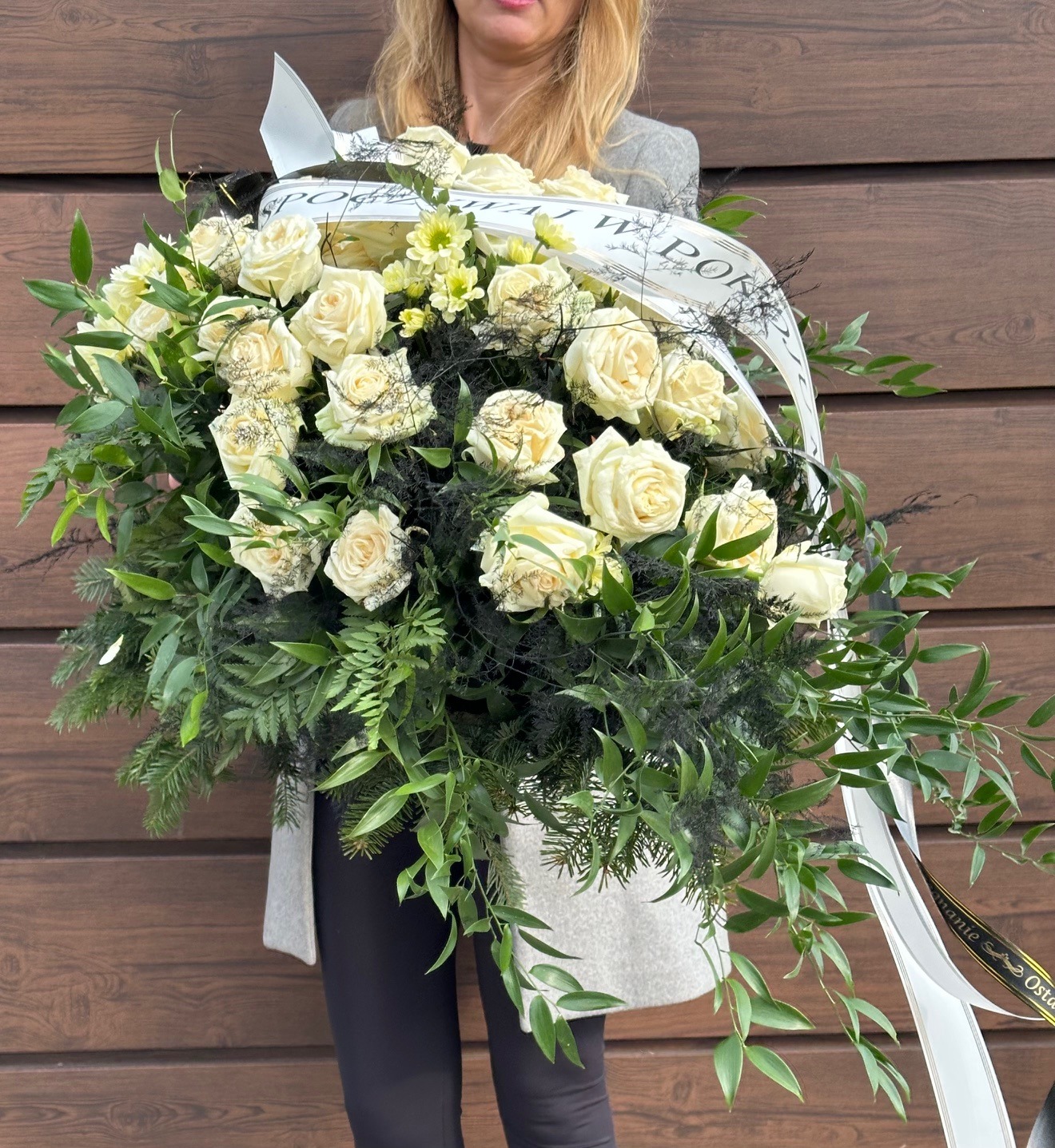 Oferujemy elegancką, naturalną wiązankę pogrzebową skomponowaną z jasnych róż – kwiatów symbolizujących miłość, szacunek i pamięć. Starannie dobrane świeże rośliny tworzą harmonijną, klasyczną kompozycję, która w godny i subtelny sposób wyraża uczucia w trudnych chwilach pożegnania.