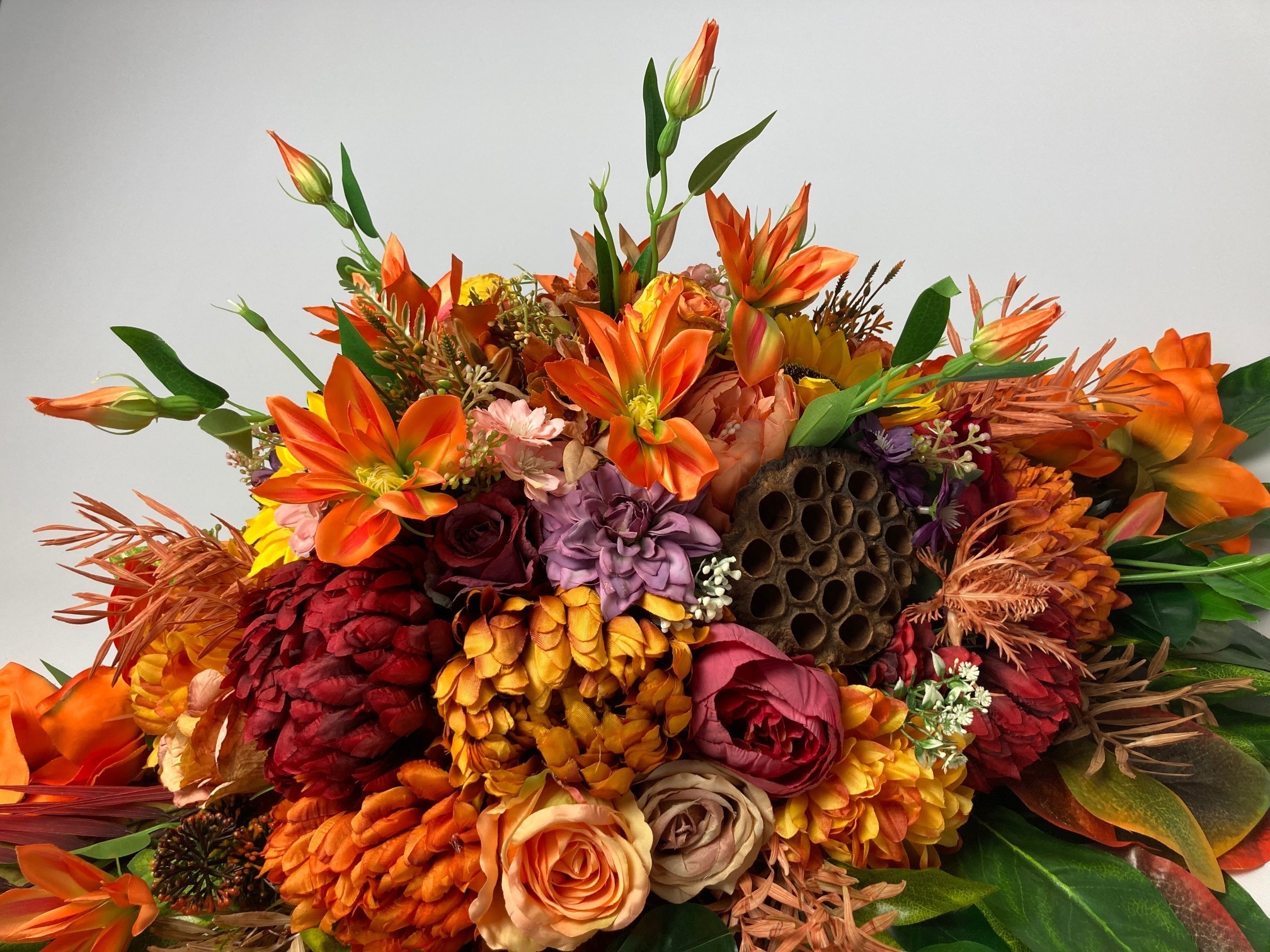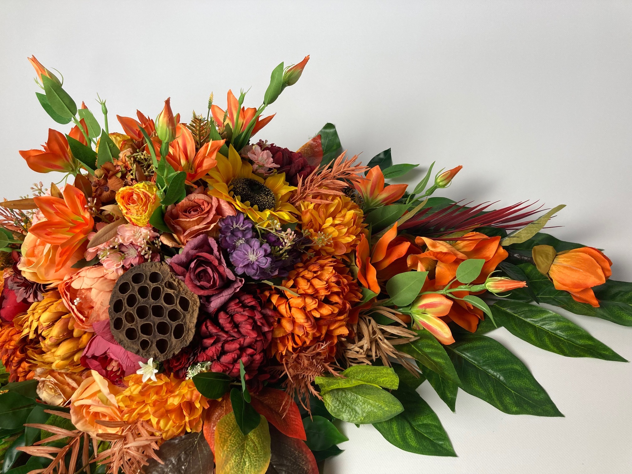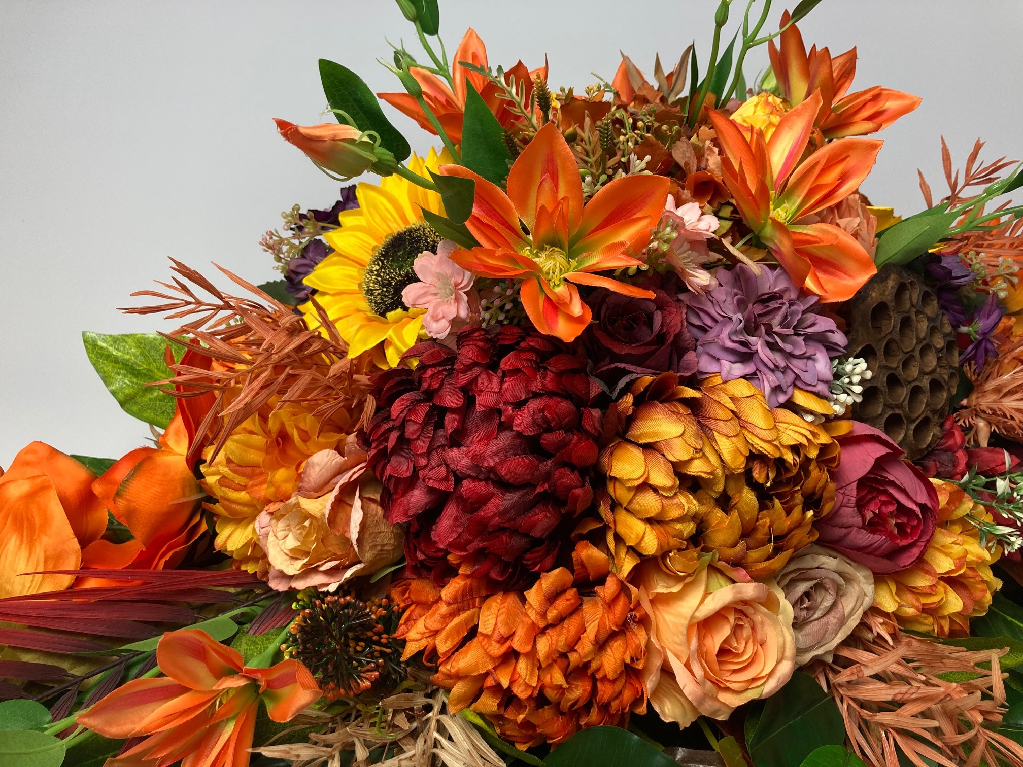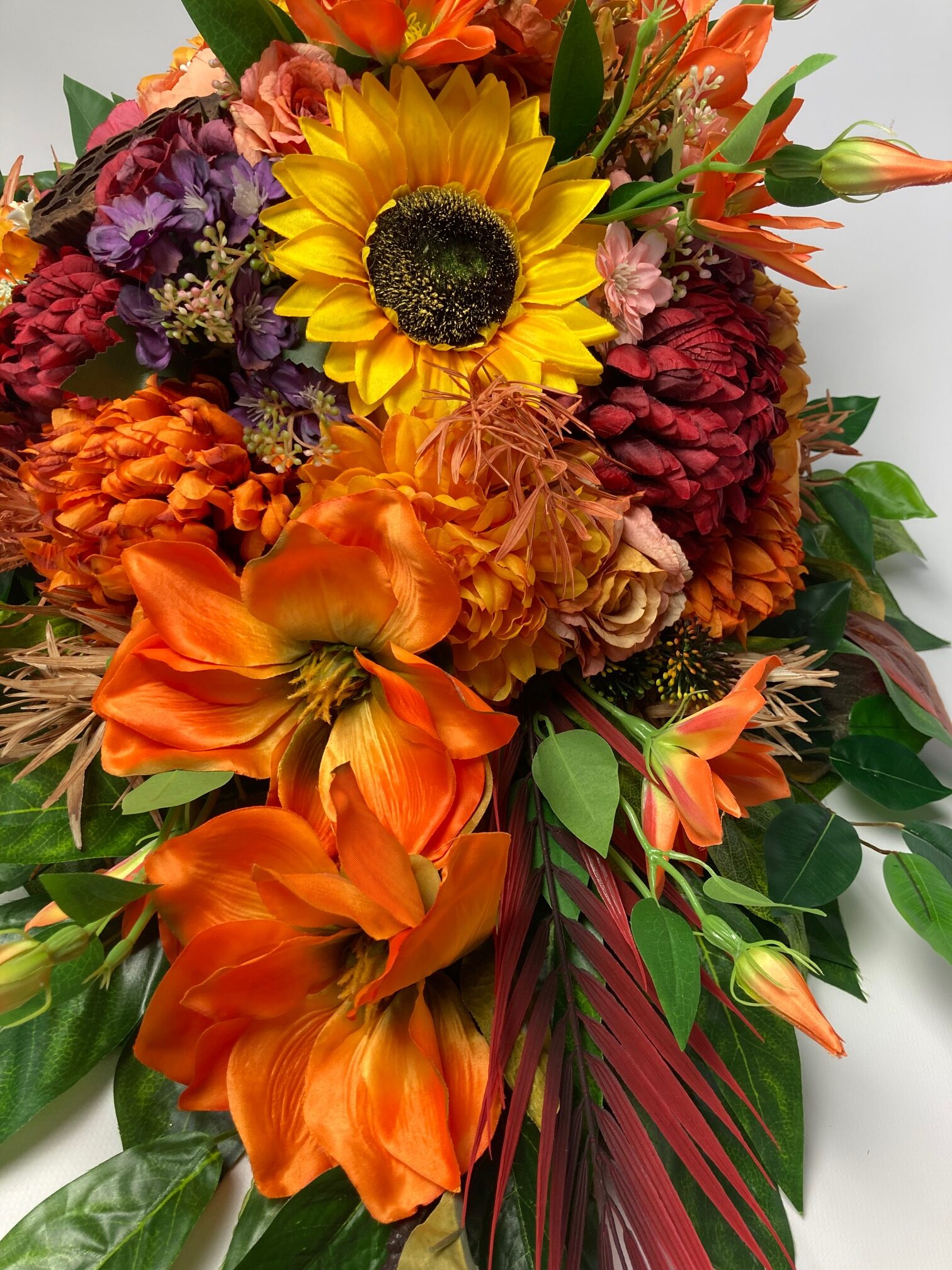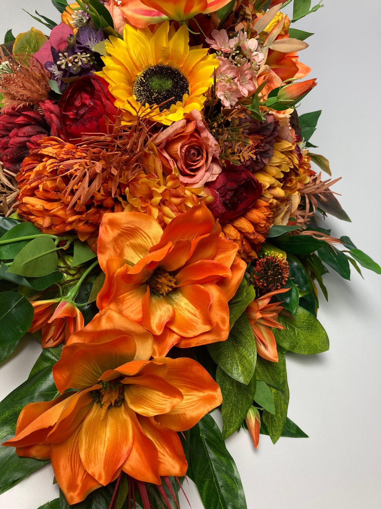 Beautiful, stately tombstone decoration filled with a lot of flowers in autumn colours. The flowers used in the decoration are sunflower, rose, hydrangea, chrysanthemum, peony, magnolia, clematis and green and colourful leaves. A bouquet made of artificial flowers on an artificial coniferous foundation.