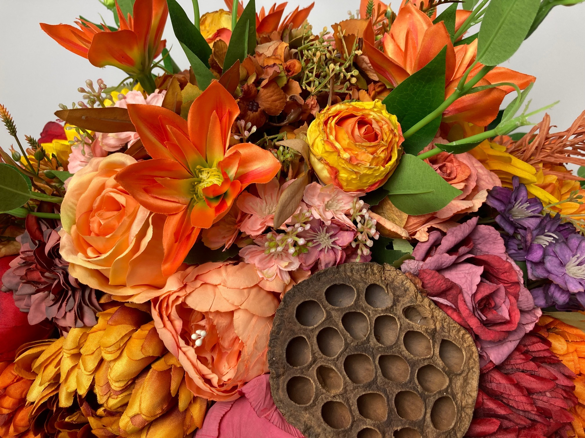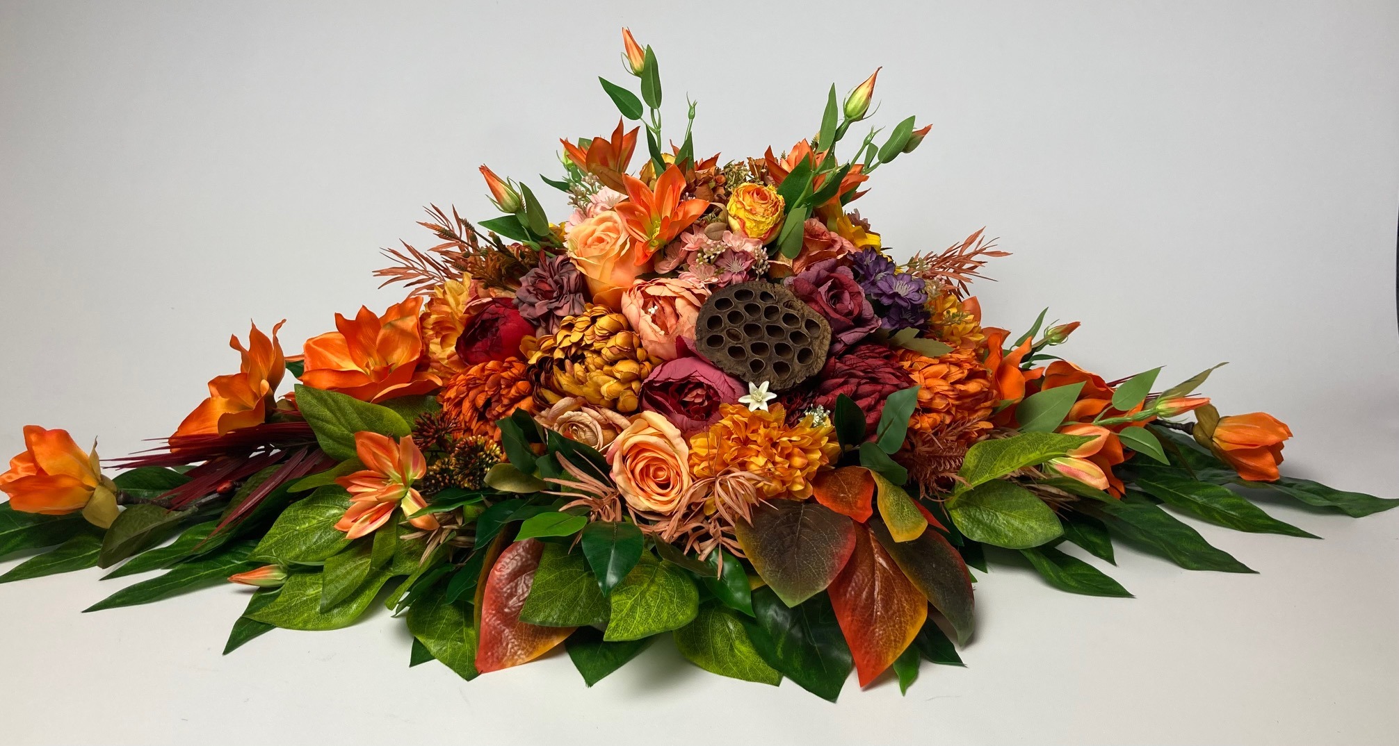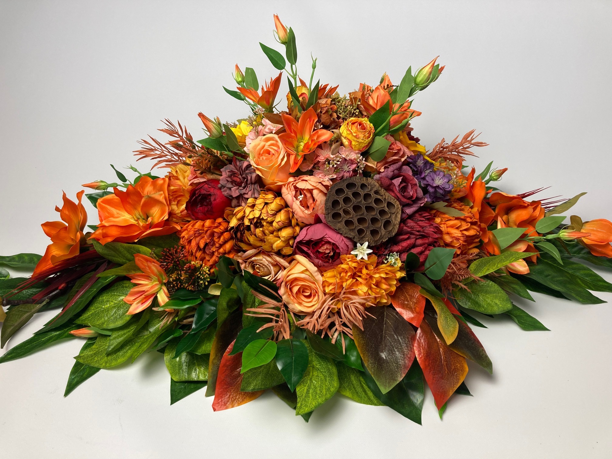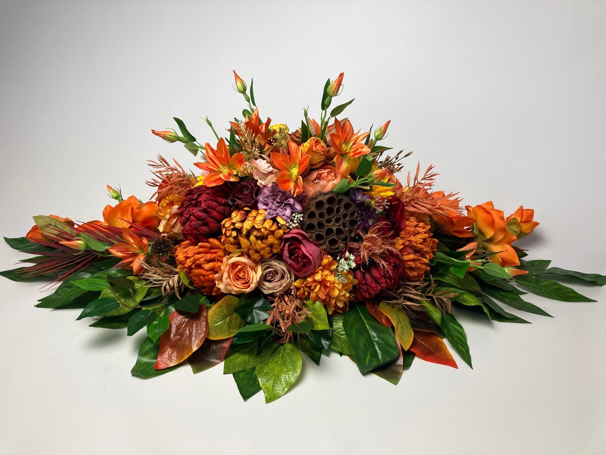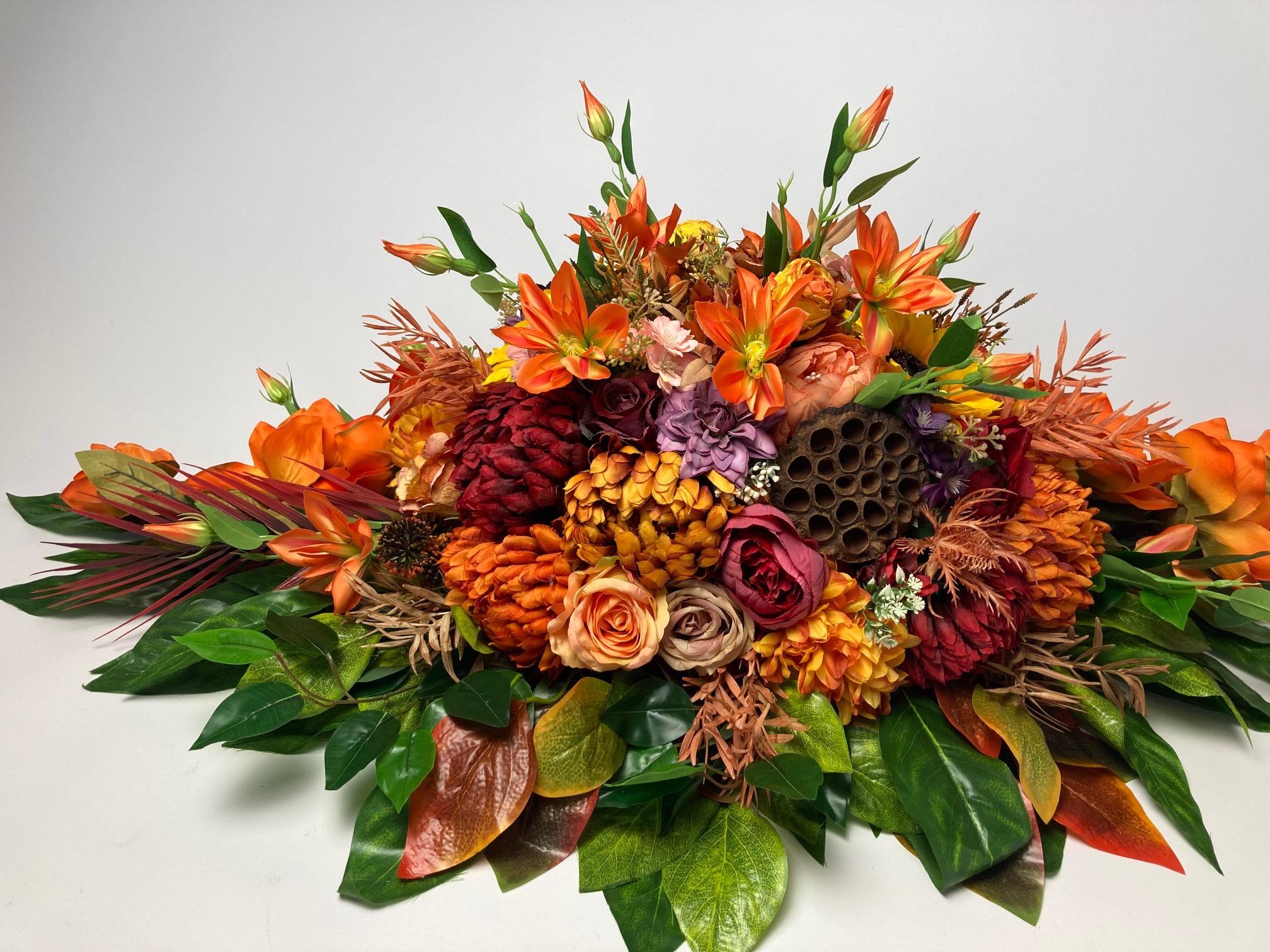Beautiful, stately tombstone decoration filled with a lot of flowers in autumn colours. The flowers used in the decoration are sunflower, rose, hydrangea, chrysanthemum, peony, magnolia, clematis and green and colourful leaves. A bouquet made of artificial flowers on an artificial coniferous foundation.
