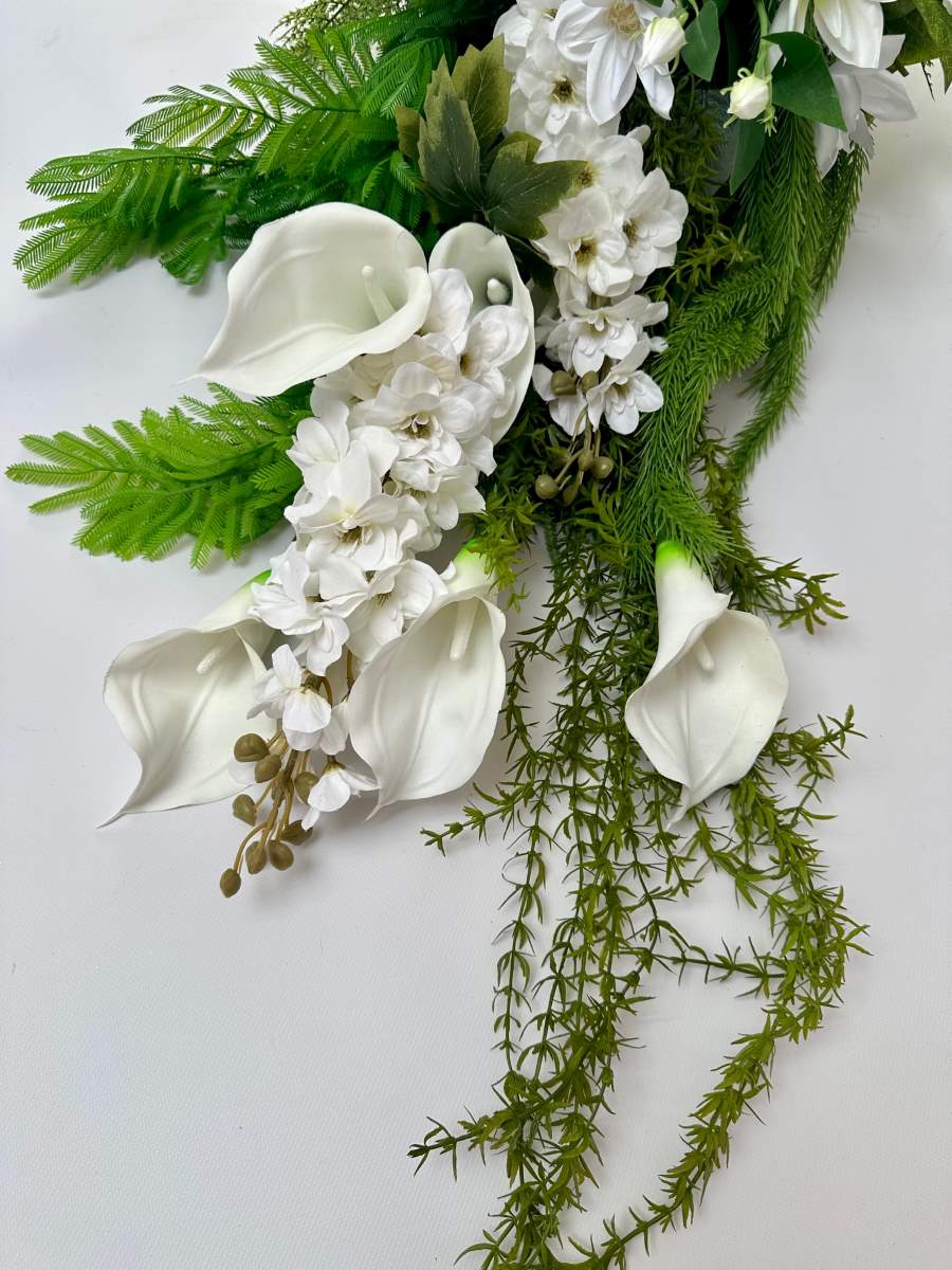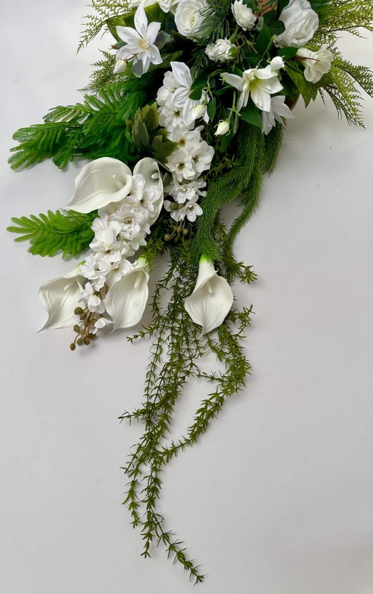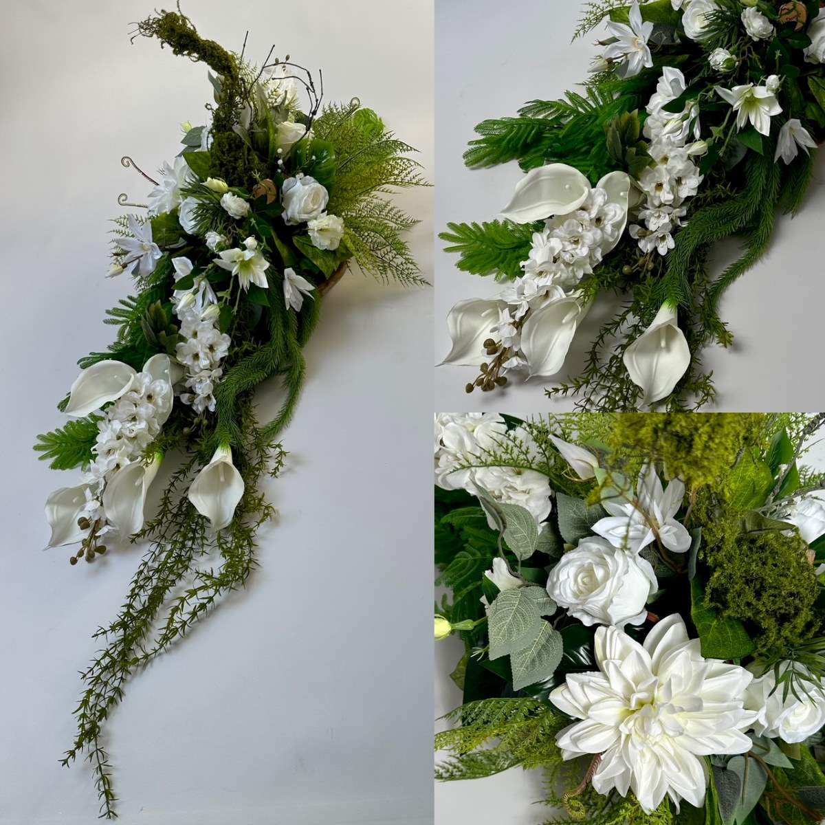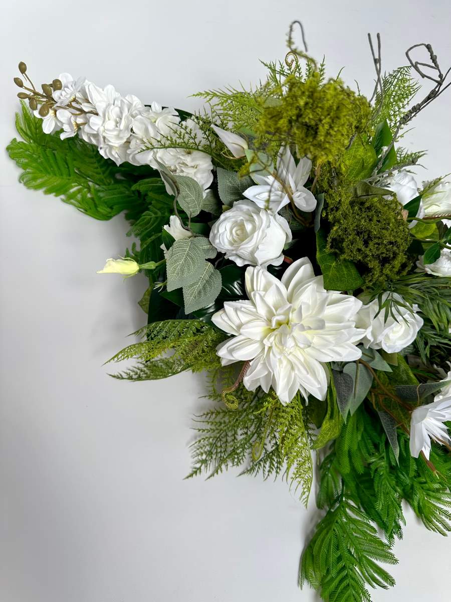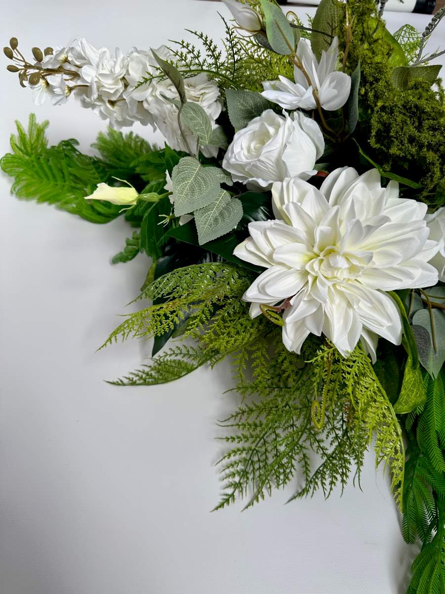 Artificial flowers used in the composition perfectly harmonize with the other elements of decoration.