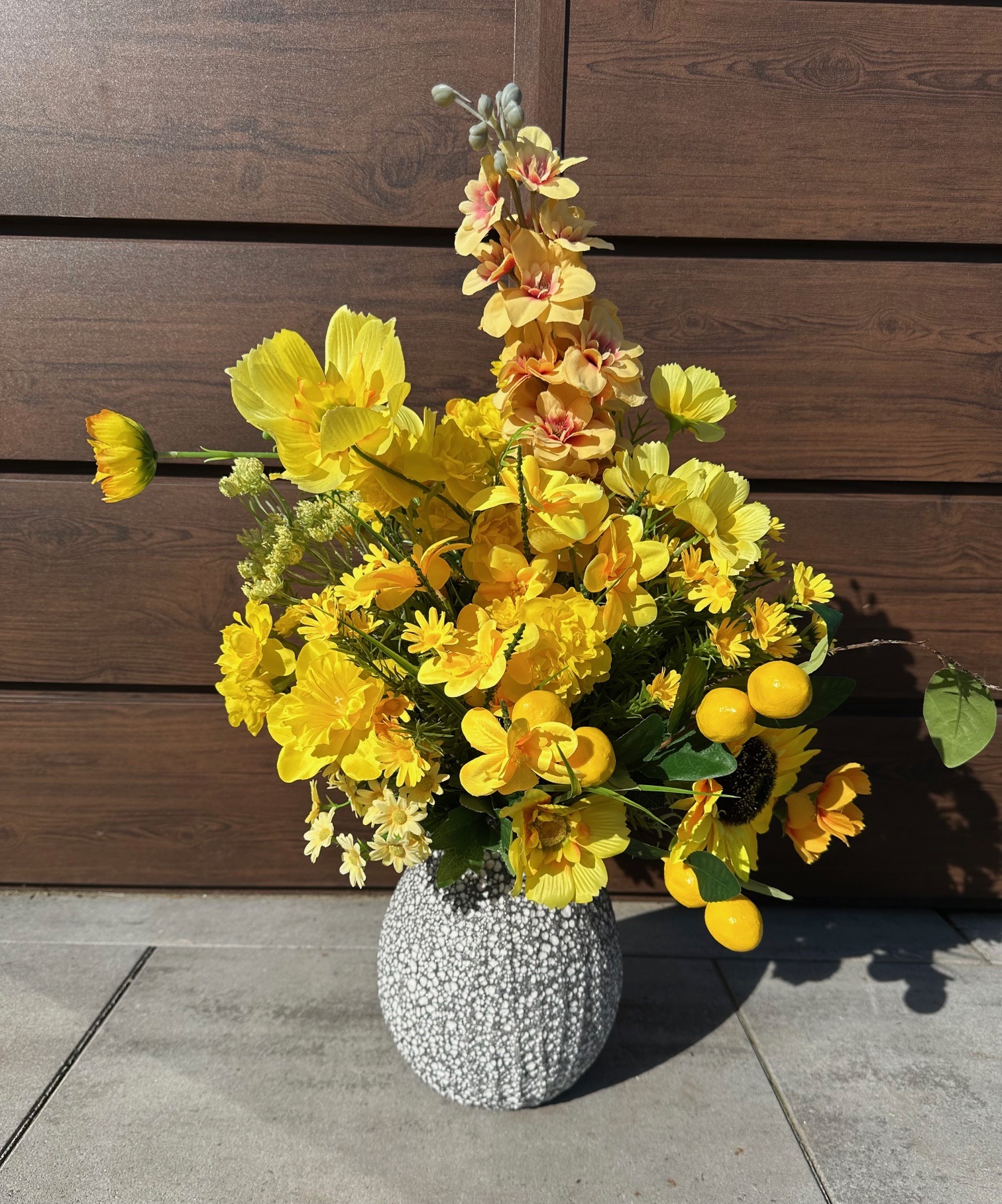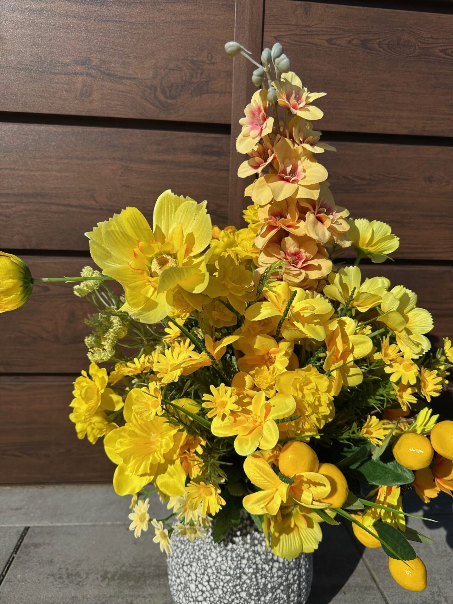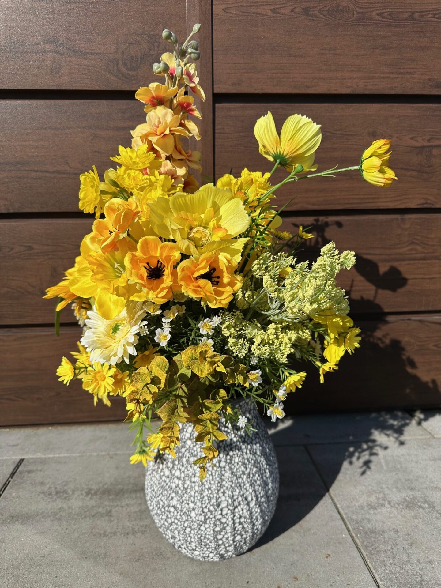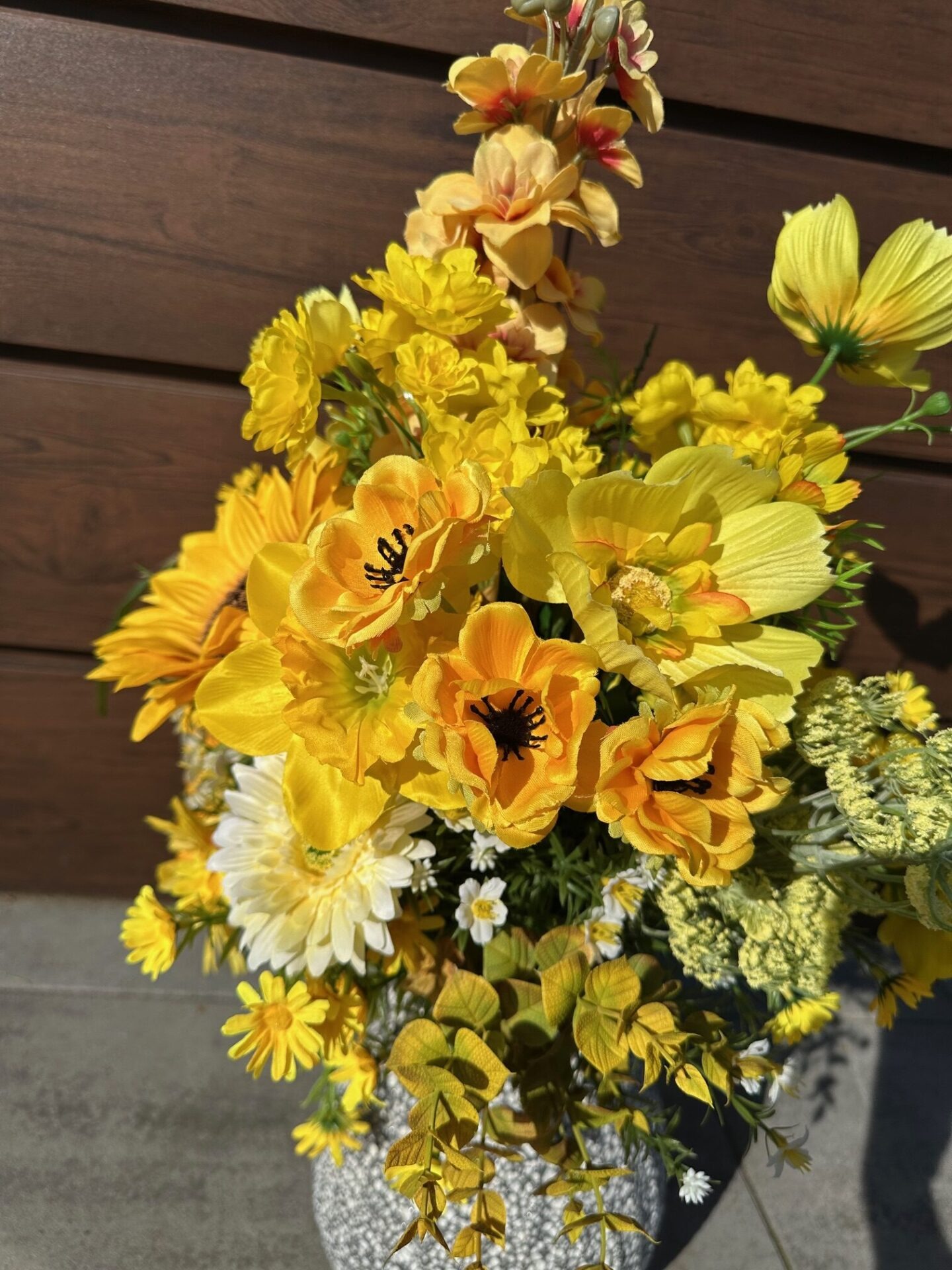 Obszerny bukiet kwiatów wykonany ze sztucznych roślin.