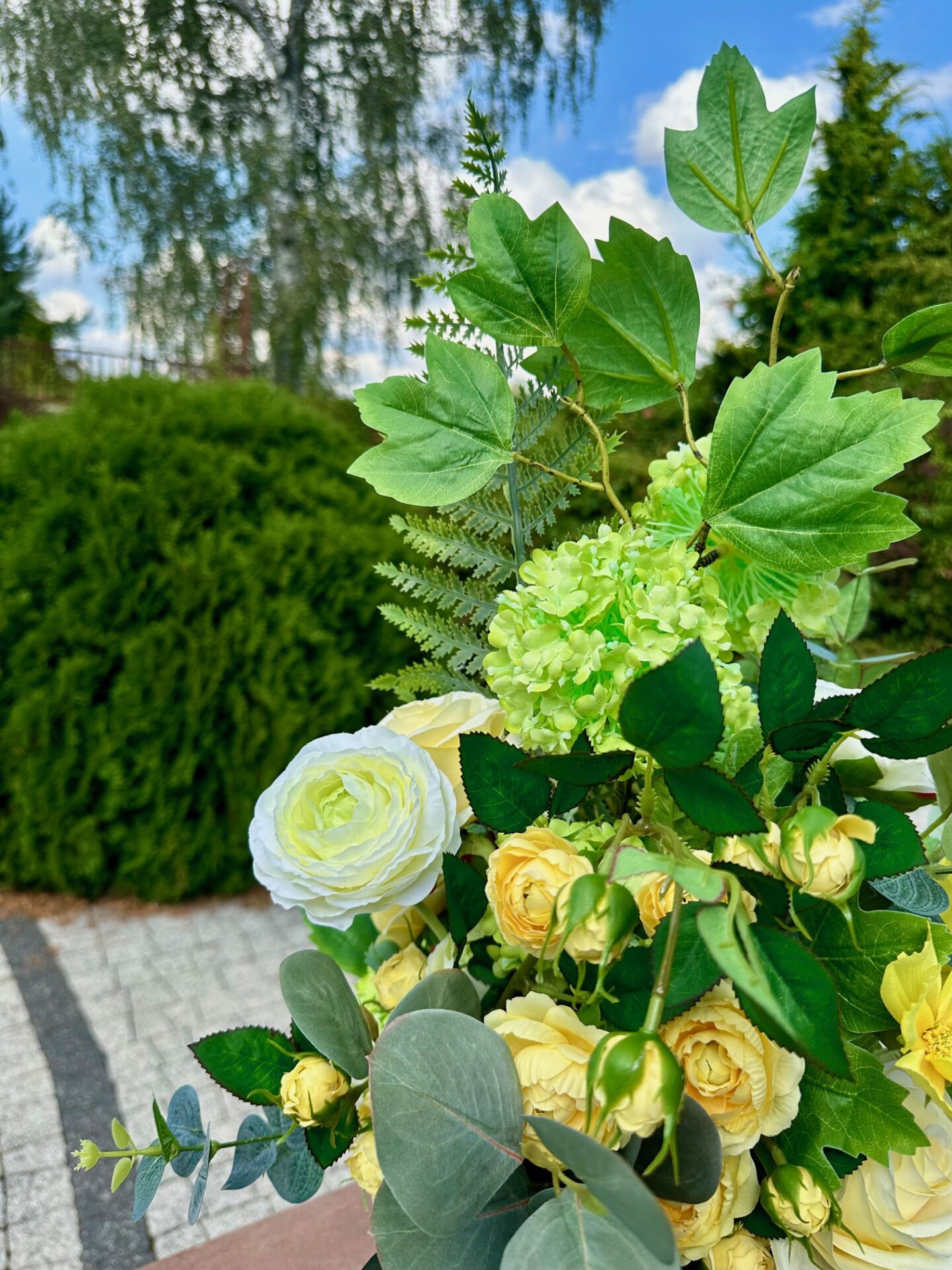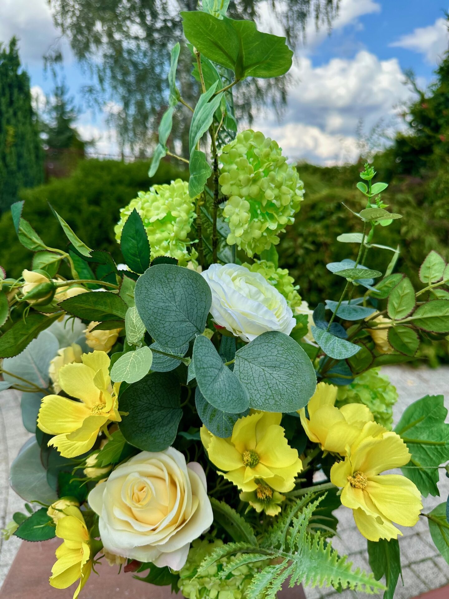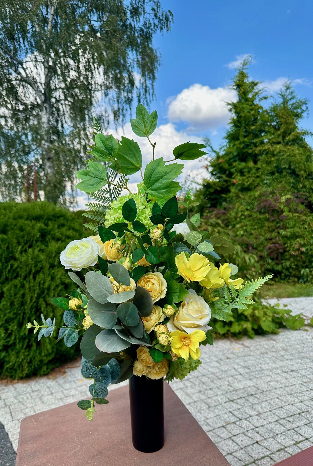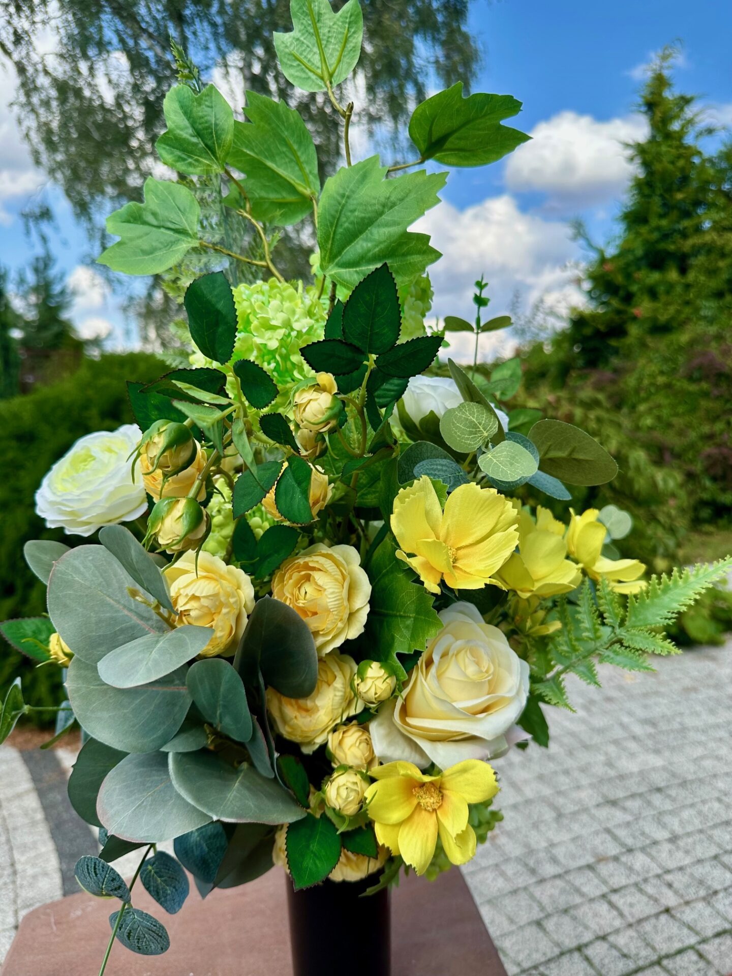 Starannie skomponowany bukiet nagrobny wykonany ze sztucznych kwiatów, osadzonych w solidnym, obciążonym wkładzie do wazonów cmentarnych.
