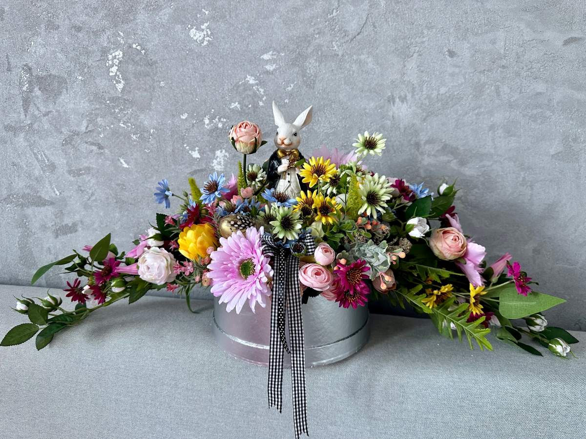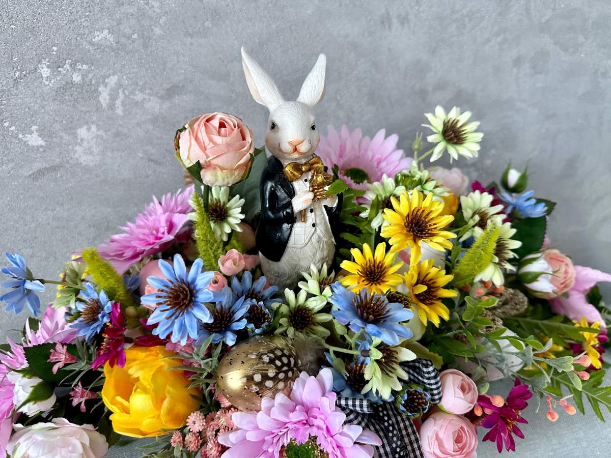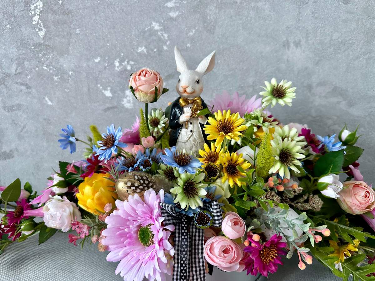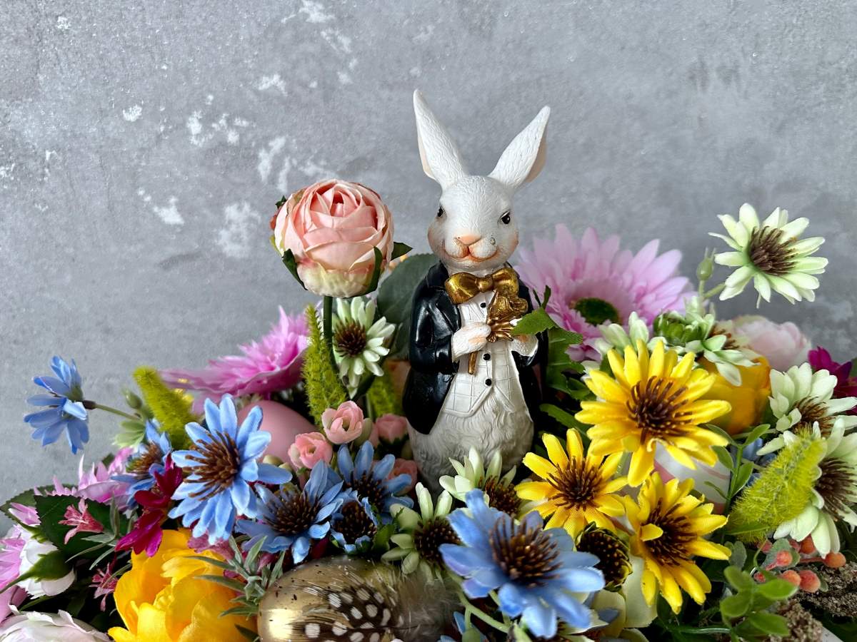 Kompozycja wielkanocna która wprowadzi do Państwa domu świąteczny nastrój. Dekoracja wieloletnia stworzona ze sztucznych roślin. W centrum dekoracji uroczy ceramiczny zając.