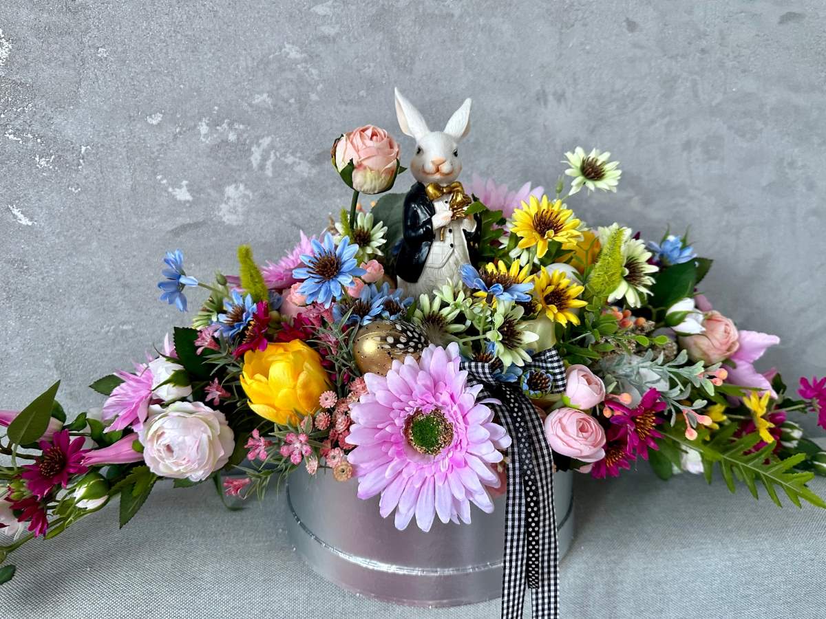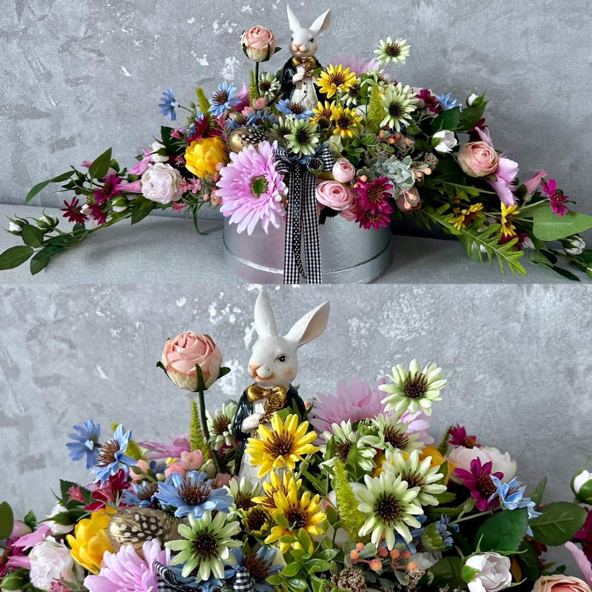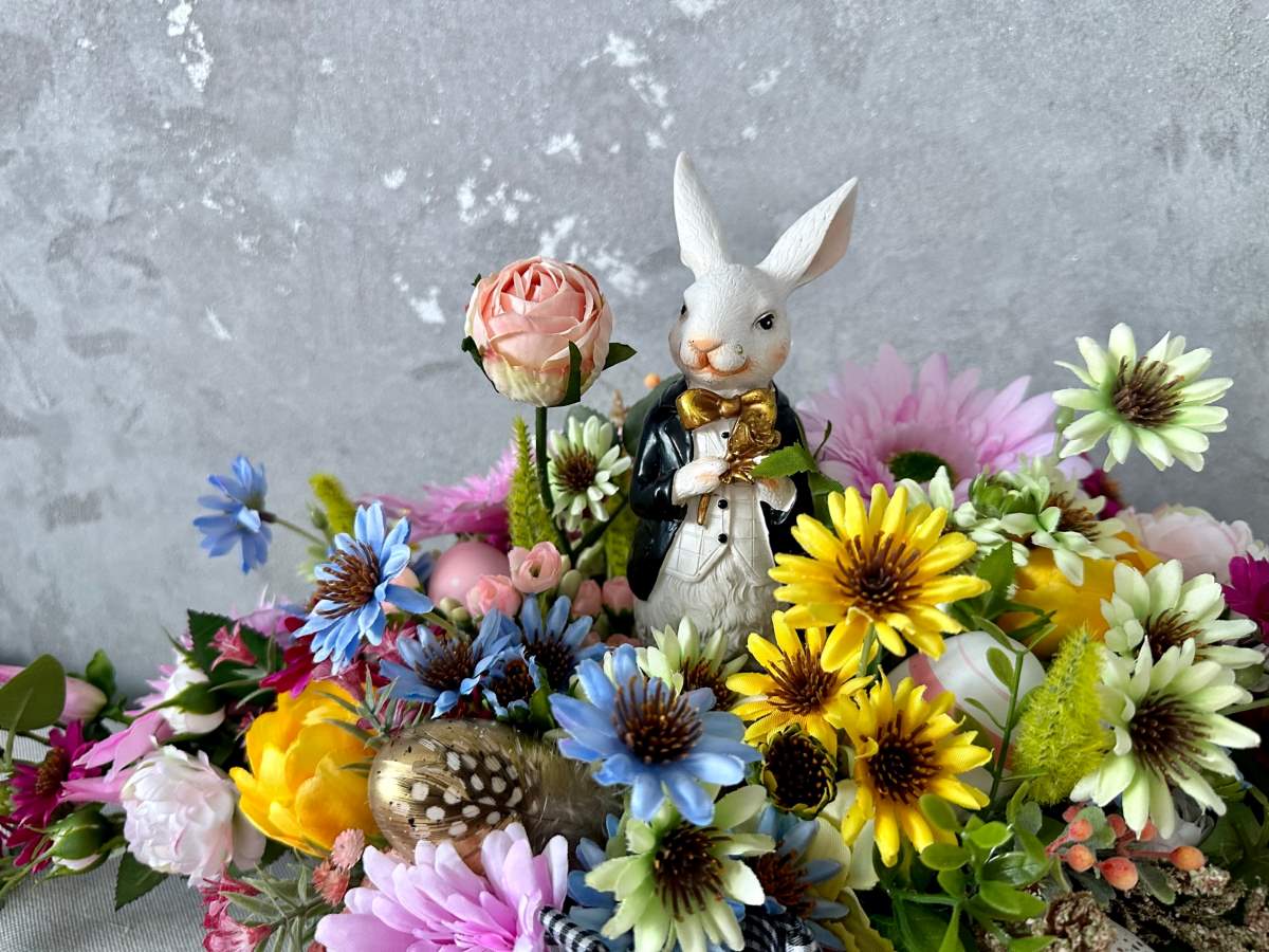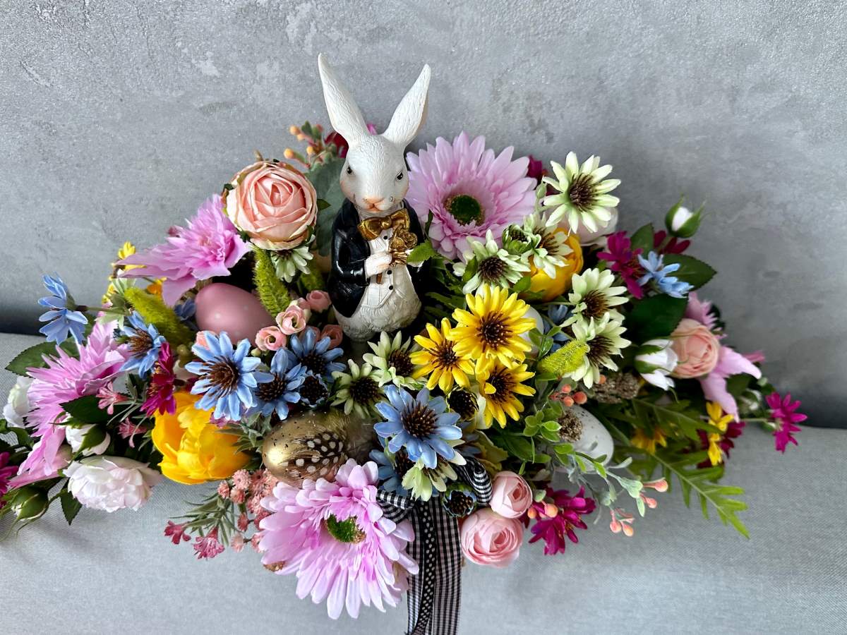 Kompozycja wielkanocna która wprowadzi do Państwa domu świąteczny nastrój. Dekoracja wieloletnia stworzona ze sztucznych roślin. W centrum dekoracji uroczy ceramiczny zając.