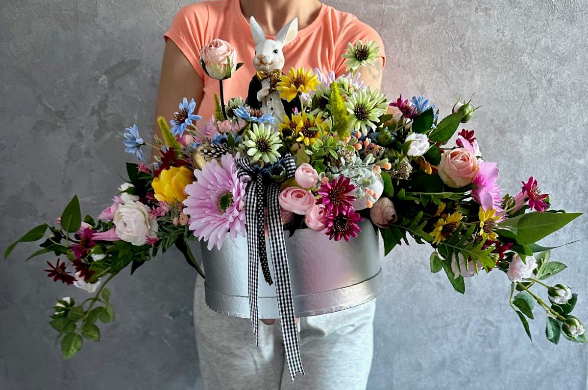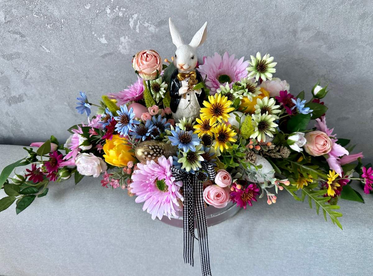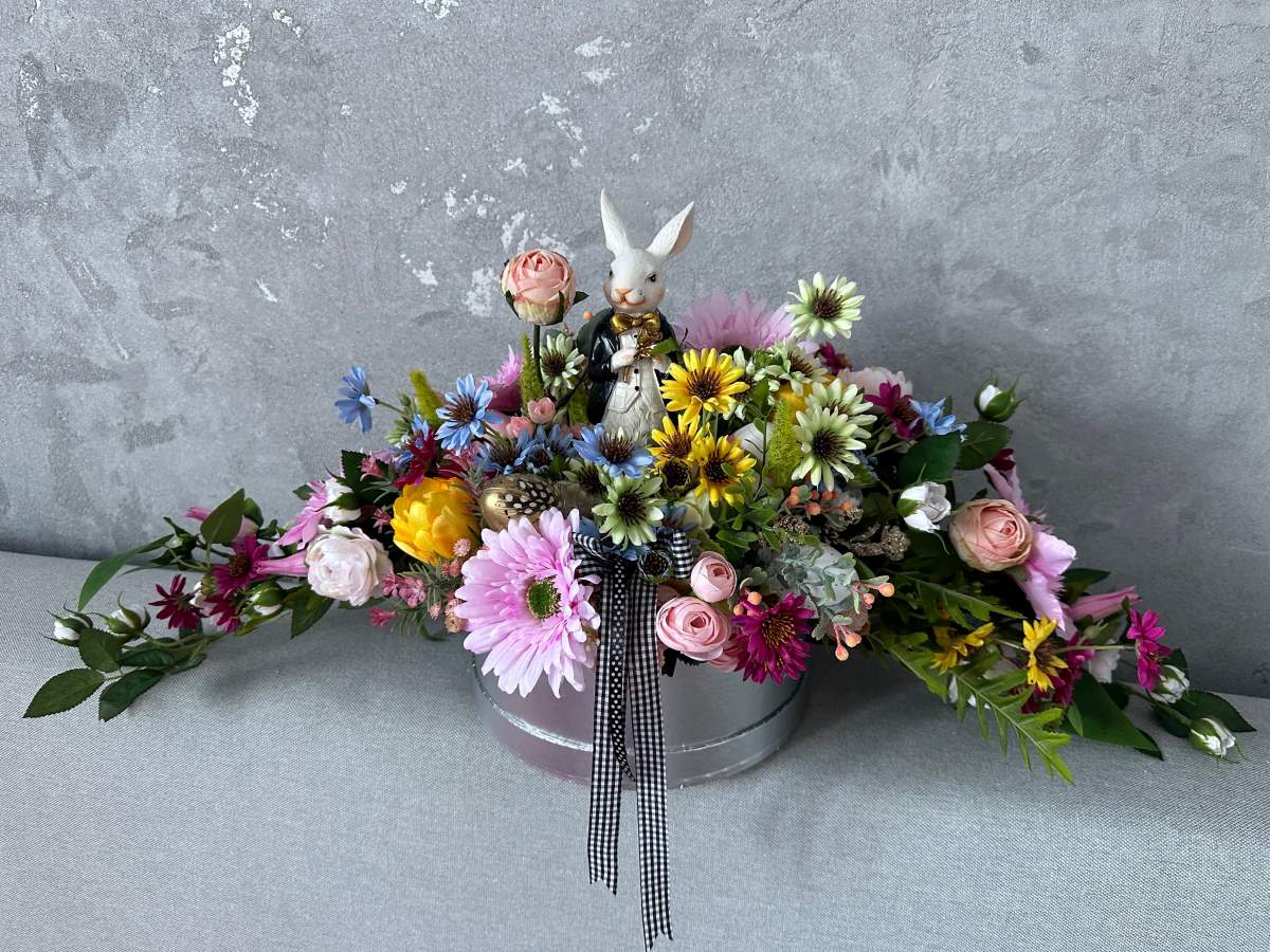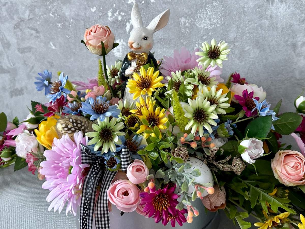 Kompozycja wielkanocna która wprowadzi do Państwa domu świąteczny nastrój. Dekoracja wieloletnia stworzona ze sztucznych roślin. W centrum dekoracji uroczy ceramiczny zając.