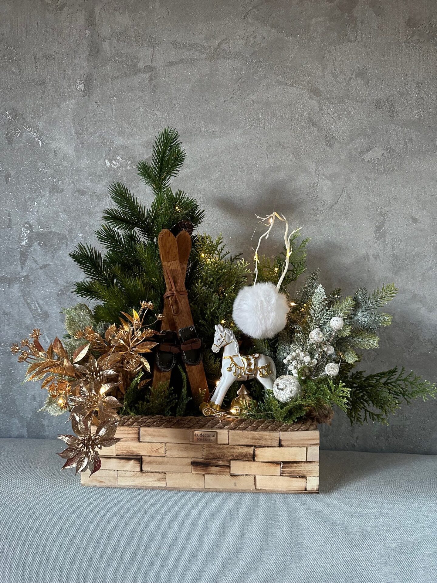 W centralnym punkcie dekoracji znajduje się uroczy ceramiczny koń na biegunach – symbol dziecięcej radości i tradycyjnych świątecznych wspomnień. Obok niego umieszczono piękne, drewniane narty, które podkreślają zimowy klimat aranżacji i nadają jej niepowtarzalnego uroku.