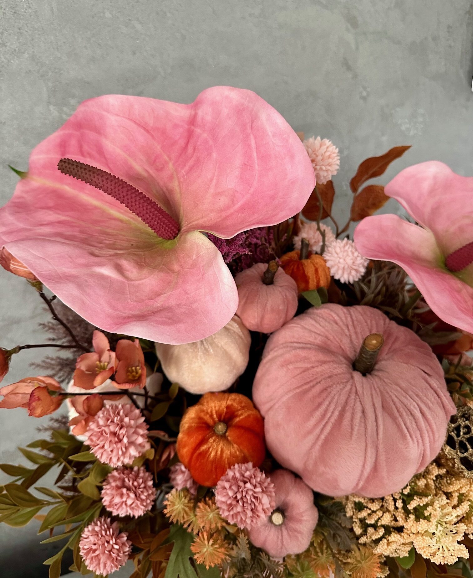 Cudowna duża dekoracja kwiatowa na stół lub komodę. Mieszanka różnorodnych roślin ułożonych w eleganckim flowerboxie . Dekoracja przygotowana przy użyciu starannie dobranych, wysokiej jakości ,trwałych sztucznych kwiatów. Kompozycja uzupełniona welurowymi dyniami.