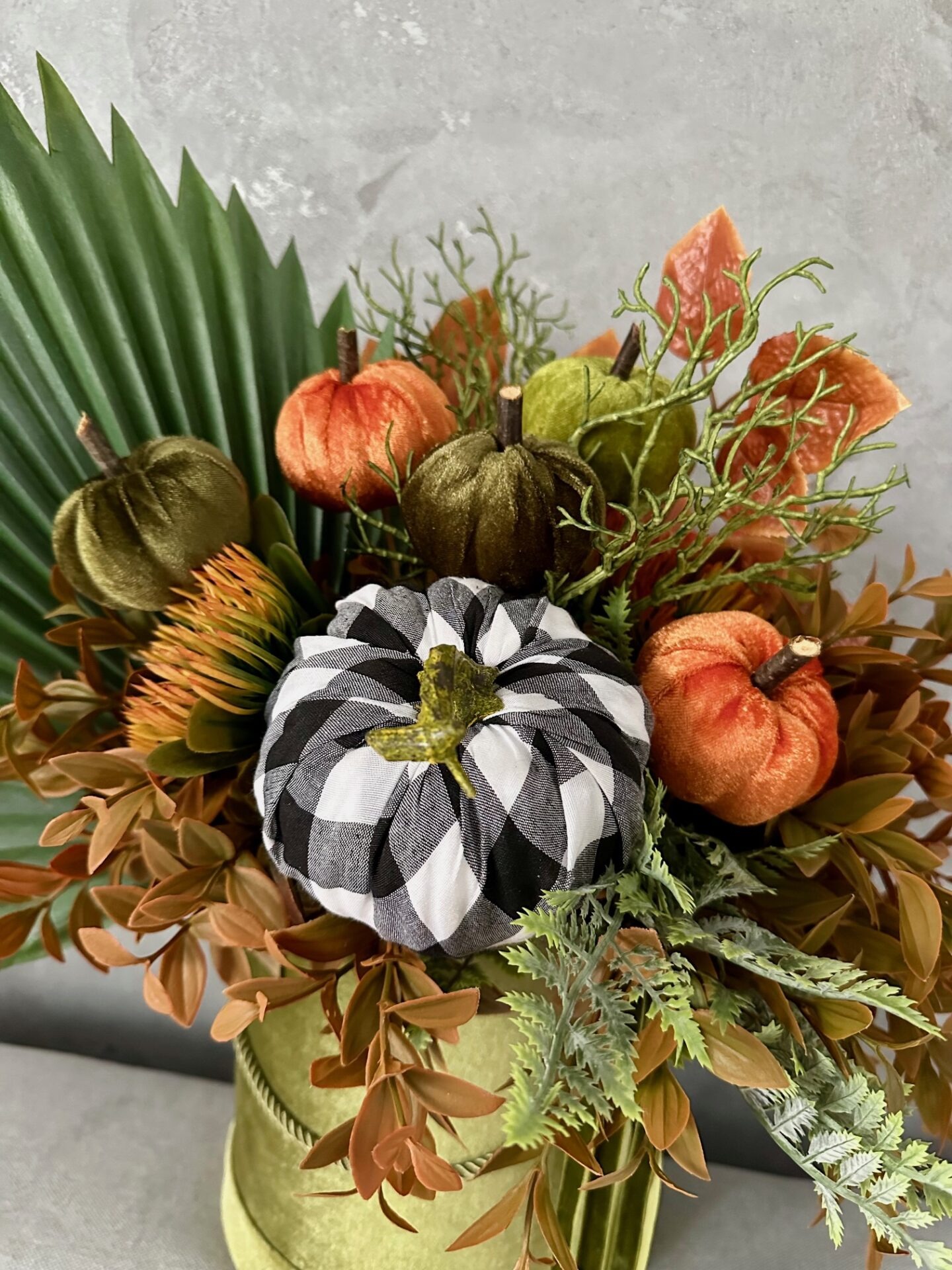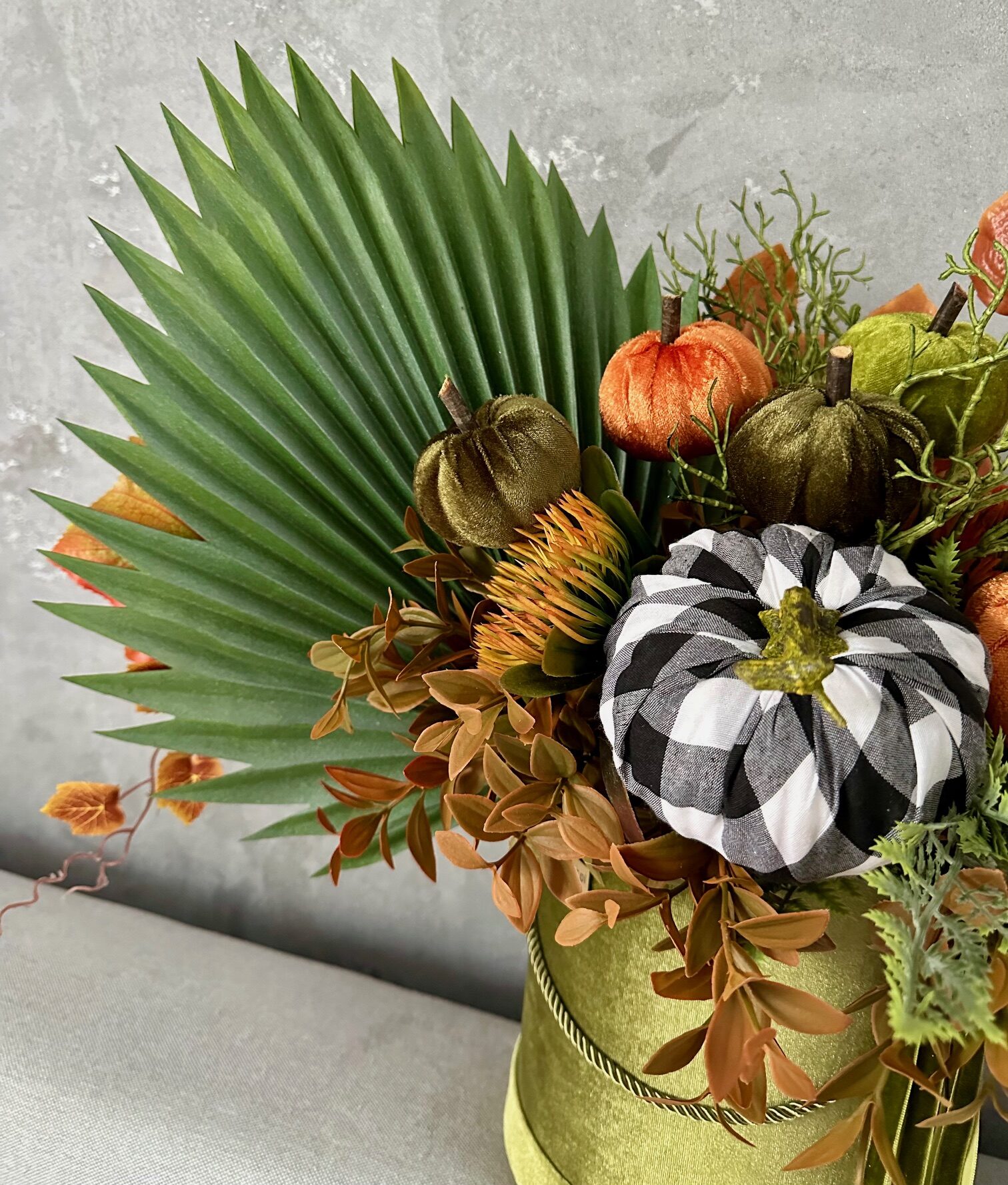 Cudowna duża dekoracja kwiatowa na stół lub komodę. Mieszanka różnorodnych roślin ułożonych w eleganckim flowerboxie . Dekoracja przygotowana przy użyciu starannie dobranych, wysokiej jakości ,trwałych sztucznych kwiatów. Kompozycja została uzupełniona dyniami i tasiemkami.