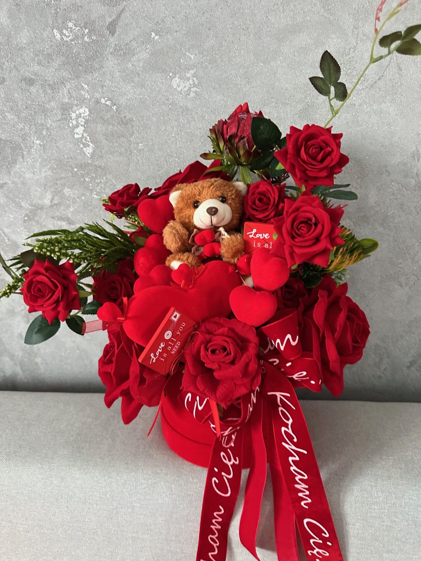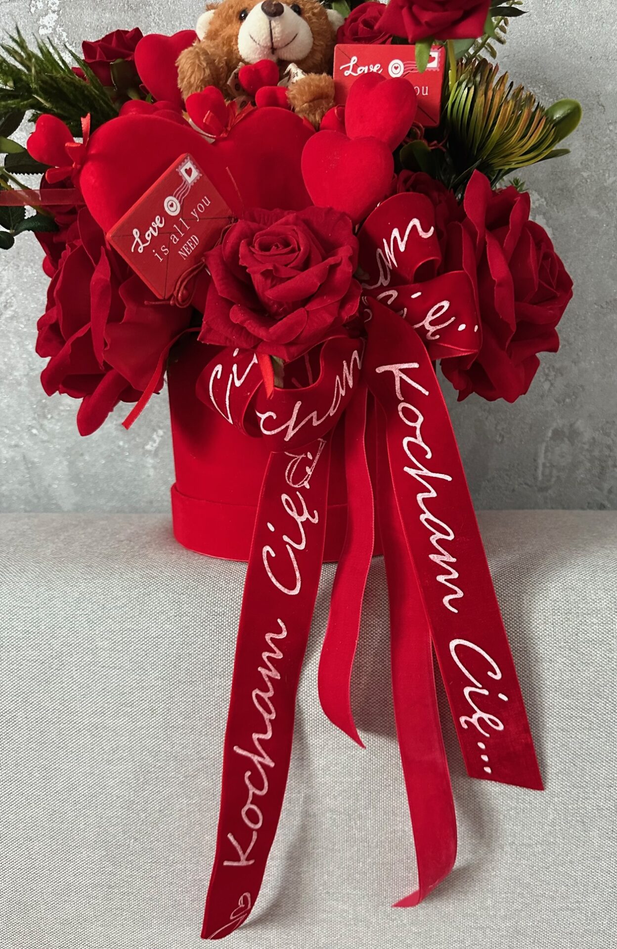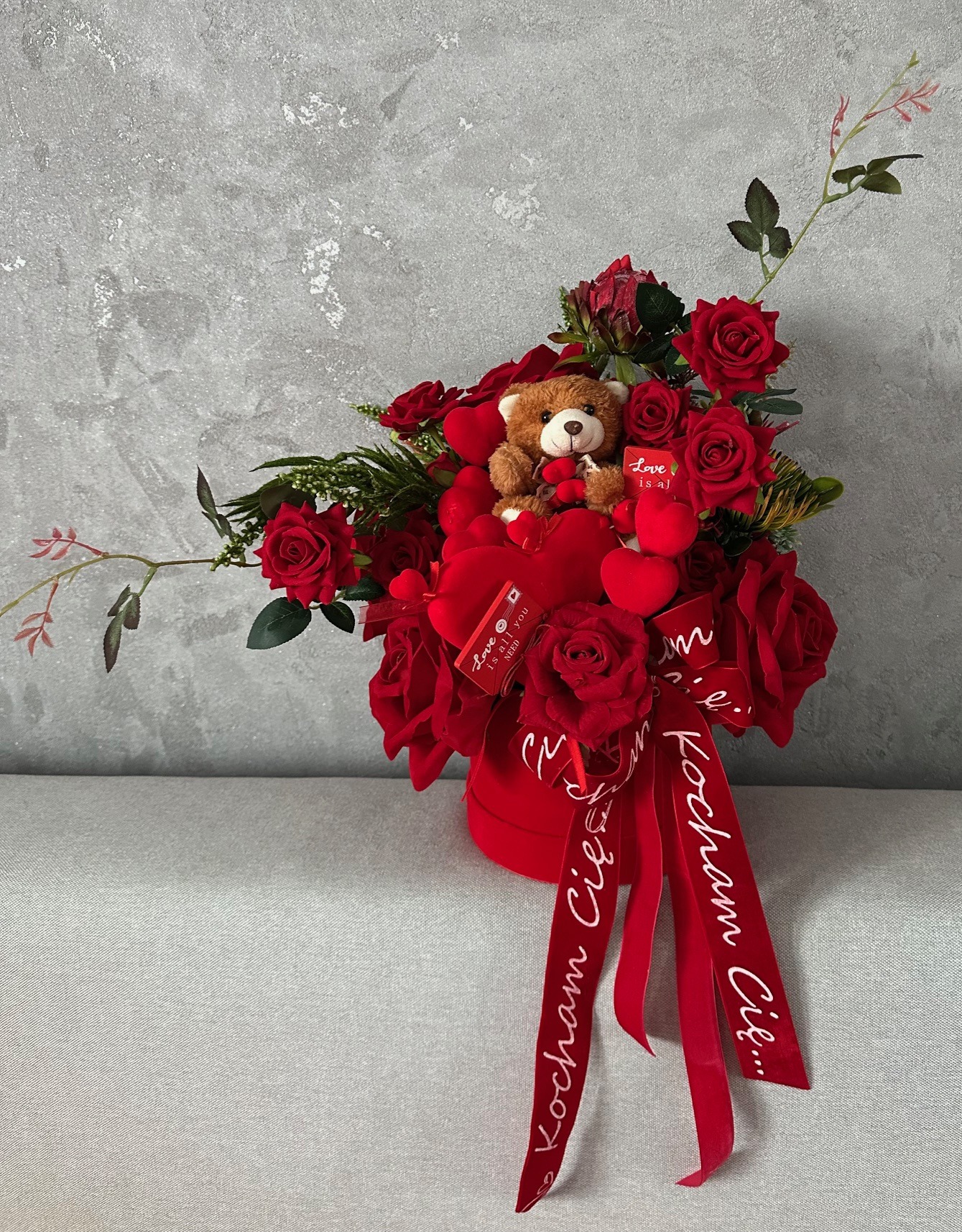 Dekoracja walentynkowa zachwyca elegancją oraz wyrazistym, romantycznym charakterem i barwą. Całość została umieszczona w luksusowym czarnym welurowym pudełku, które podkreśla wyjątkowość kompozycji. W centrum znajduje się uroczy pluszowy miś – symbol czułości i miłości. Dekorację wypełniają intensywnie czerwone welurowe róże, uzupełnione innymi kwiatami oraz ozdobnymi sercami, które nadają całości zmysłowego i walentynkowego klimatu. To efektowny, pełen emocji prezent, idealny na Walentynki, który zachwyci i pozostanie piękną pamiątką na długo.