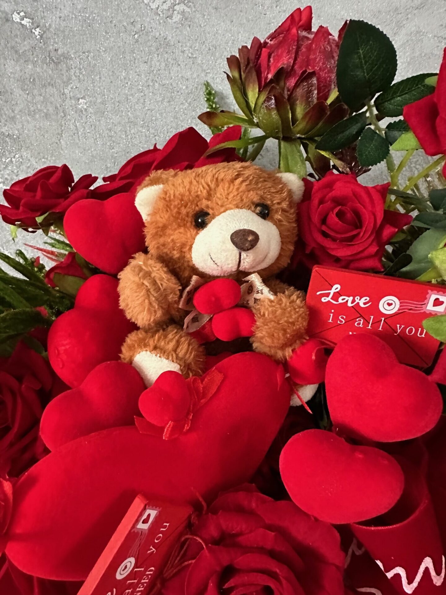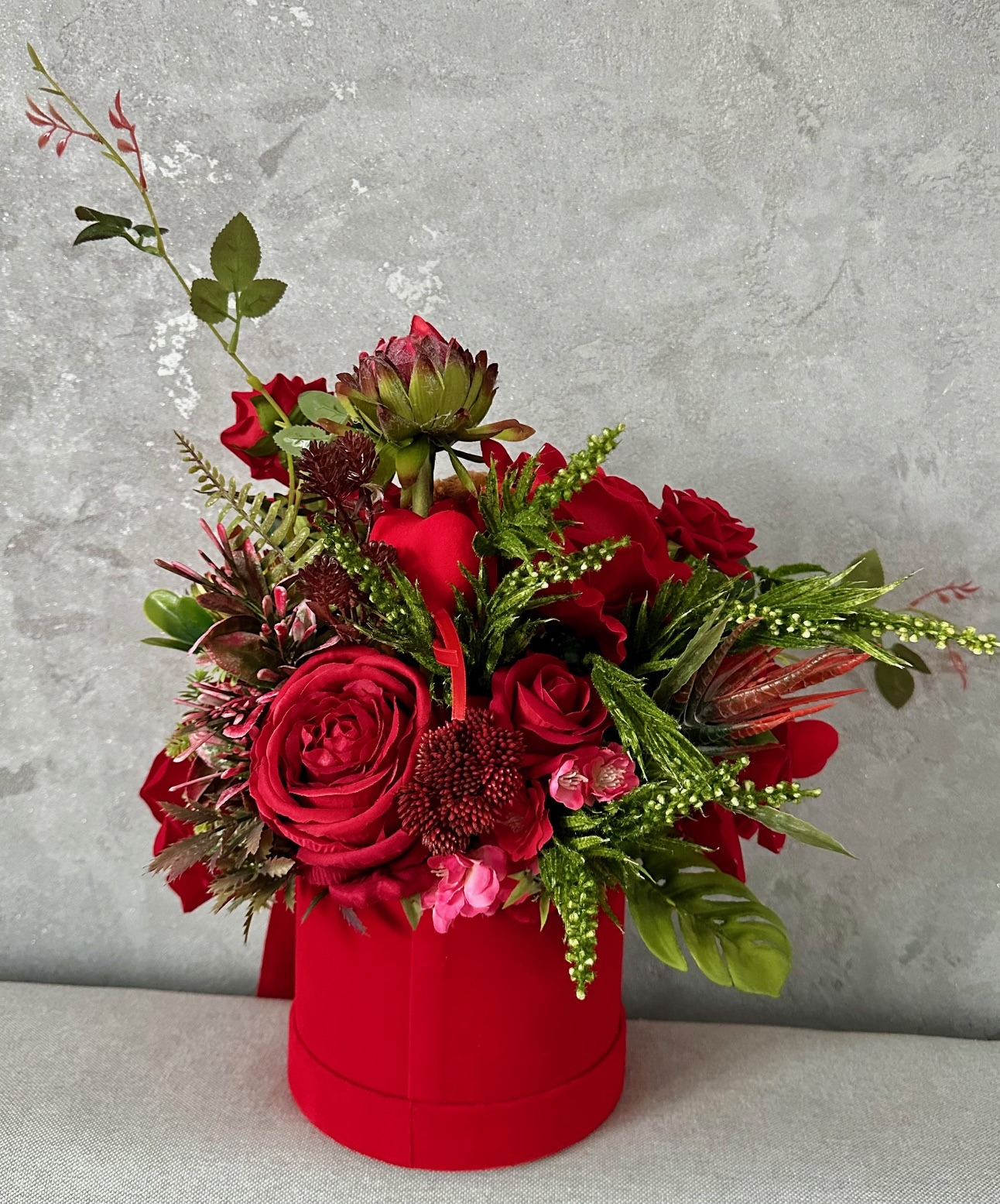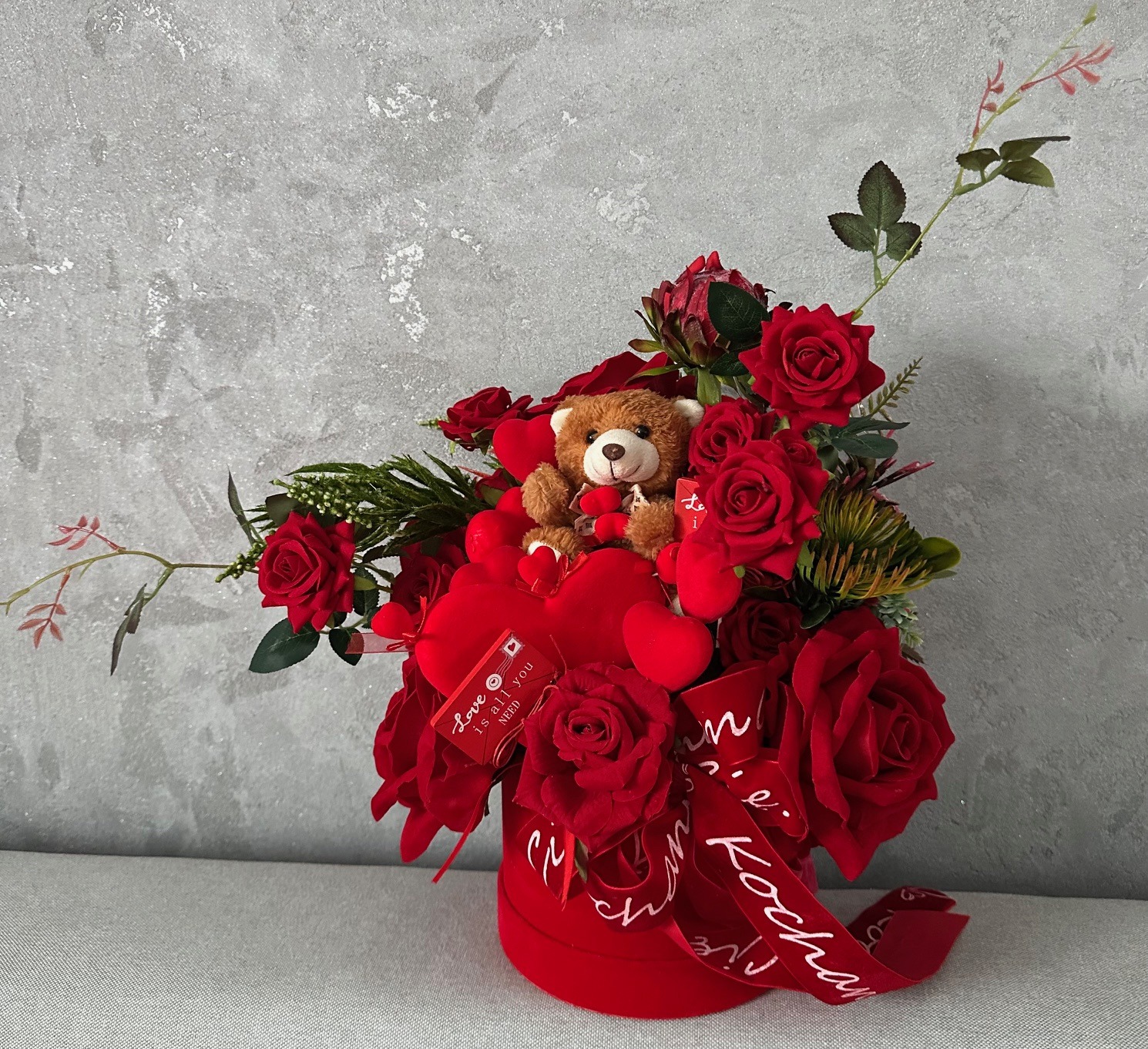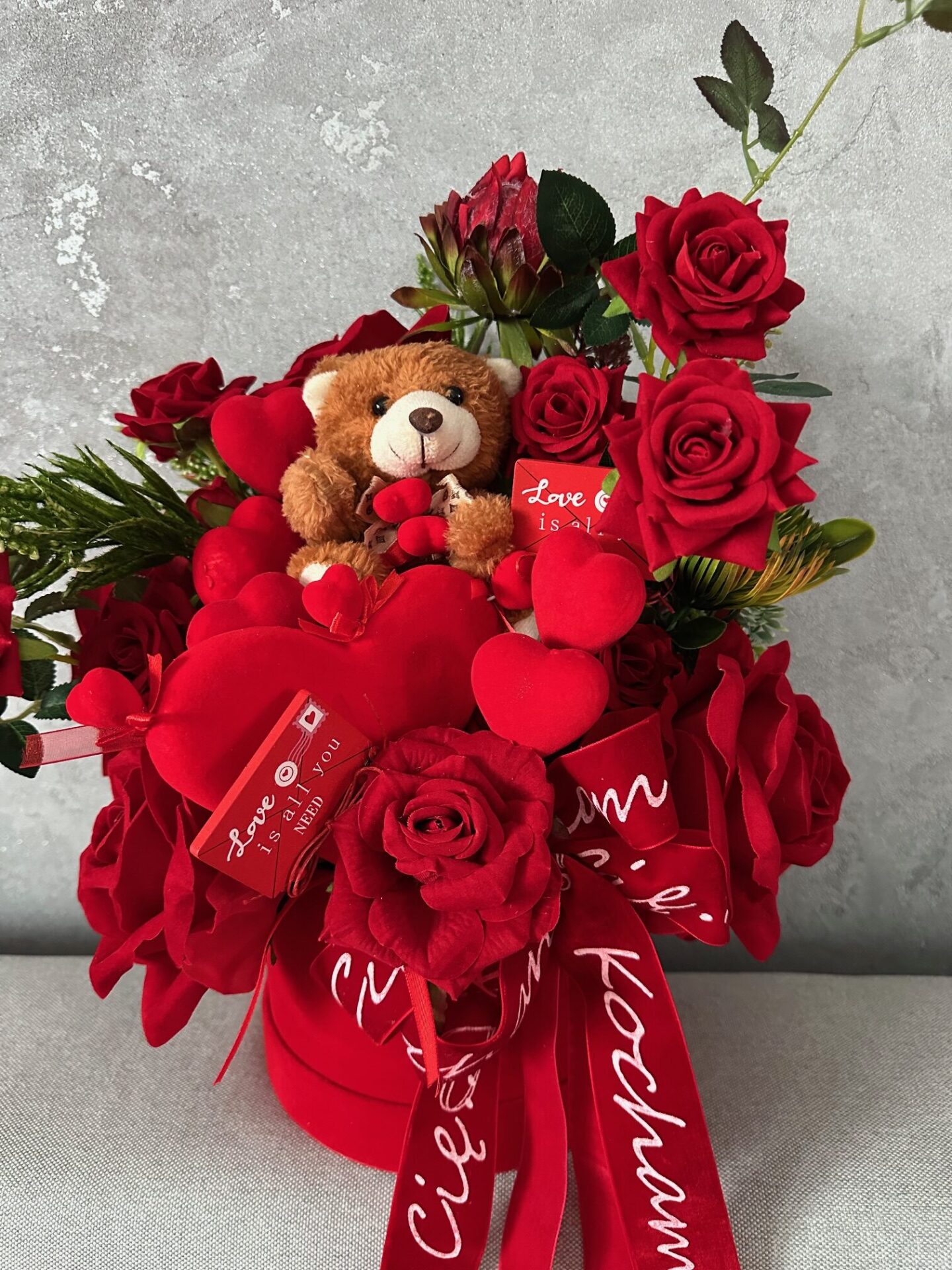 Dekoracja walentynkowa zachwyca elegancją oraz wyrazistym, romantycznym charakterem i barwą. Całość została umieszczona w luksusowym czarnym welurowym pudełku, które podkreśla wyjątkowość kompozycji. W centrum znajduje się uroczy pluszowy miś – symbol czułości i miłości. Dekorację wypełniają intensywnie czerwone welurowe róże, uzupełnione innymi kwiatami oraz ozdobnymi sercami, które nadają całości zmysłowego i walentynkowego klimatu. To efektowny, pełen emocji prezent, idealny na Walentynki, który zachwyci i pozostanie piękną pamiątką na długo.