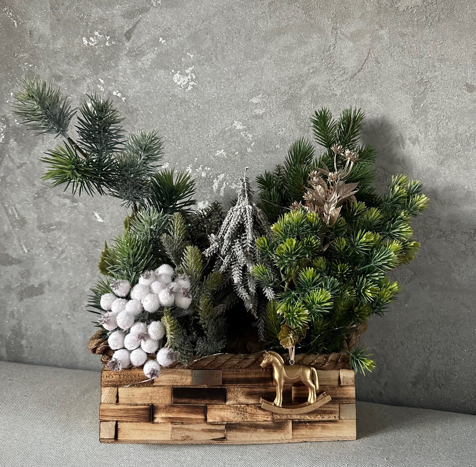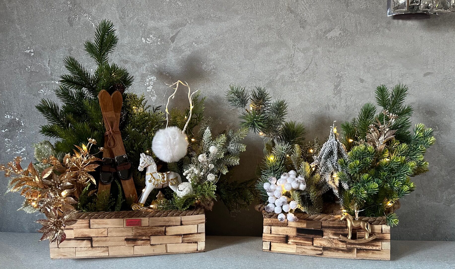 W centralnym punkcie jednej z dekoracji znajduje się uroczy ceramiczny koń na biegunach – symbol dziecięcej radości i tradycyjnych świątecznych wspomnień. Obok niego umieszczono piękne, drewniane narty, które podkreślają zimowy klimat aranżacji i nadają jej niepowtarzalnego uroku.
