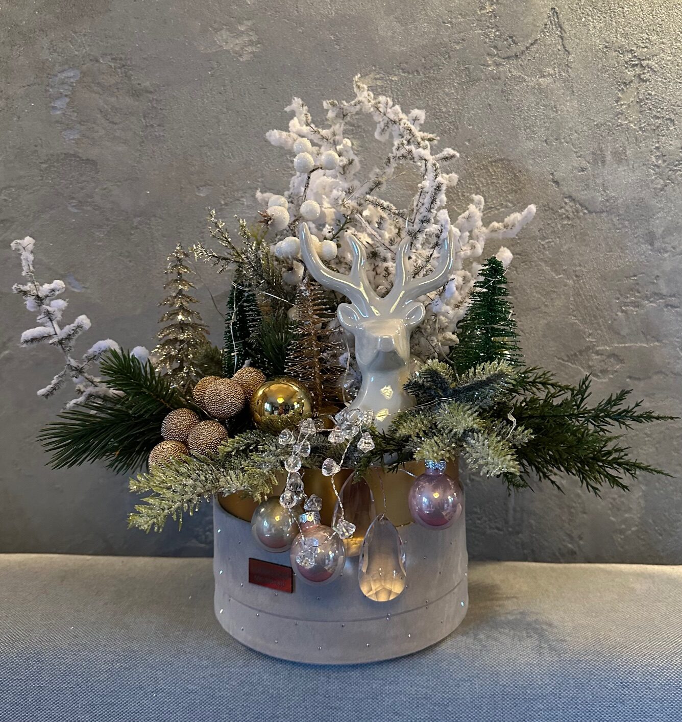 Stroik świąteczny to elegancka dekoracja, która łączy w sobie klasyczną świąteczną atmosferę z nutą nowoczesnego designu. Kompozycja została osadzona w miękkim, welurowym pudełku, którego przyjemna faktura dodaje całości luksusowego charakteru.