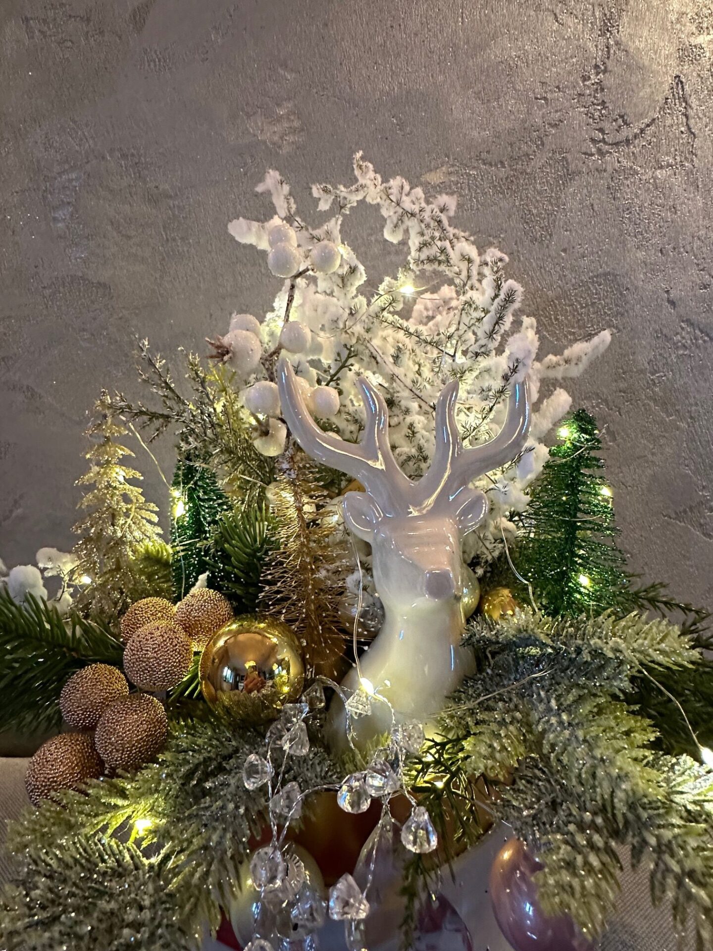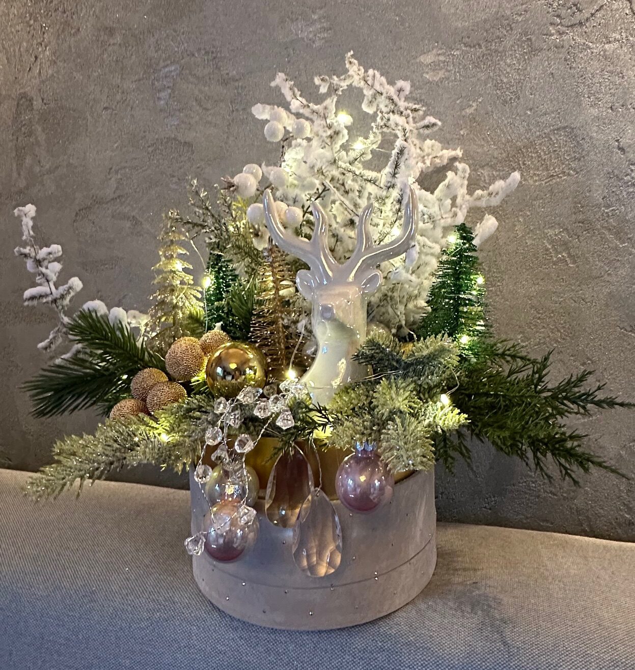 W centralnym punkcie aranżacji znajduje się ceramiczny renifer – subtelna, dopracowana figurka, która przyciąga wzrok i nadaje stroikowi wyjątkowy, baśniowy klimat.