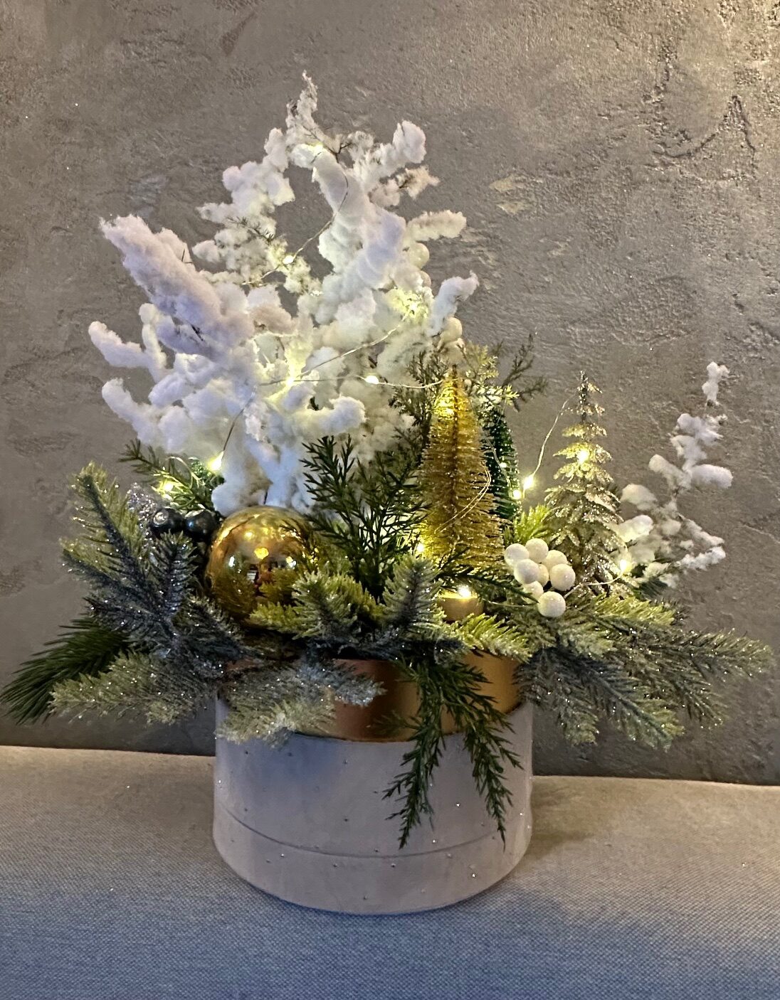 Dekorację uzupełniają połyskujące bombki w harmonijnie dobranej kolorystyce oraz zimowe gałązki. Całość tworzy spójną, świąteczną kompozycję idealną jako ozdoba stołu, komody czy prezent dla bliskiej osoby.