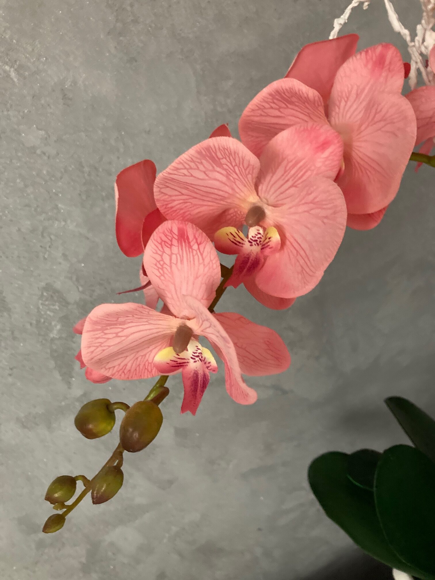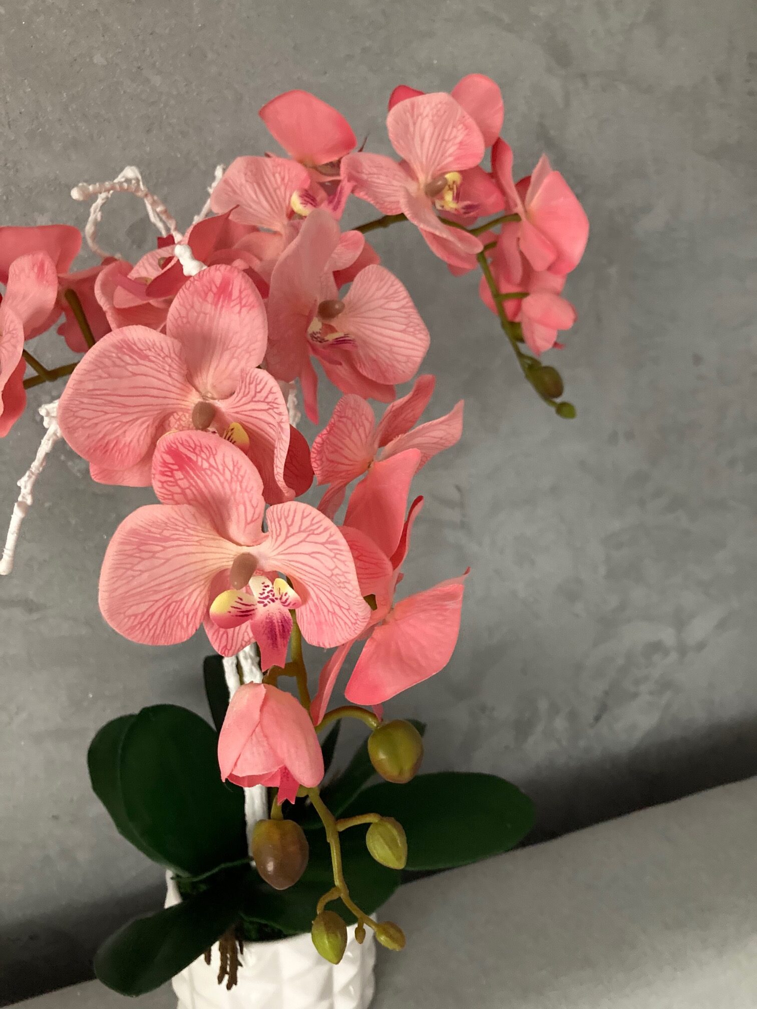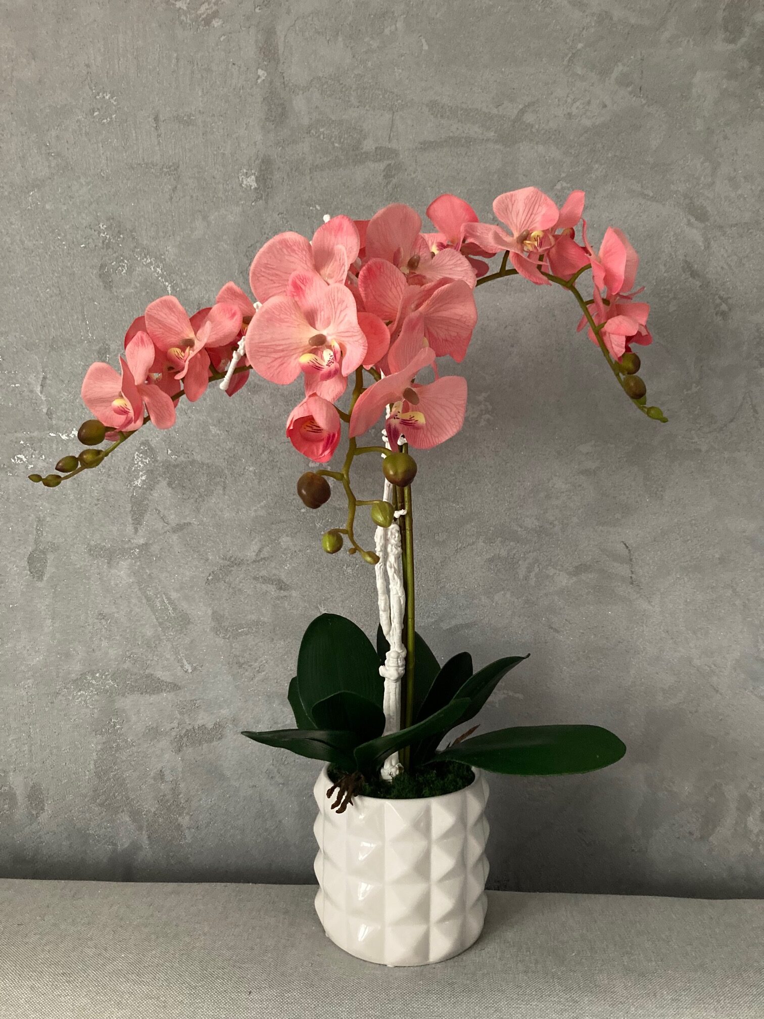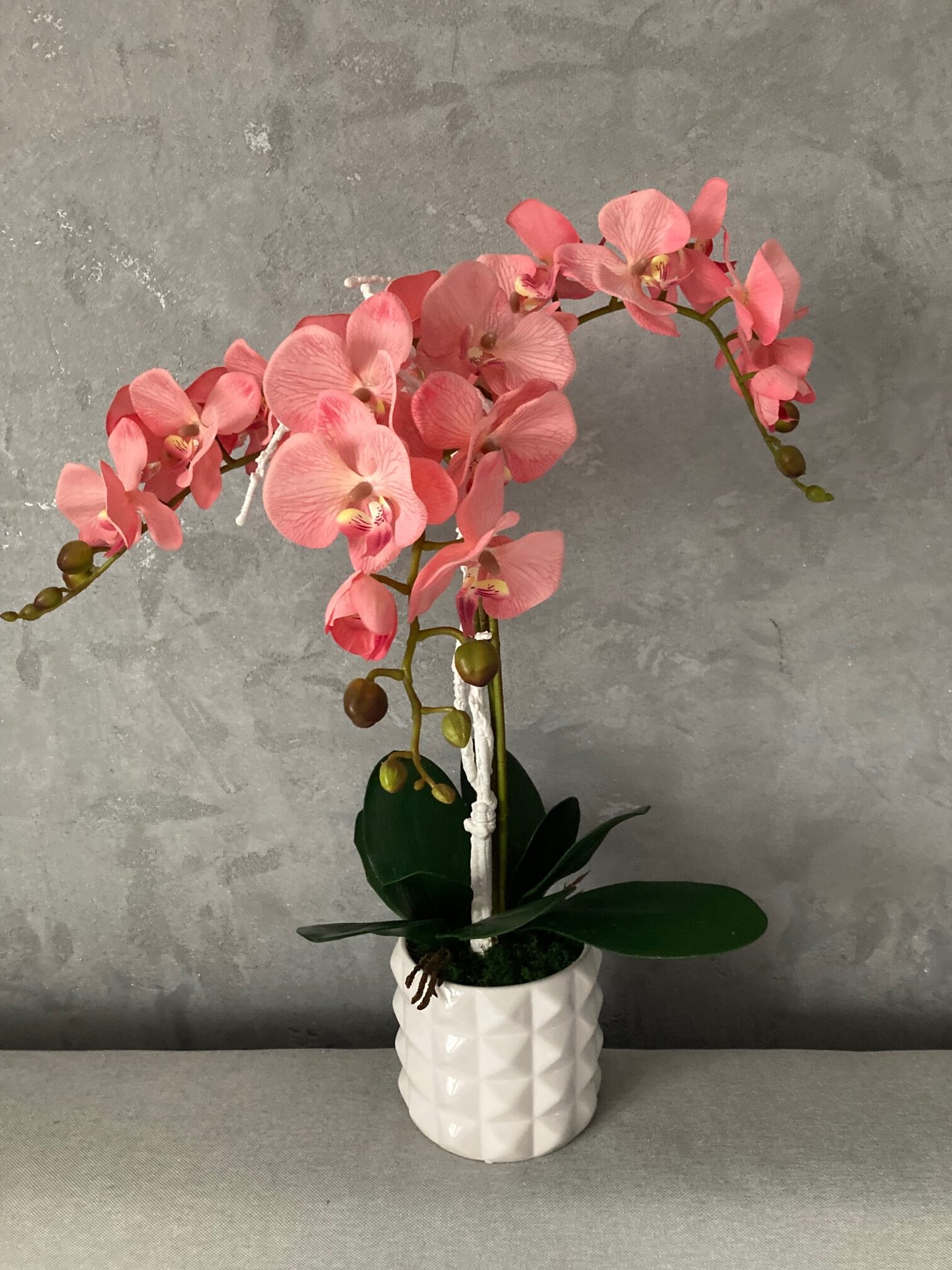 An exceptionally decorative flower arrangement made of artificial orchid flowers. The salmon-colored flowers were placed in a white ceramic pot with green artificial orchid leaves. The pot is finished with moss that completes the whole decoration.