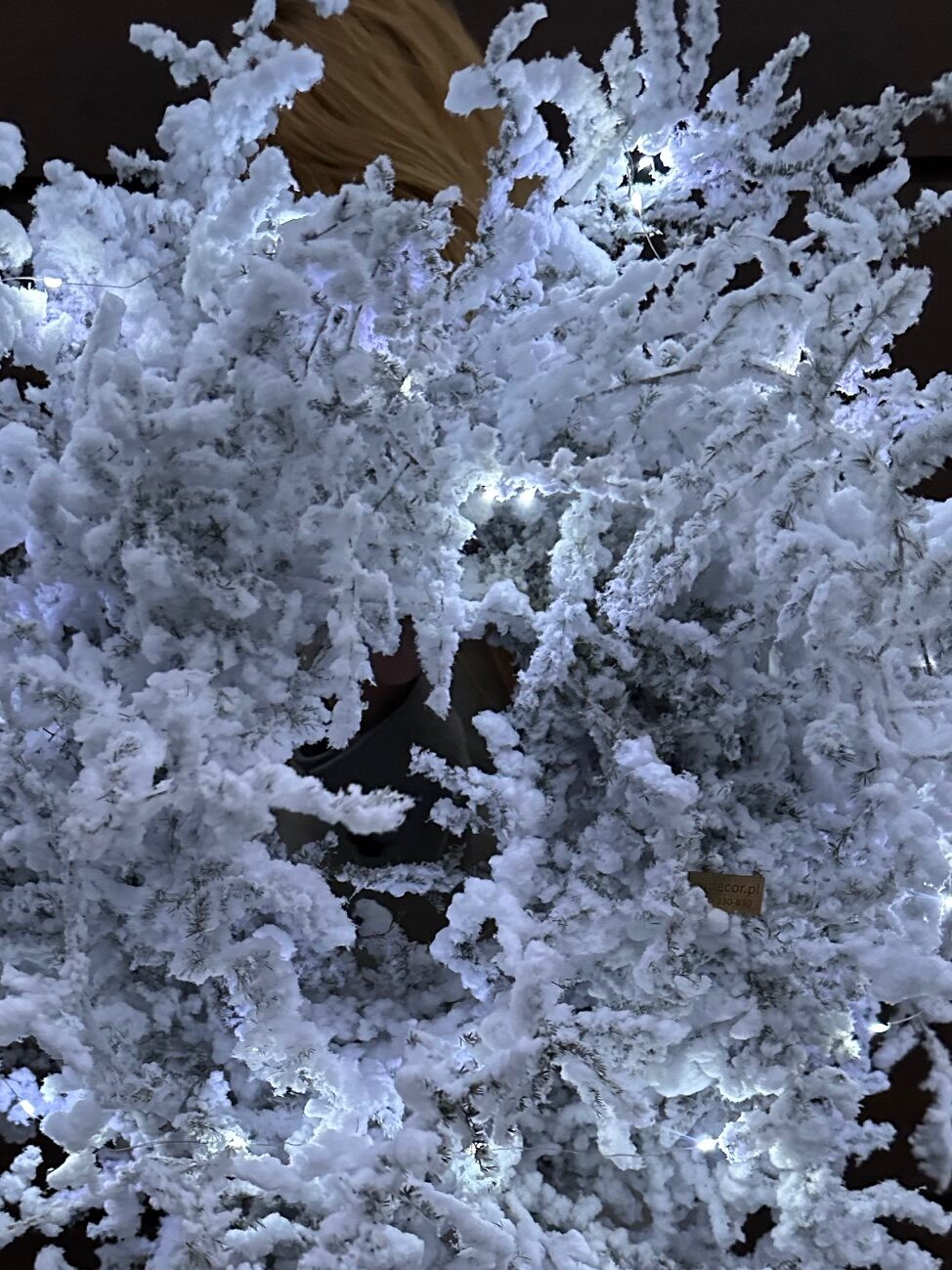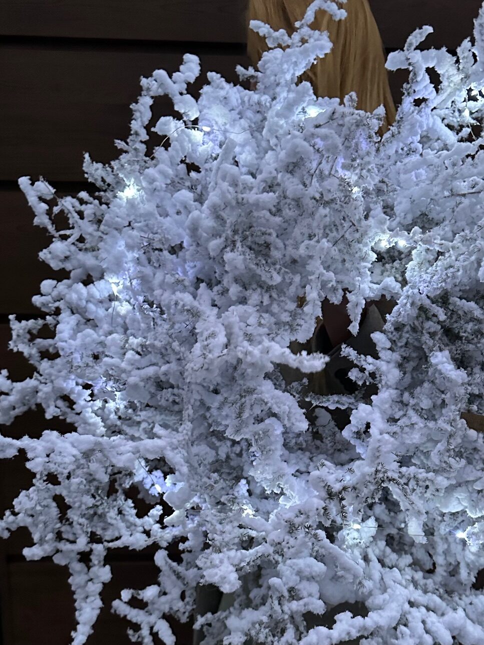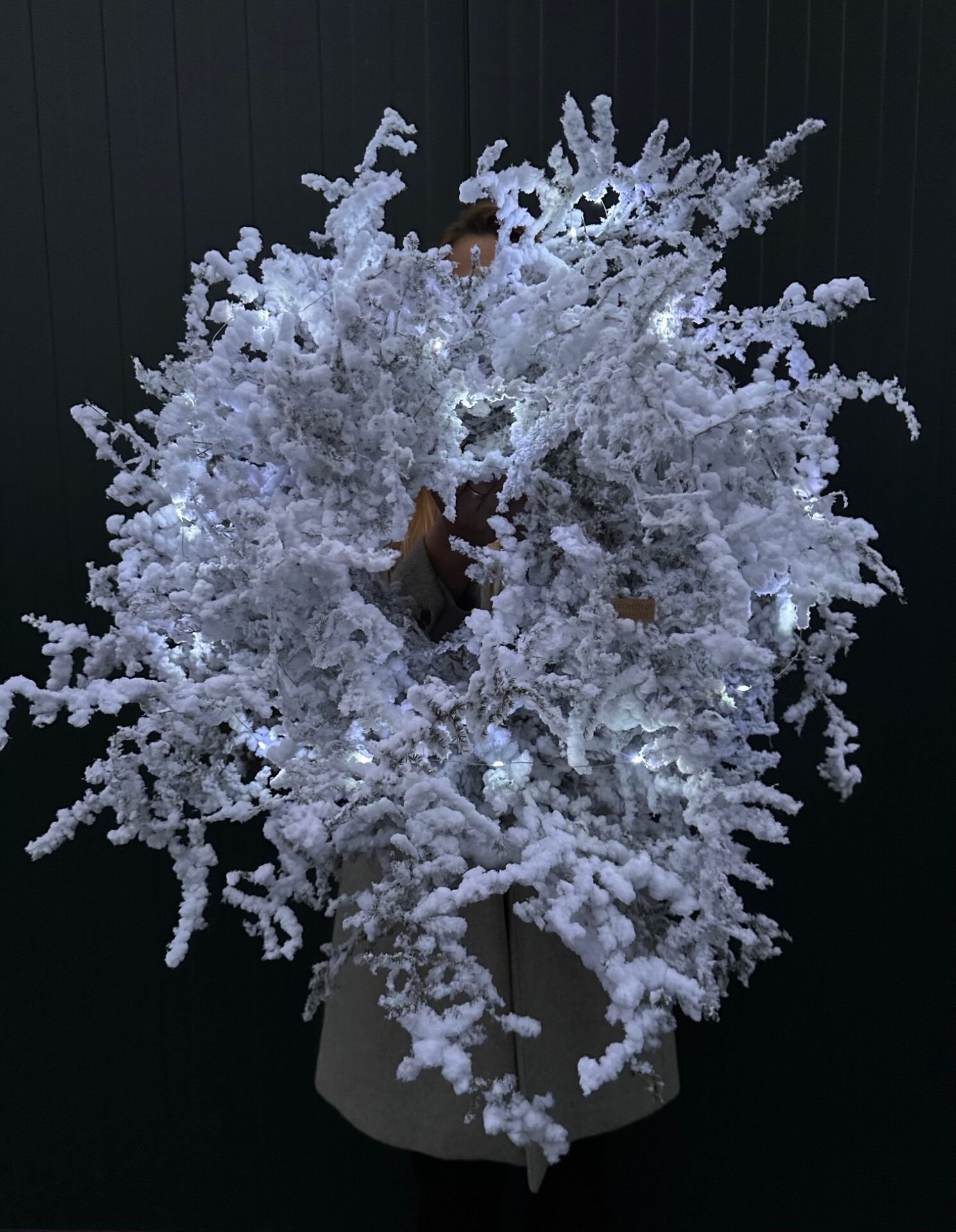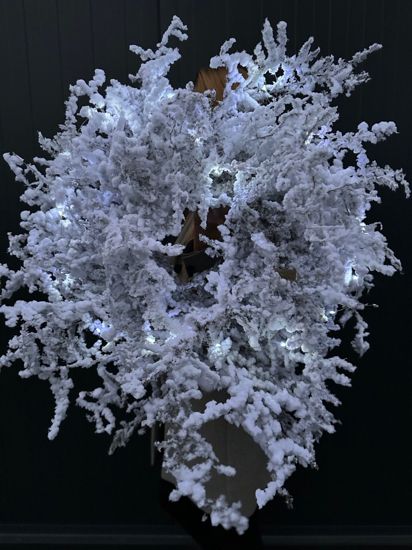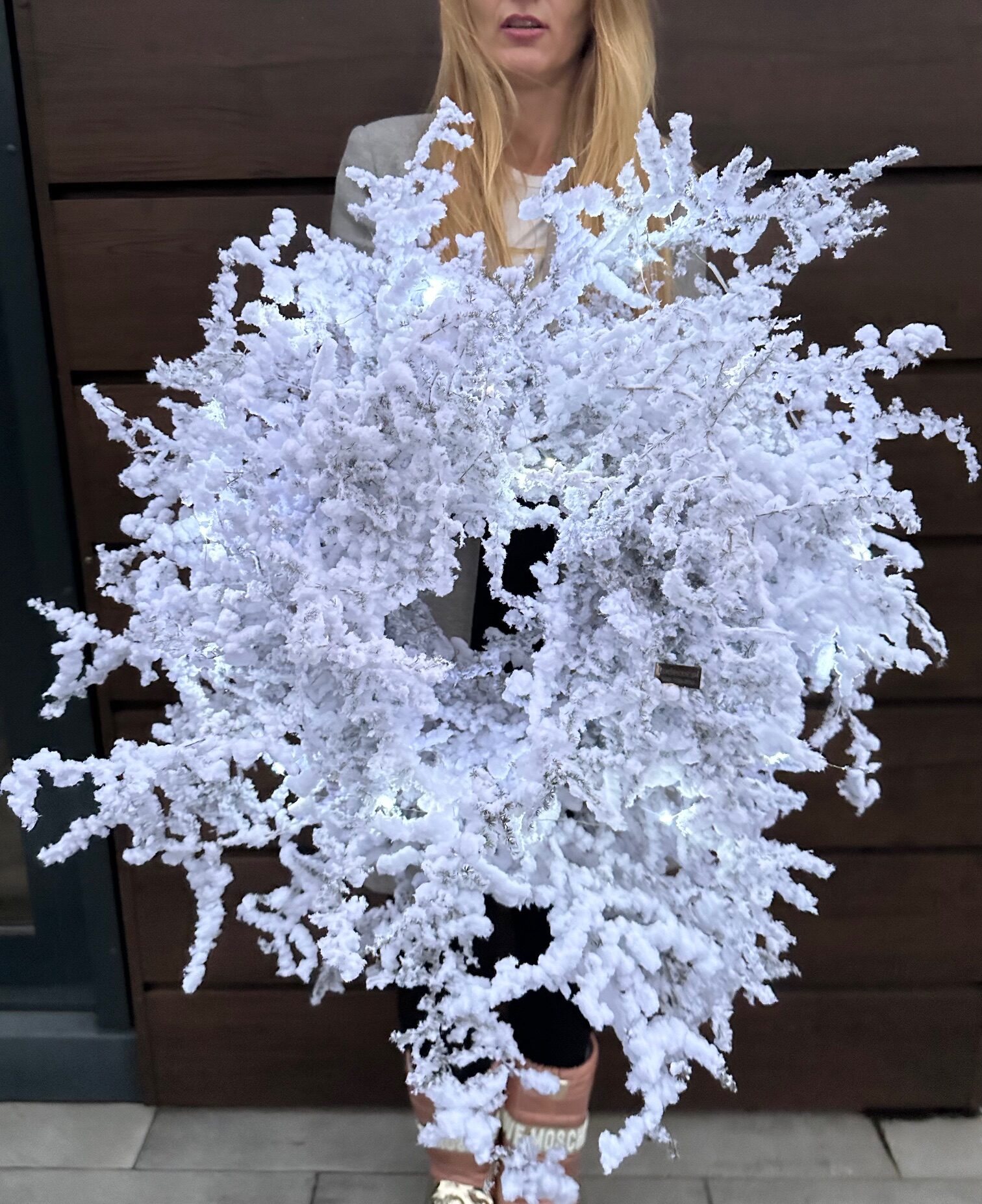 Miękkie, oprószone „śniegiem” gałązki tworzą harmonijną, pełną lekkości kompozycję, która wprowadza do wnętrza atmosferę elegancji i świątecznego ciepła. Wianek doskonale współgra z lampkami — ich blask delikatnie odbija się od białych elementów, tworząc efekt migotliwej, zaczarowanej poświaty.