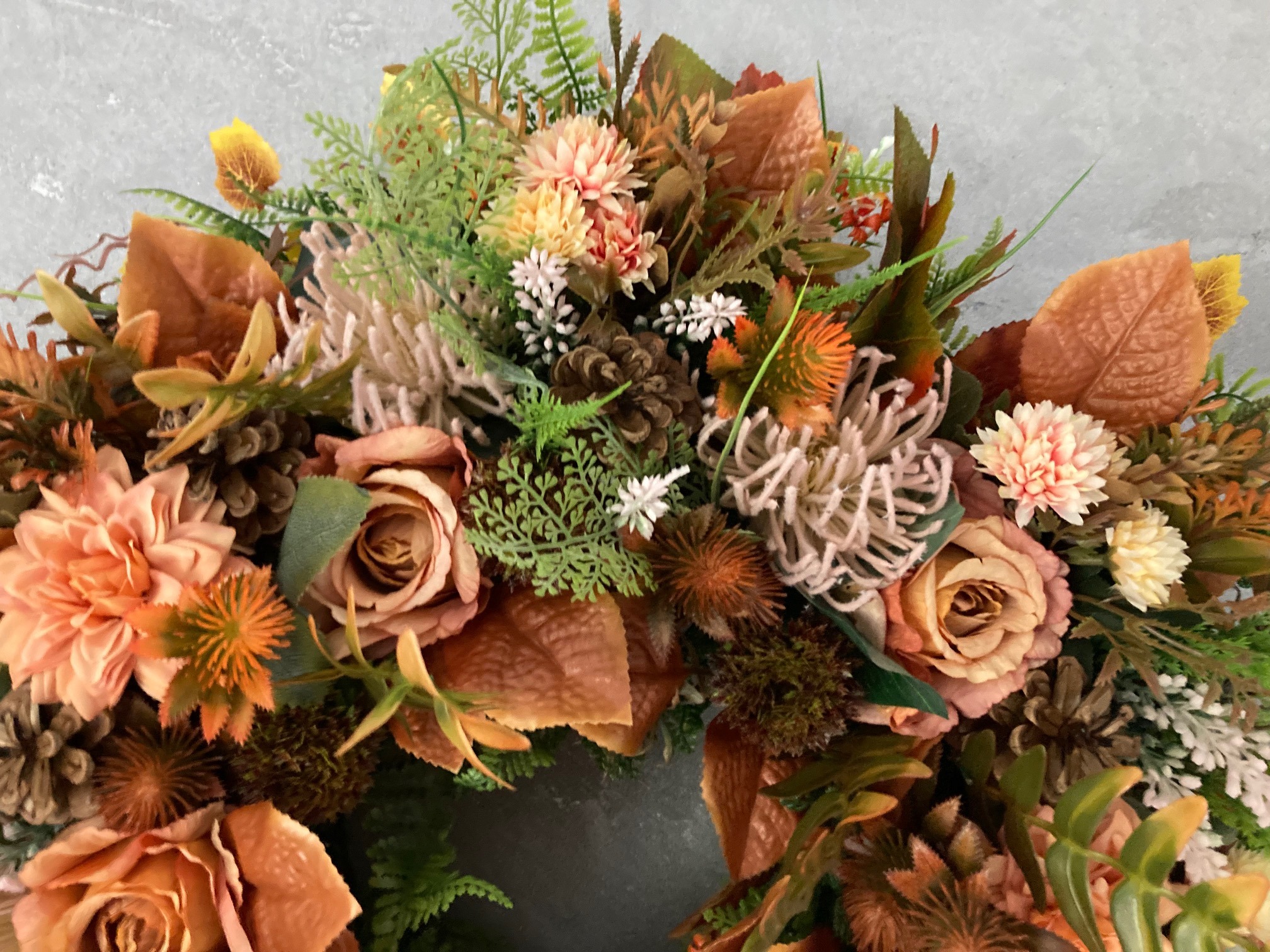Decorative wreath for the door made of selected artificial flowers and autumn accessories. Wreath made in intense autumn colours on a stable base. The wreath is durable, does not require care.