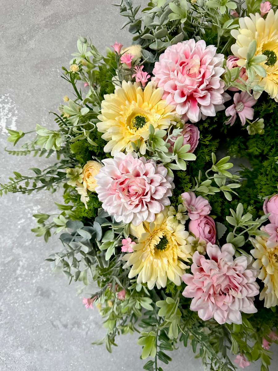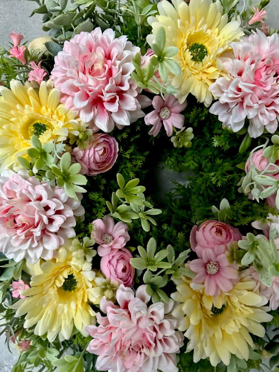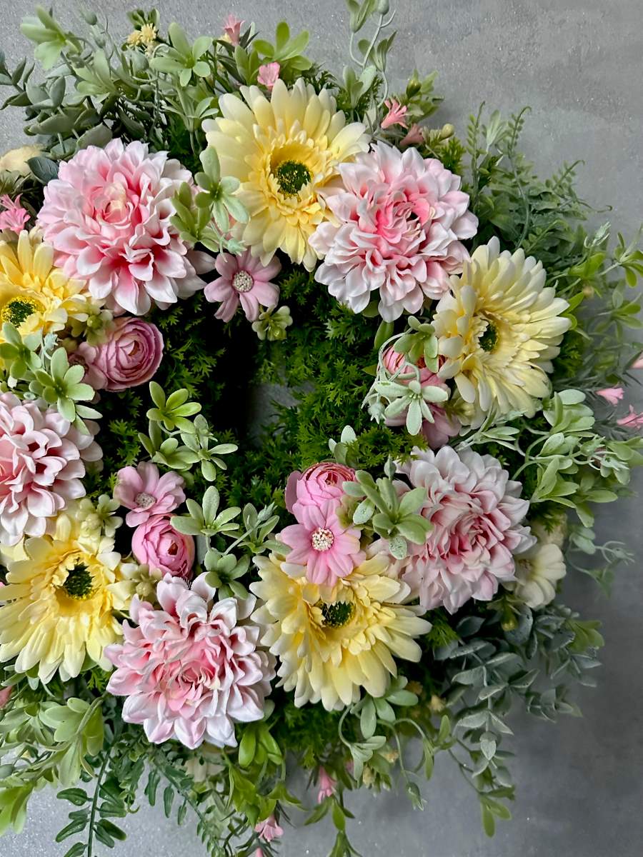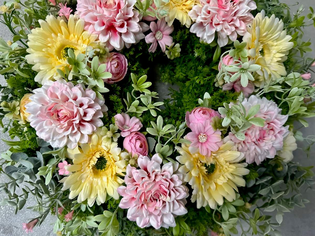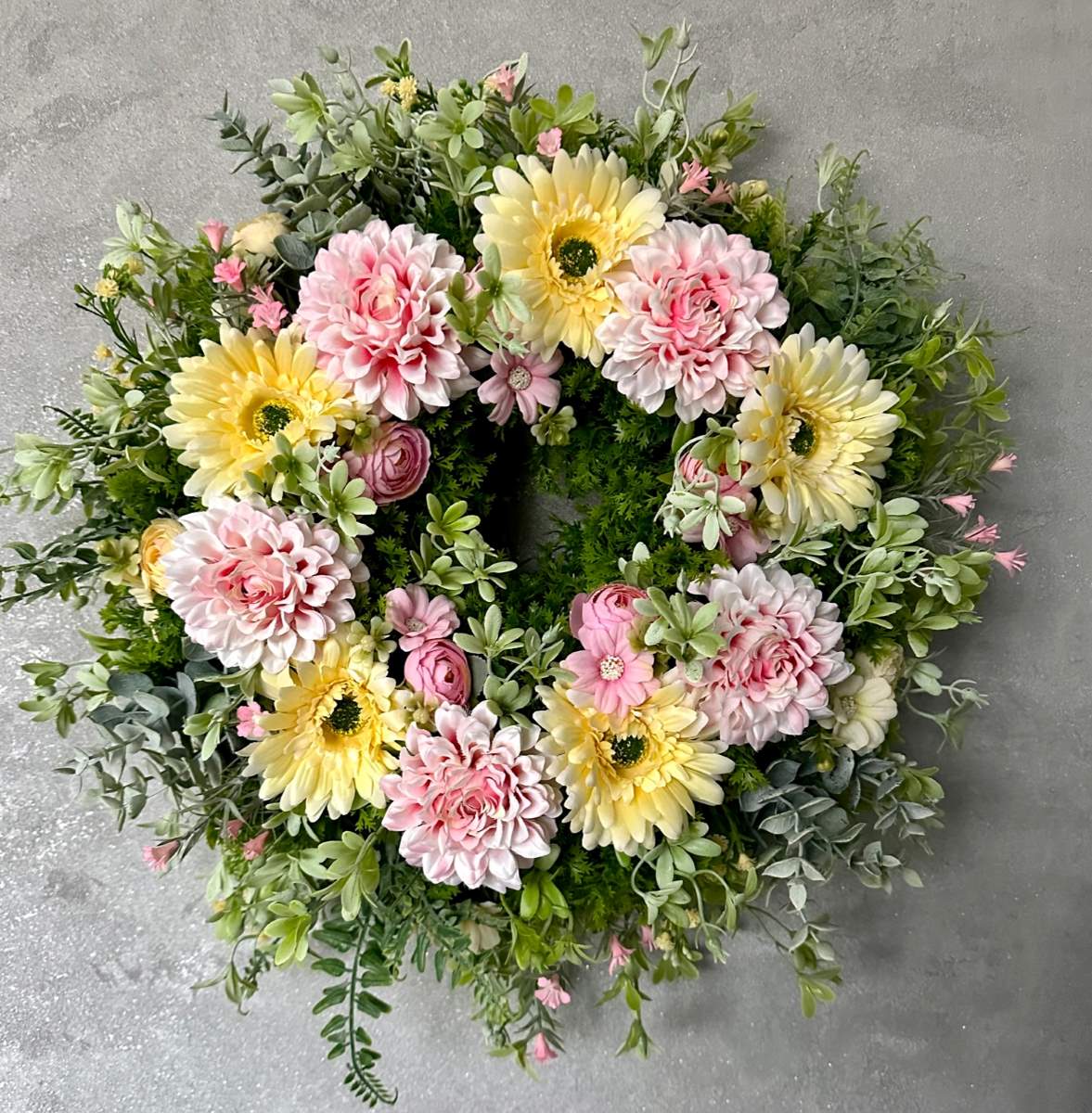 Wianek na drzwi gęsto udekorowany wyselekcjonowanymi sztucznymi kwiatami miedzy innymi dalii, gerbery oraz zielonymi gałązkami. Wianek trwały przeznaczony do użytku przez kilka lat.
