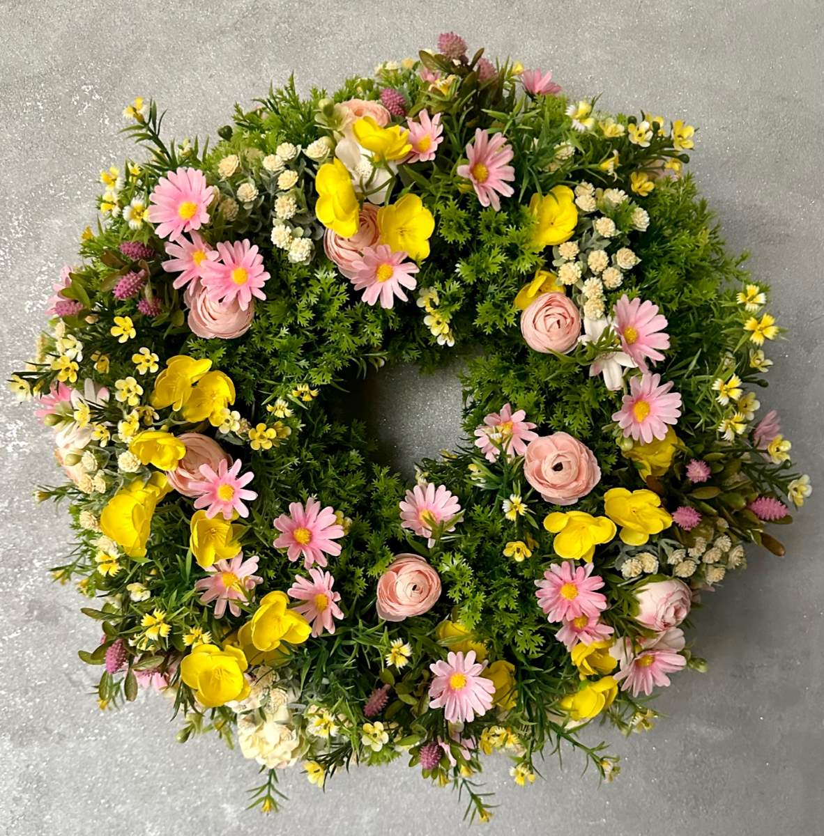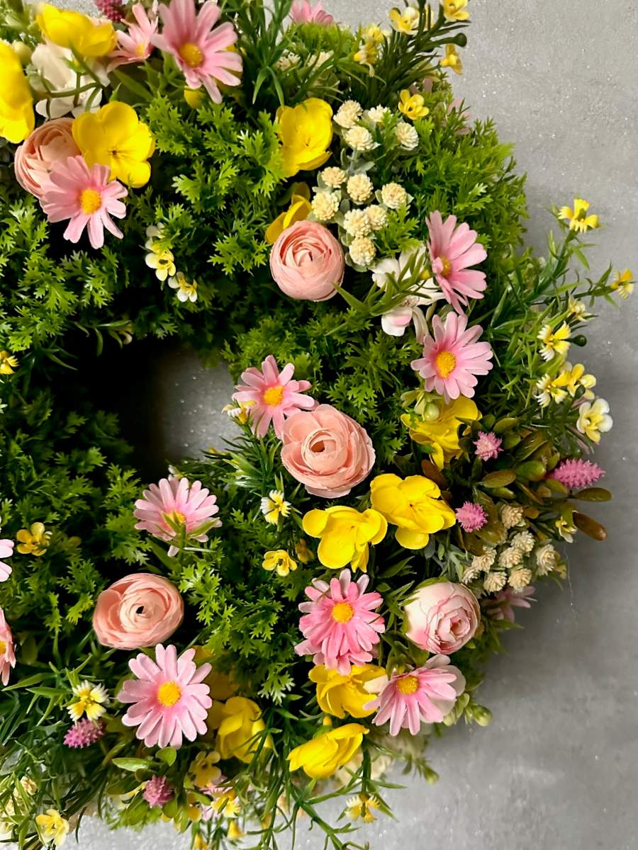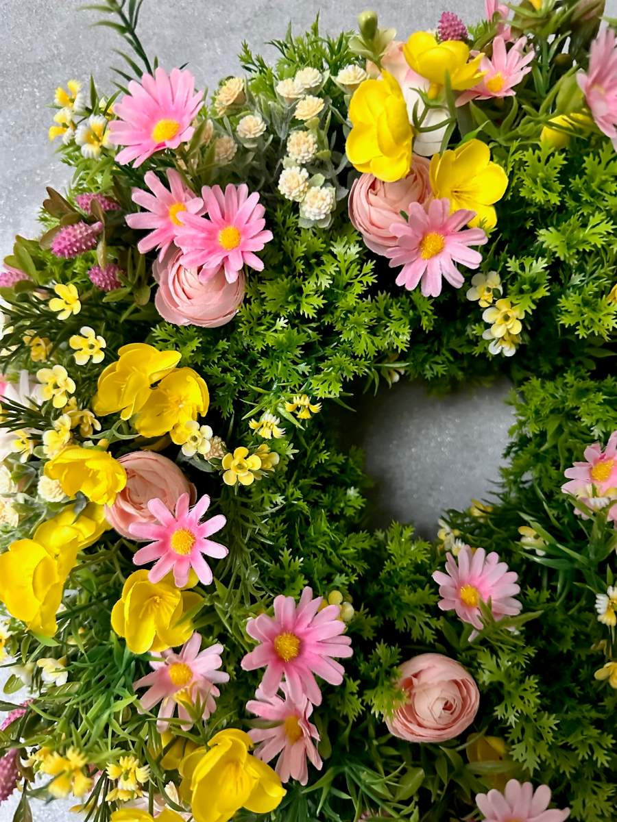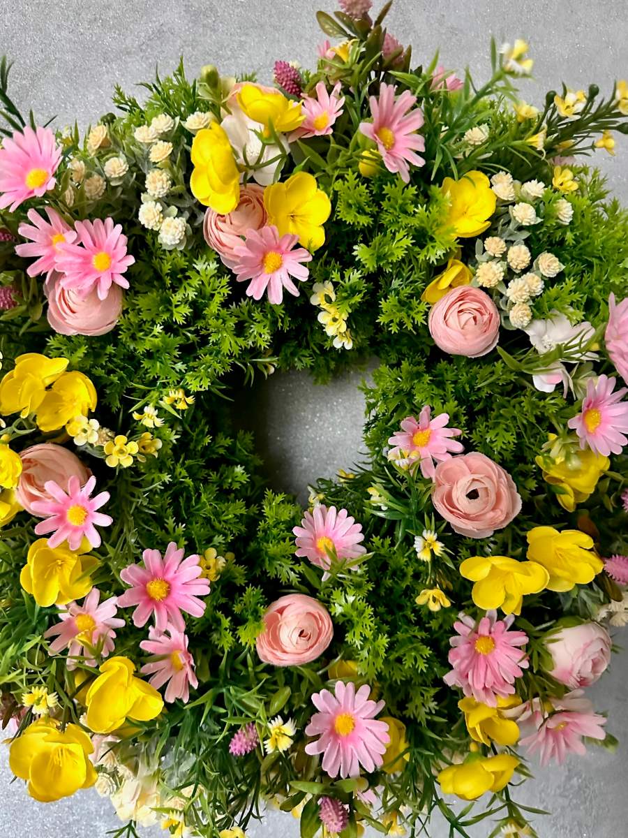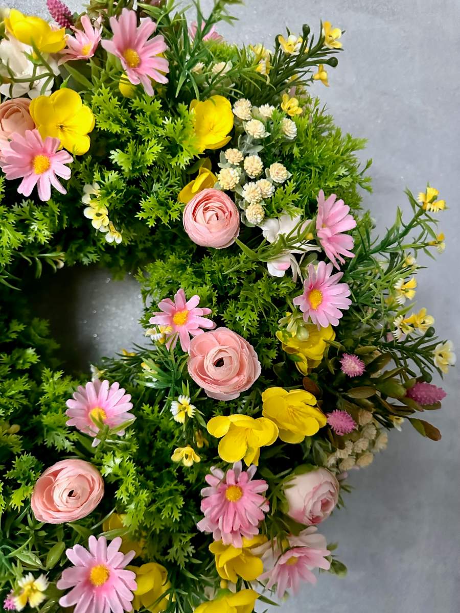 Wianek na drzwi gęsto udekorowany wyselekcjonowanymi sztucznymi kwiatami . Wianek trwały przeznaczony do użytku przez kilka lat.