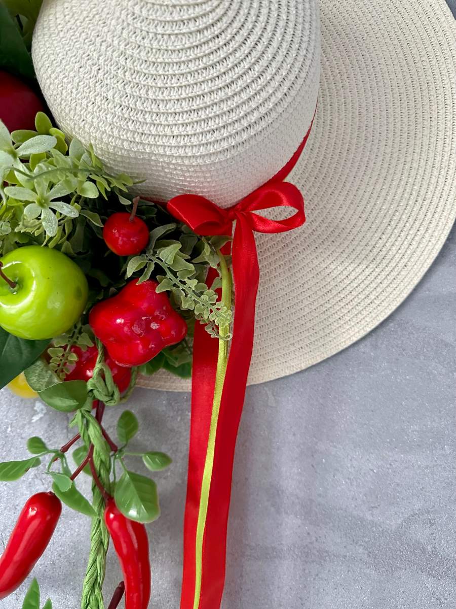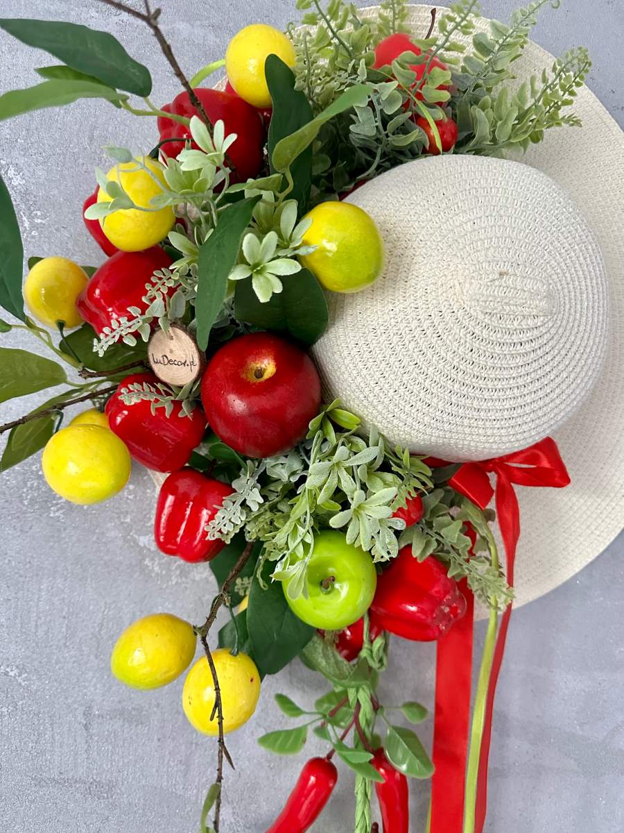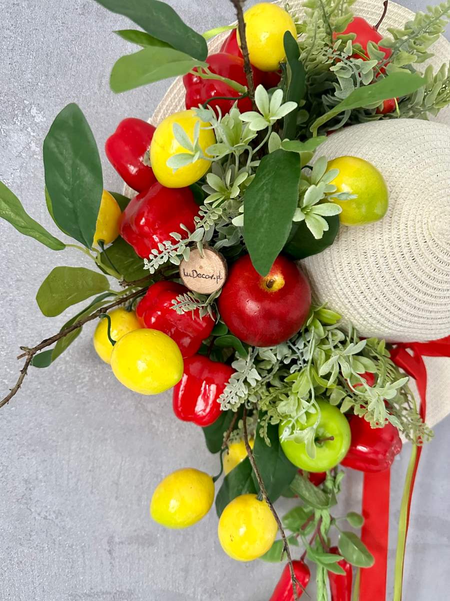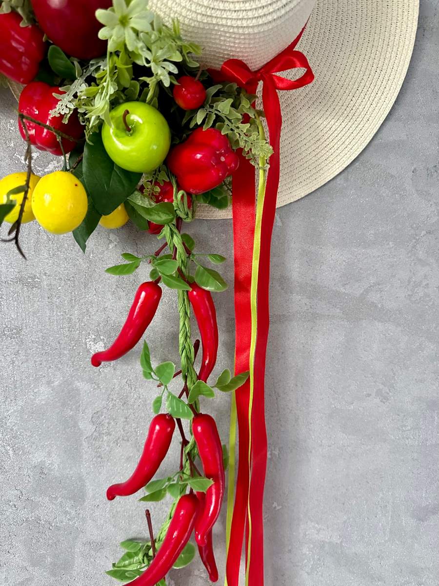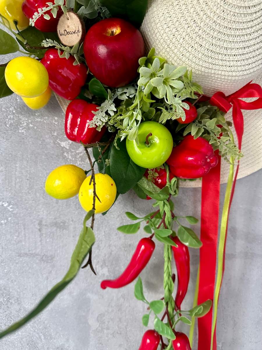 Wyjątkowy wianek stworzony na letnim kapeluszu , przewiązany wstążkami. Wianek udekorowany paprykami, jabłkami, cytrynami w pięknych soczystych kolorach oraz zielonymi gałązkami.