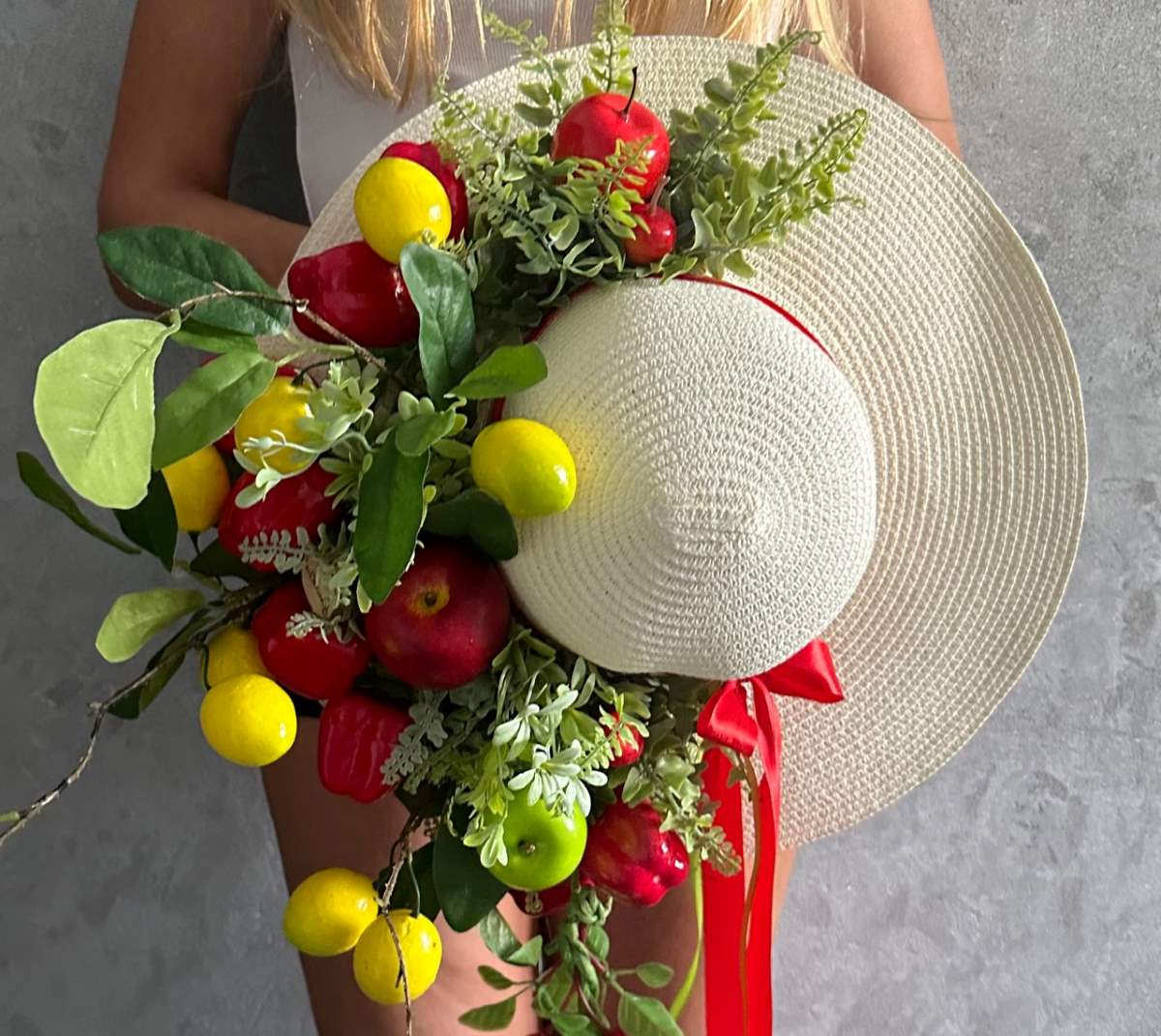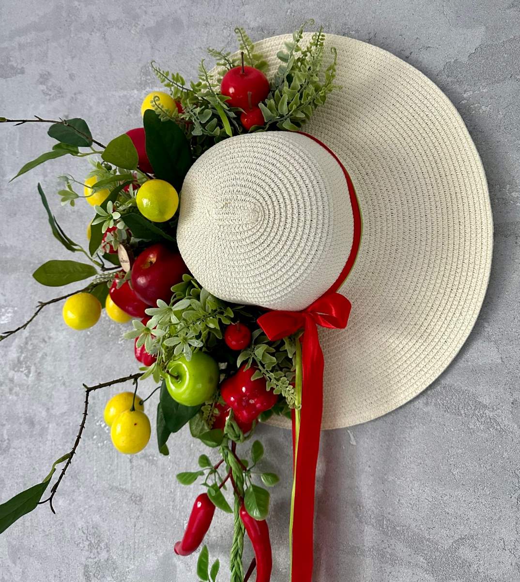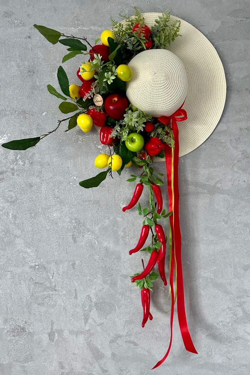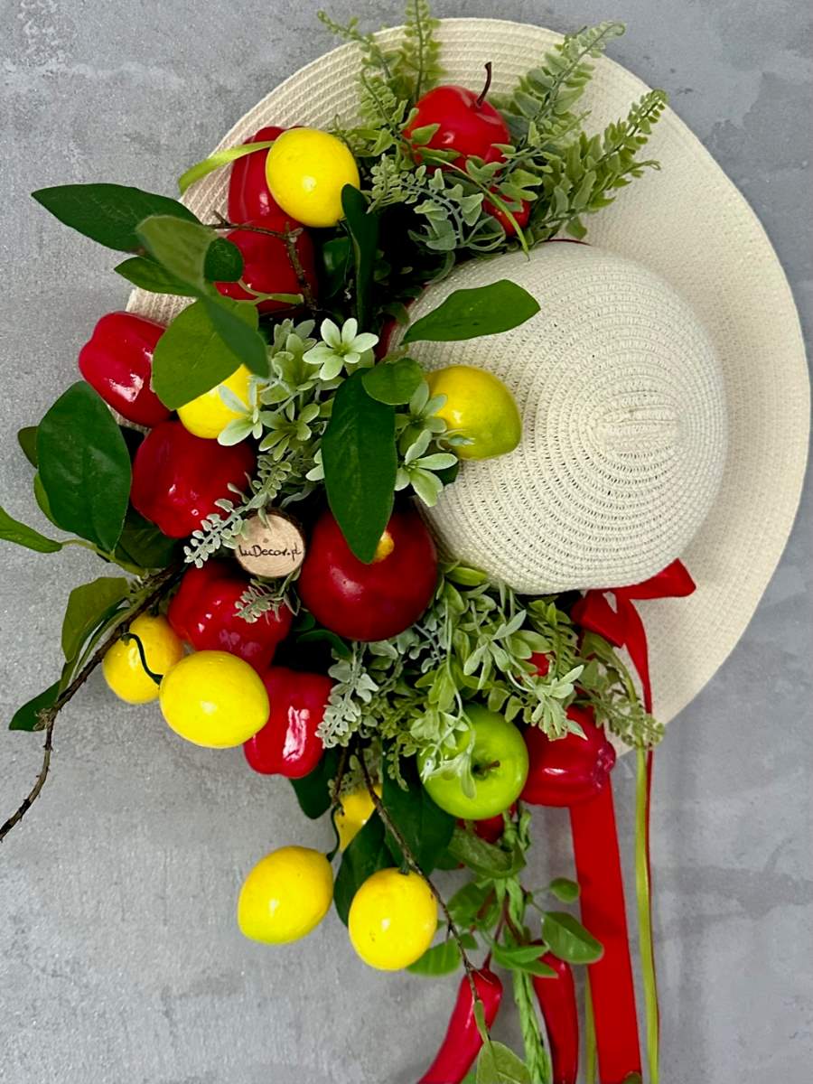 Wyjątkowy wianek stworzony na letnim kapeluszu , przewiązany wstążkami. Wianek udekorowany paprykami, jabłkami, cytrynami w pięknych soczystych kolorach oraz zielonymi gałązkami.