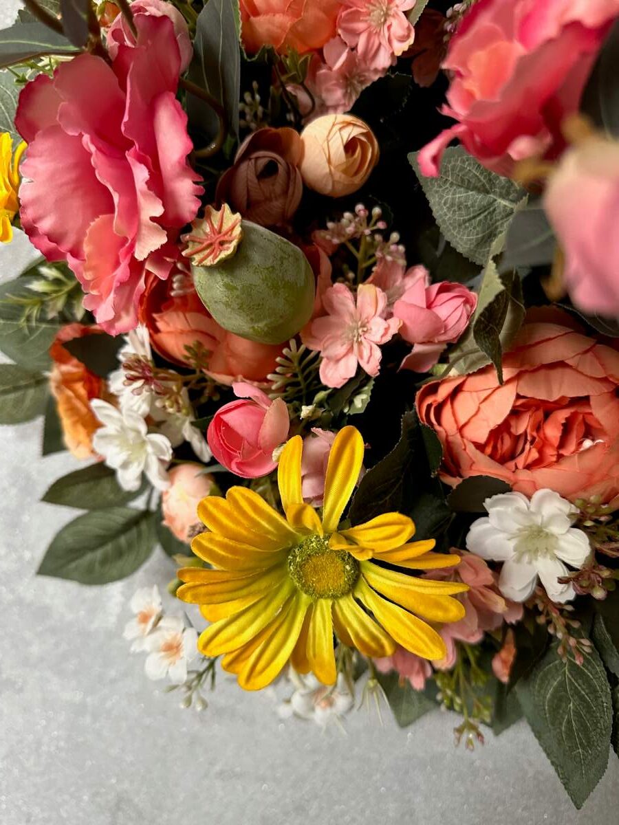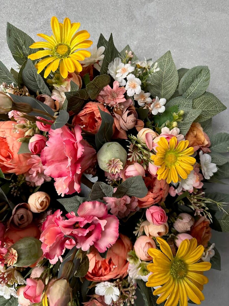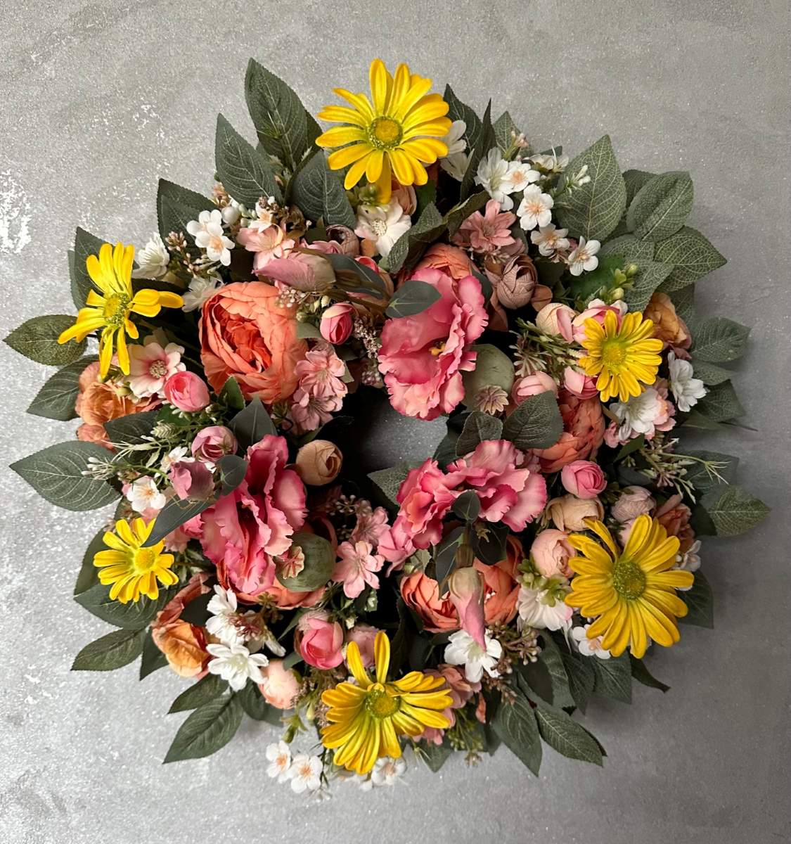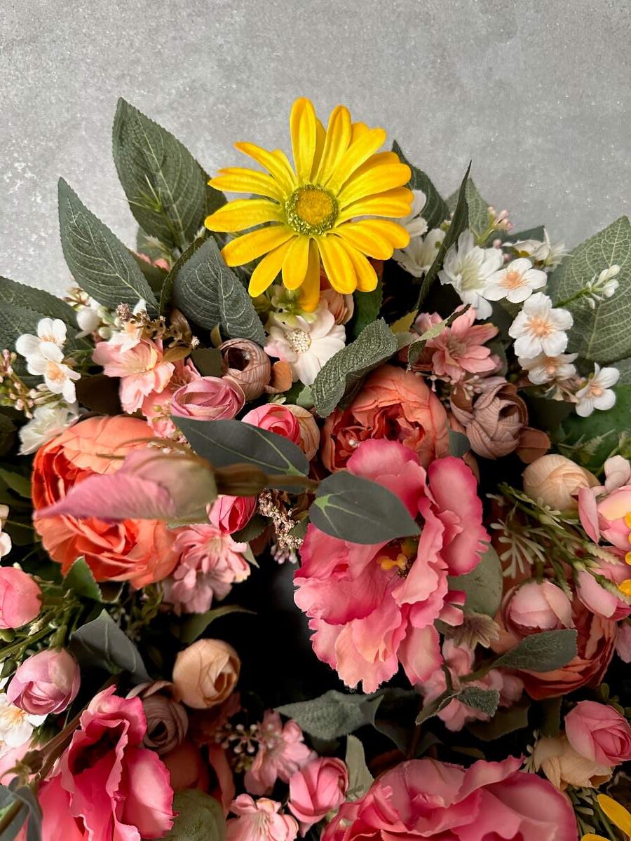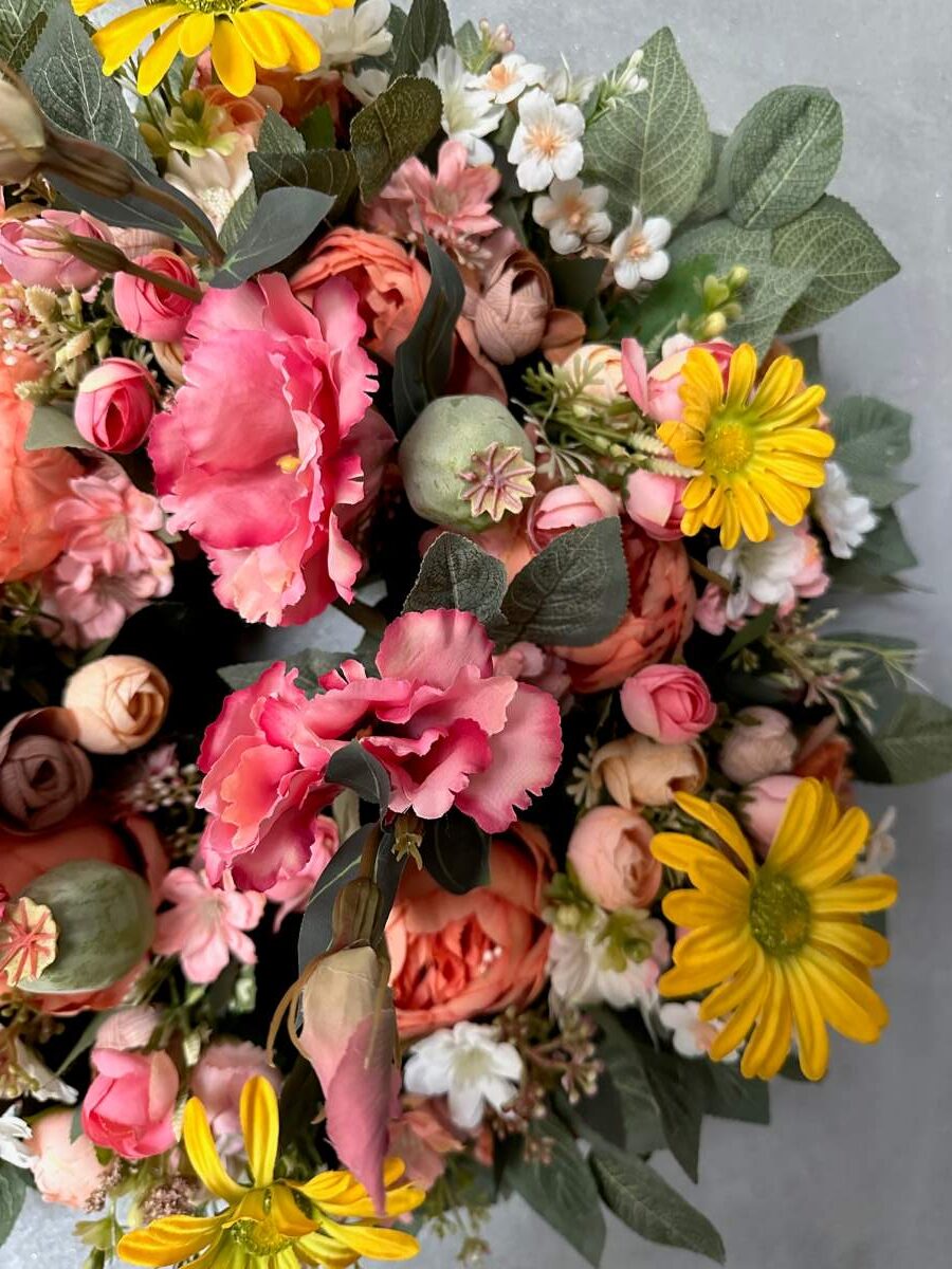 A charming wreath with lots of flowers immersed in greenery. A wreath made in our studio from high-quality artificial flowers. The composition is durable and consistent in color.