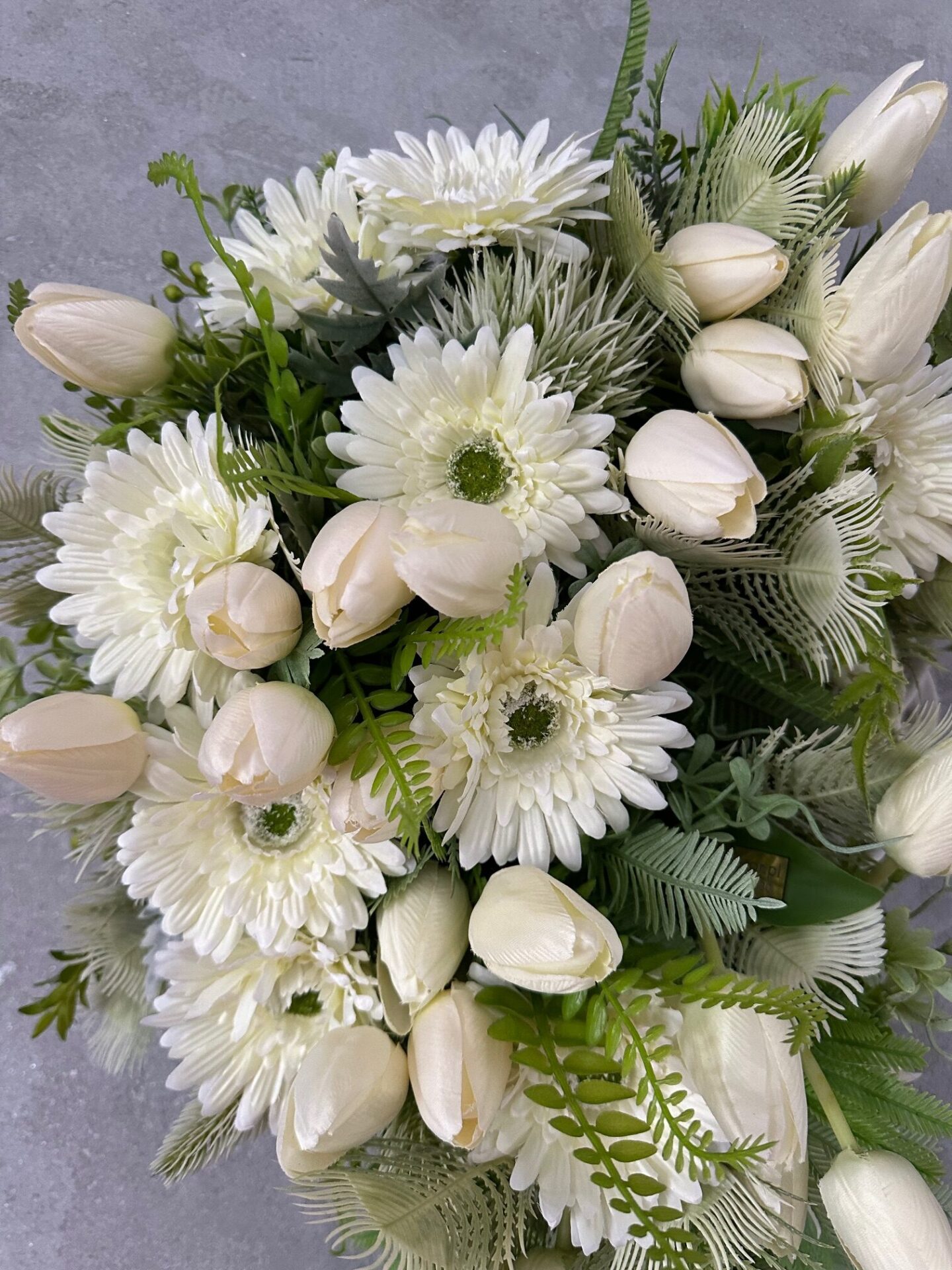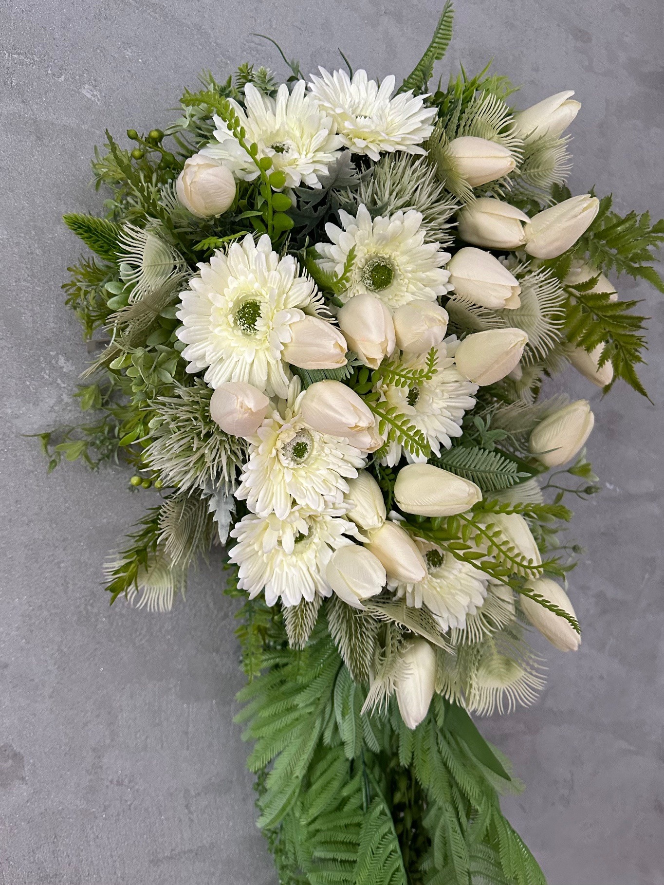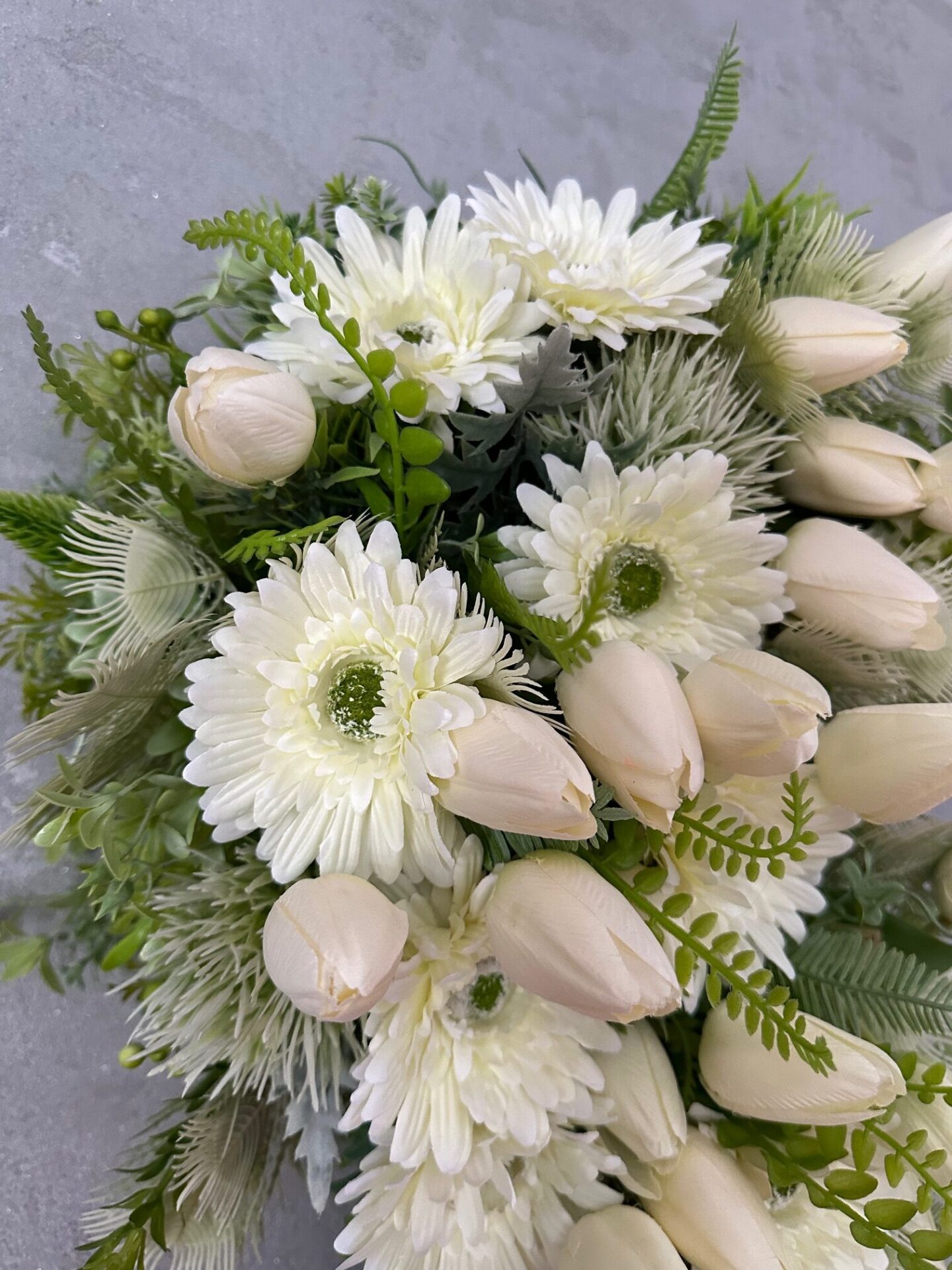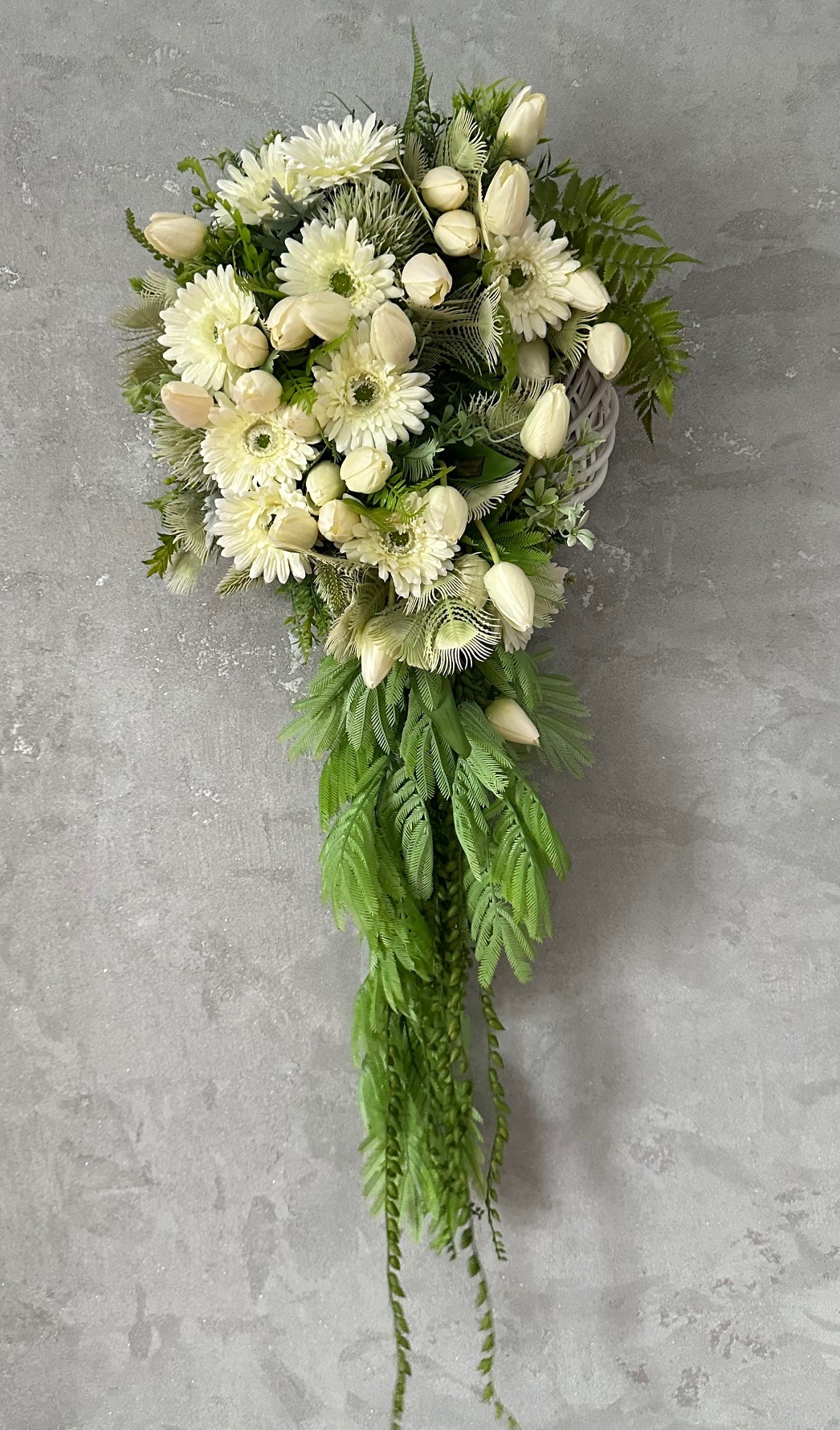 Kwiatowy wianek na drzwi z tulipanami, gerberami oraz zielonymi gałązkami to elegancka i romantyczna dekoracja . Wianek wykonany jest z kwiatów w odcieniach kremu , które pięknie kontrastują z zielenią gałązek. Idealny na wiosnę, lato lub jako całoroczna ozdoba, podkreślająca przytulny i gościnny charakter domu.