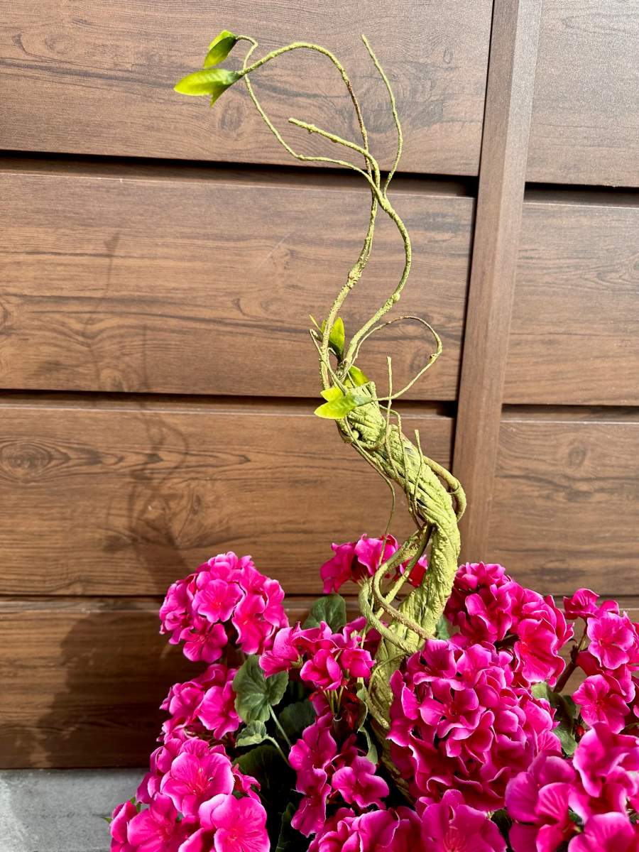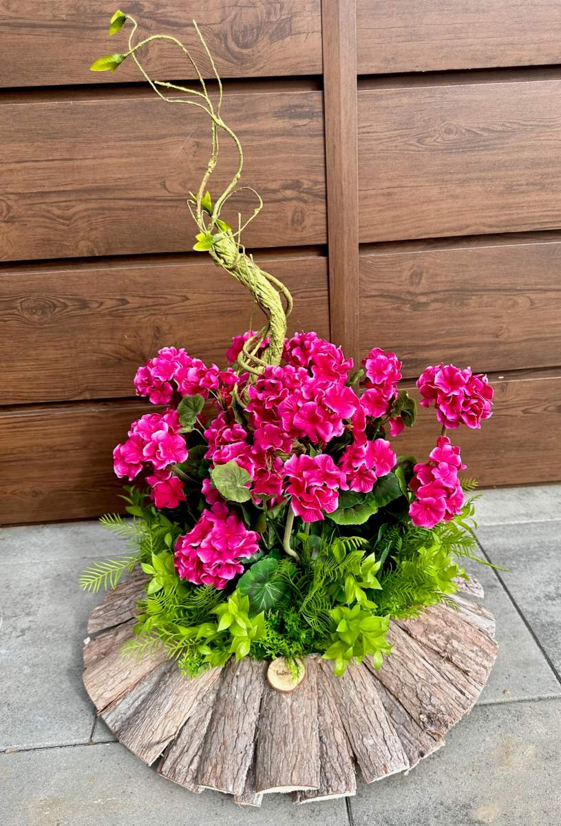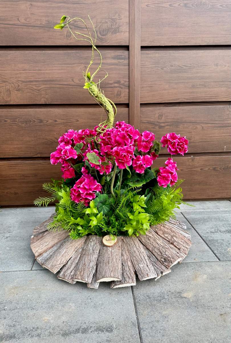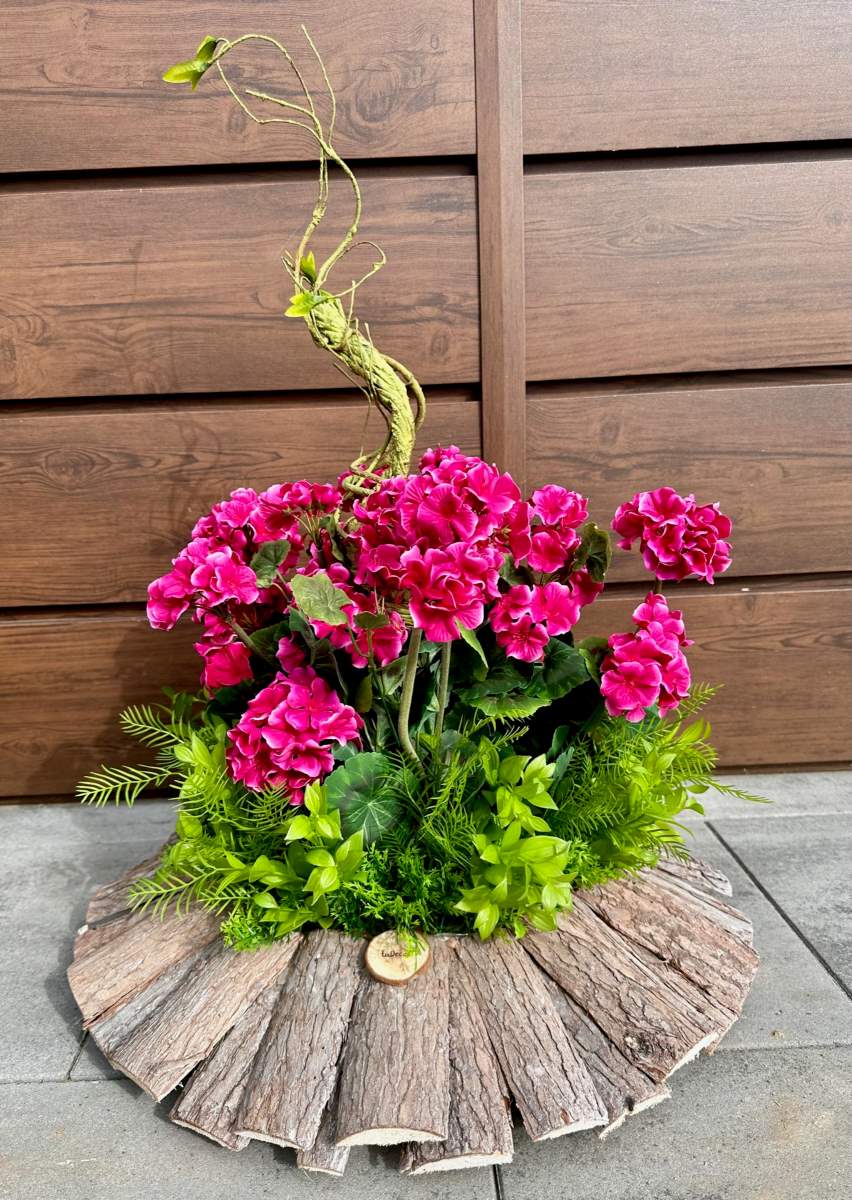Efektowna nowoczesna dekoracja wykonana w ciekawej drewnianej donicy. Kompozycja ozdobiona kwiatami pelargonii i zielonymi gałązkami.